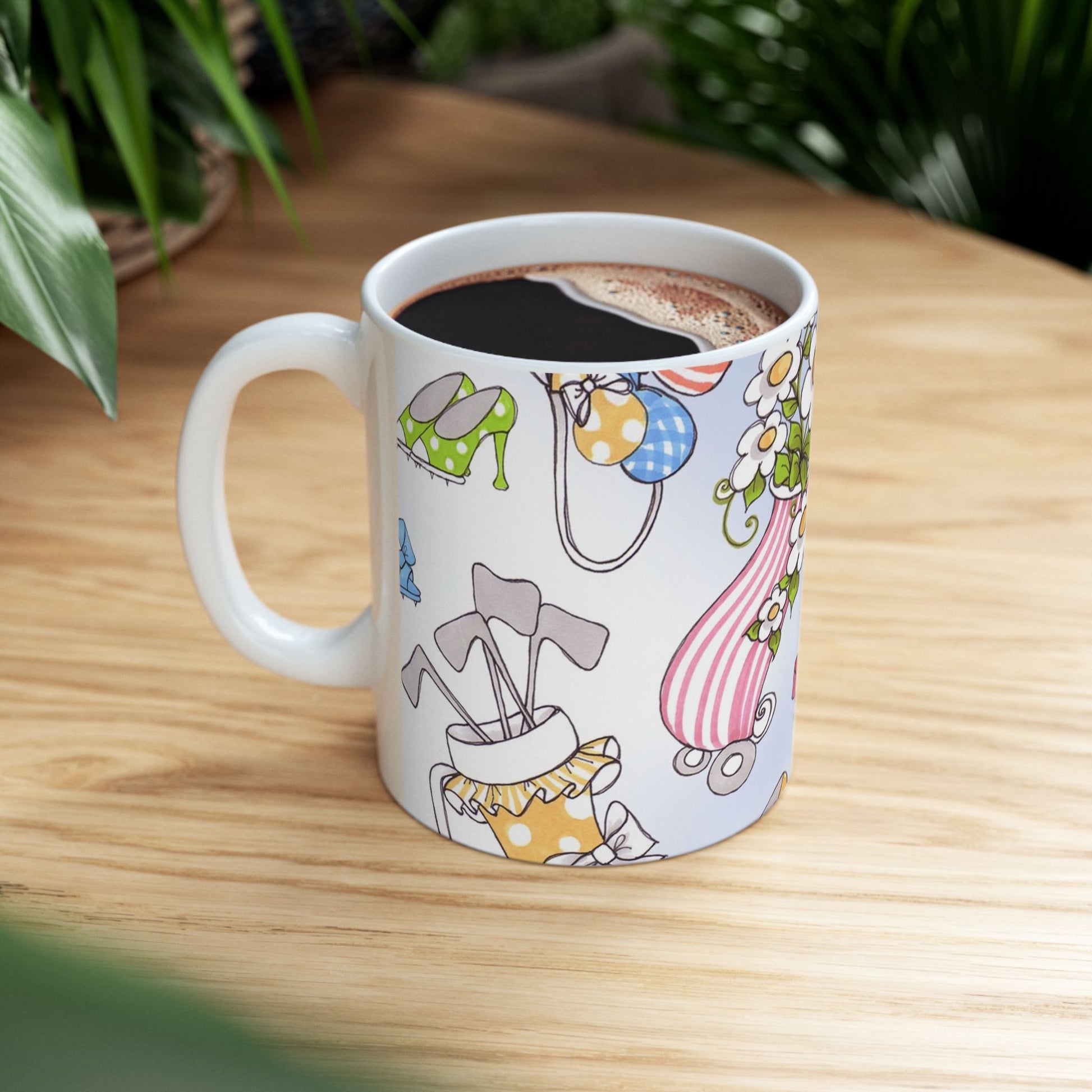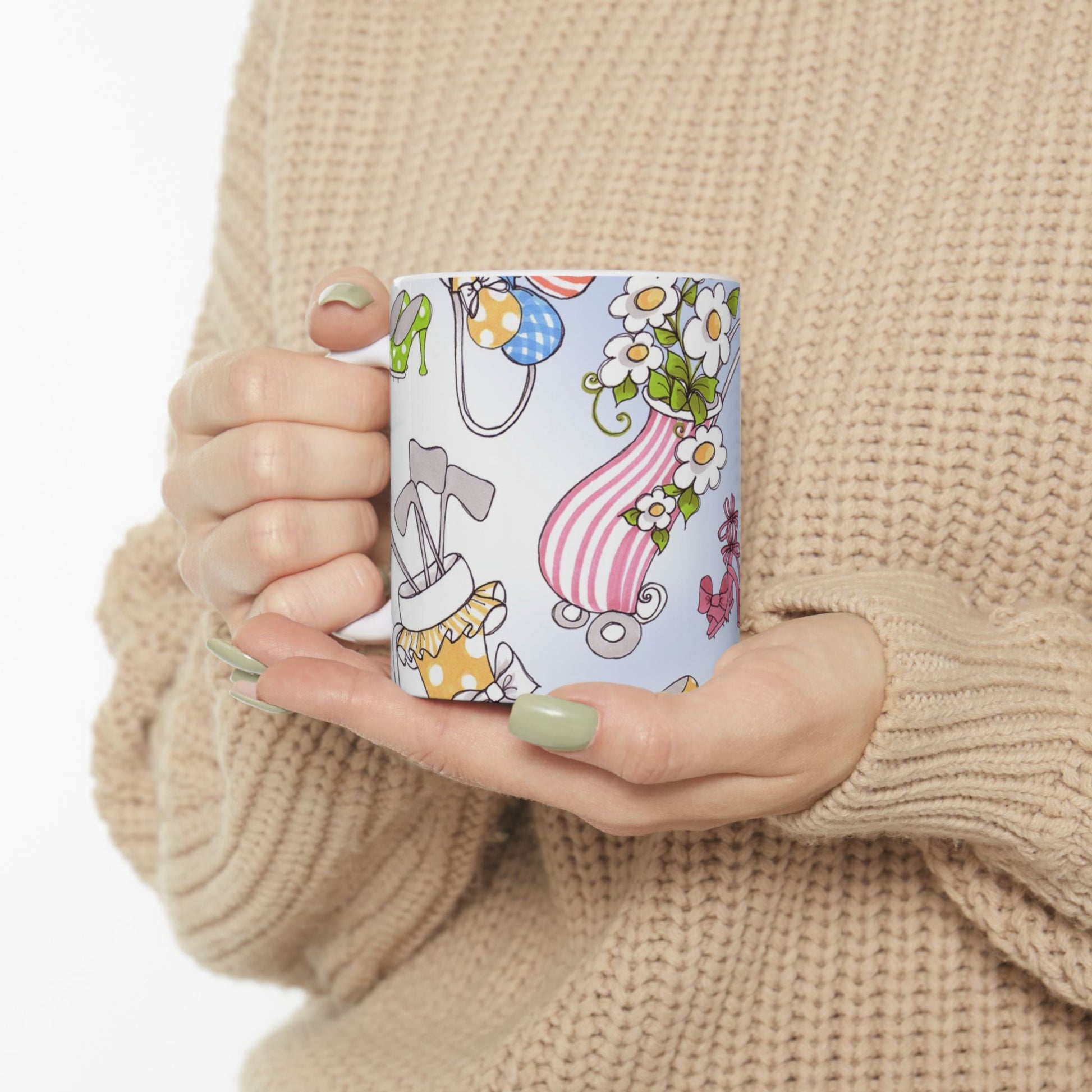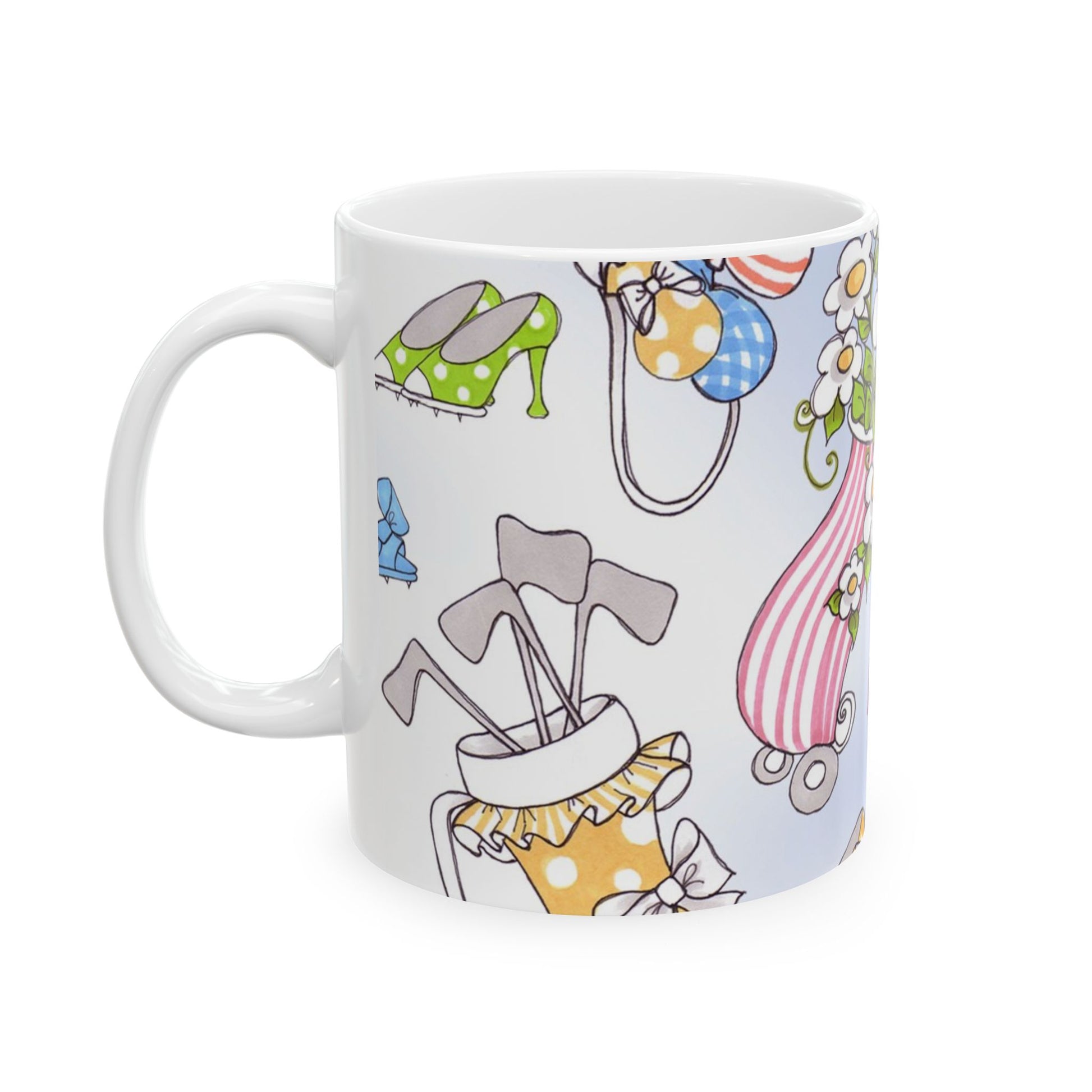White ceramic 11oz mug with fun, colorful, Loralie sewing ladies enjoying each other's quirky company. Every project is more fun with the perfect Sewing Sisters mug! Makes a great gift!