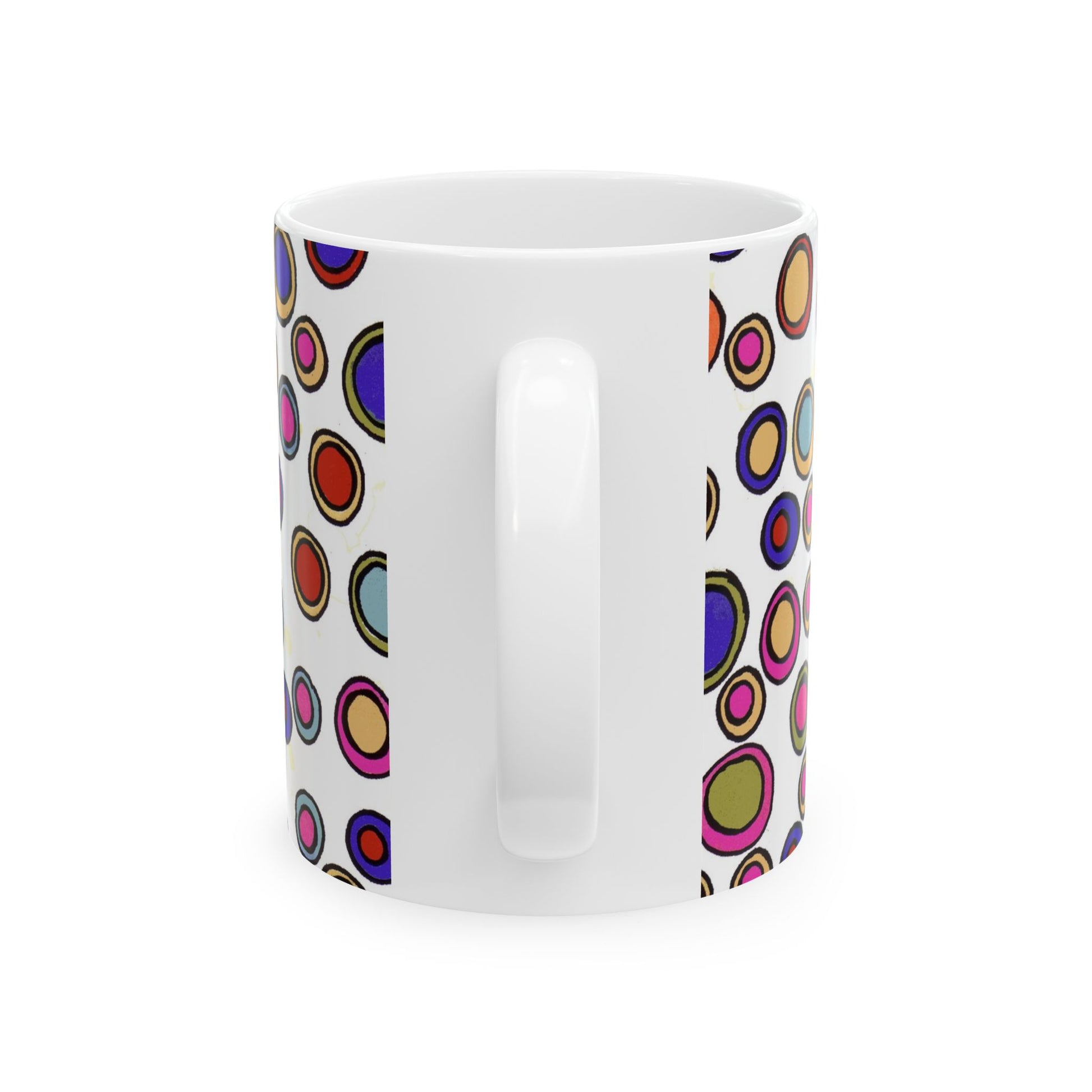 White ceramic 11oz mug with fun, colorful, Loralie sewing ladies enjoying each other's quirky company. Every project is more fun with the perfect Sewing Sisters mug! Makes a great gift!