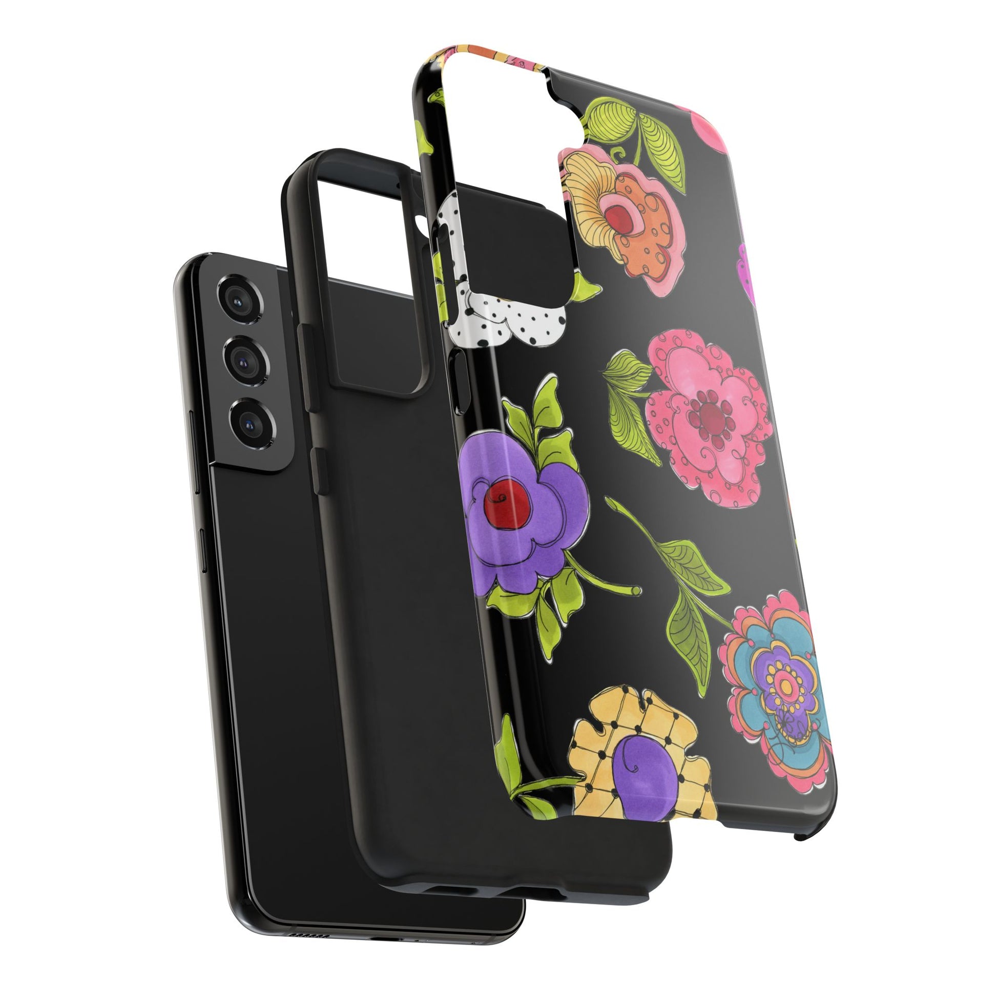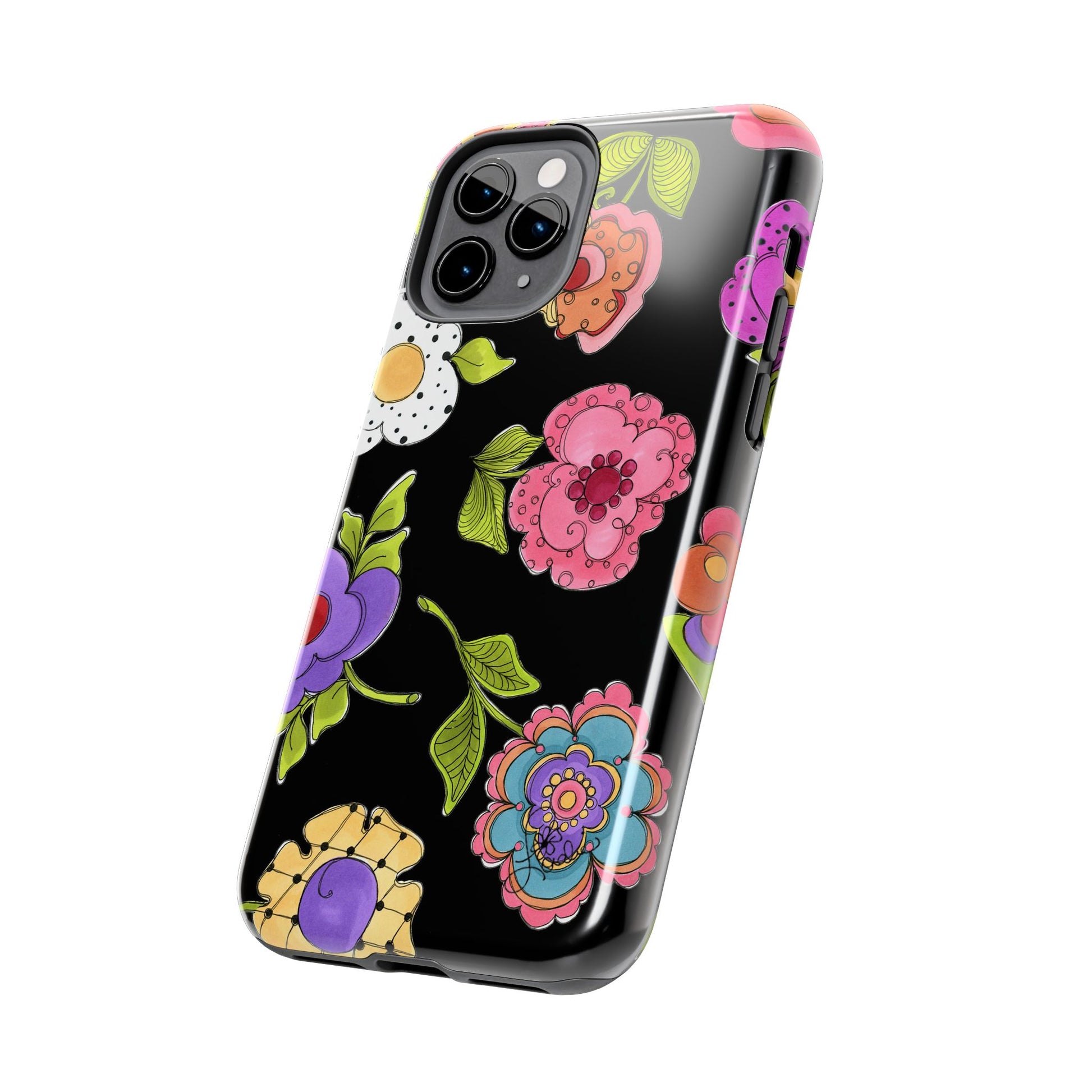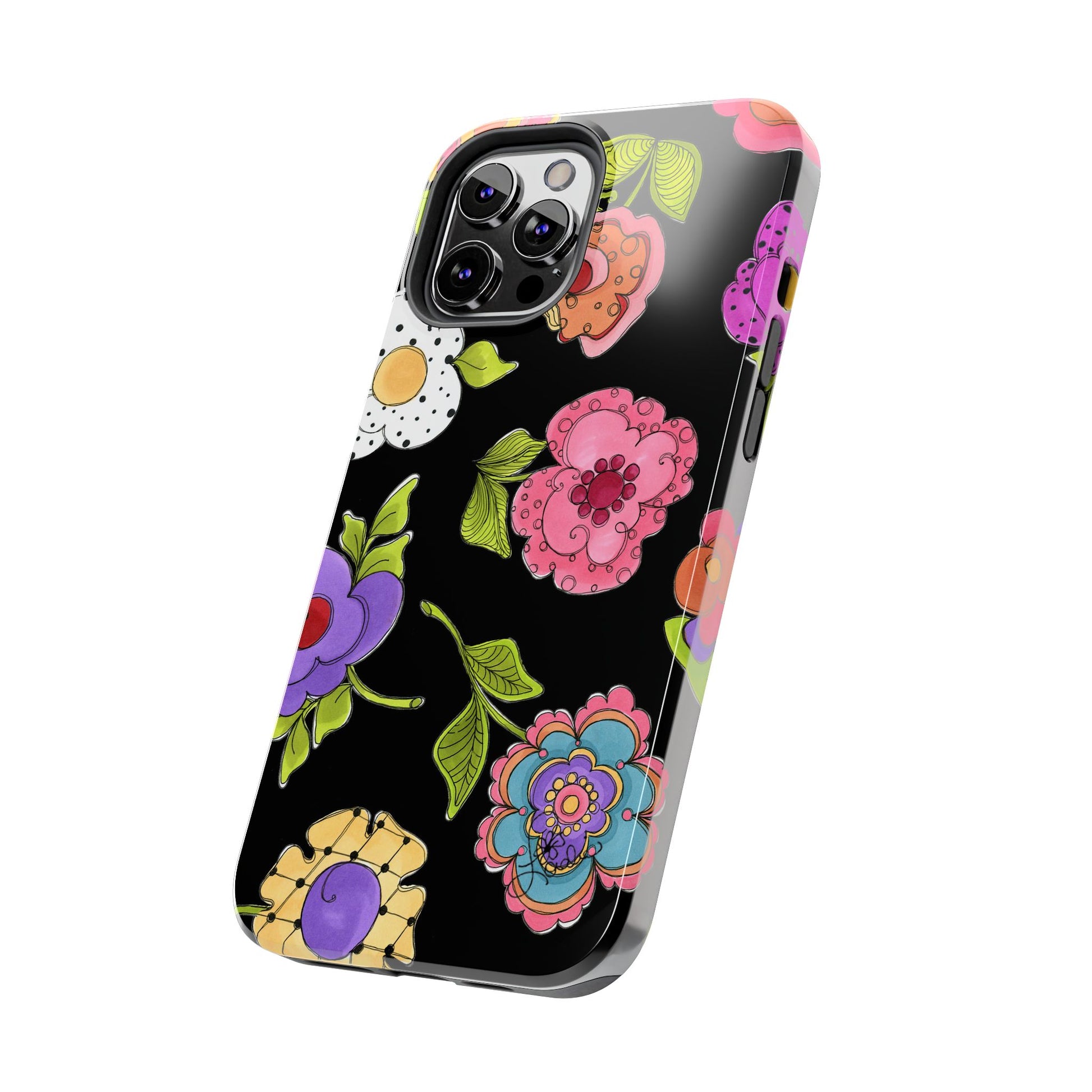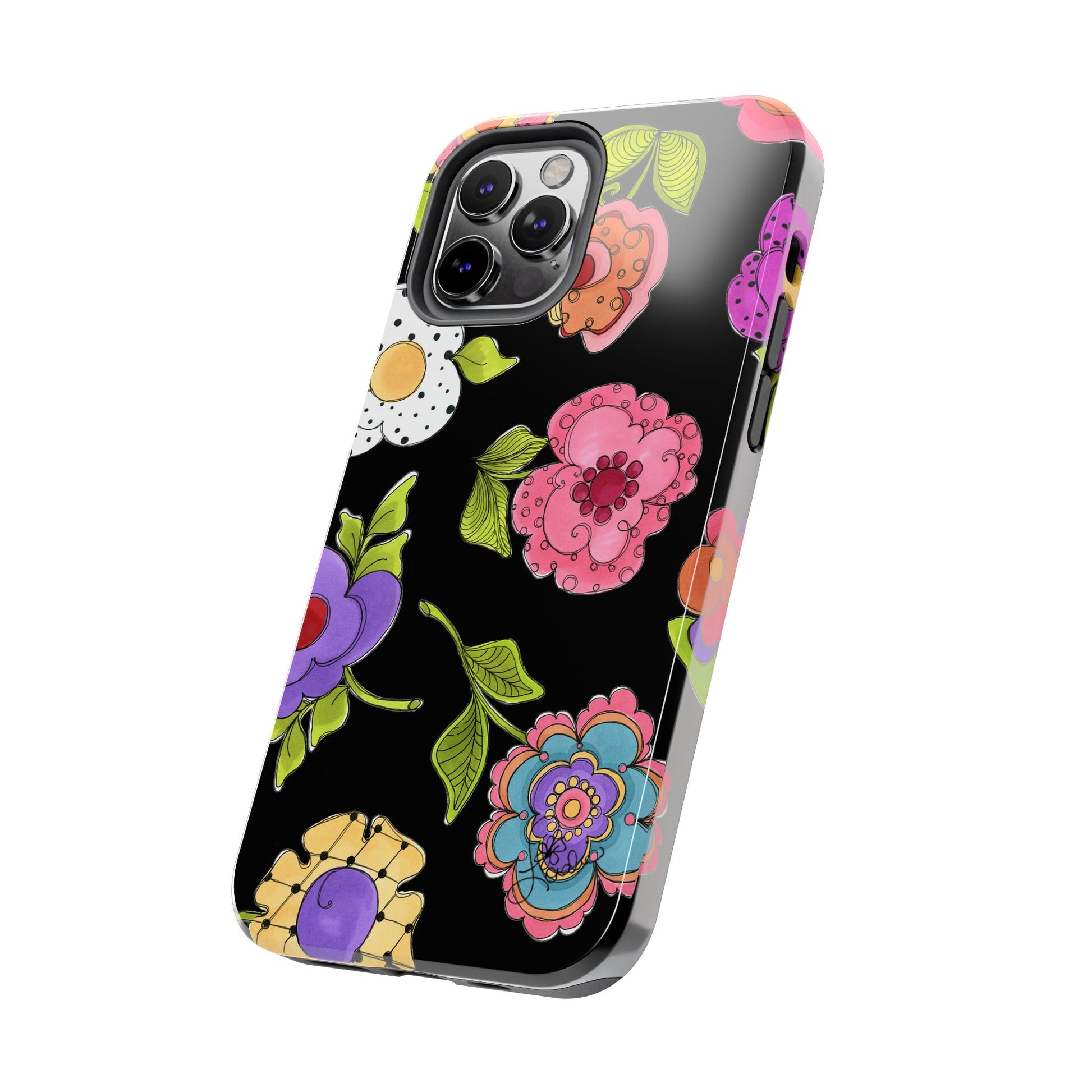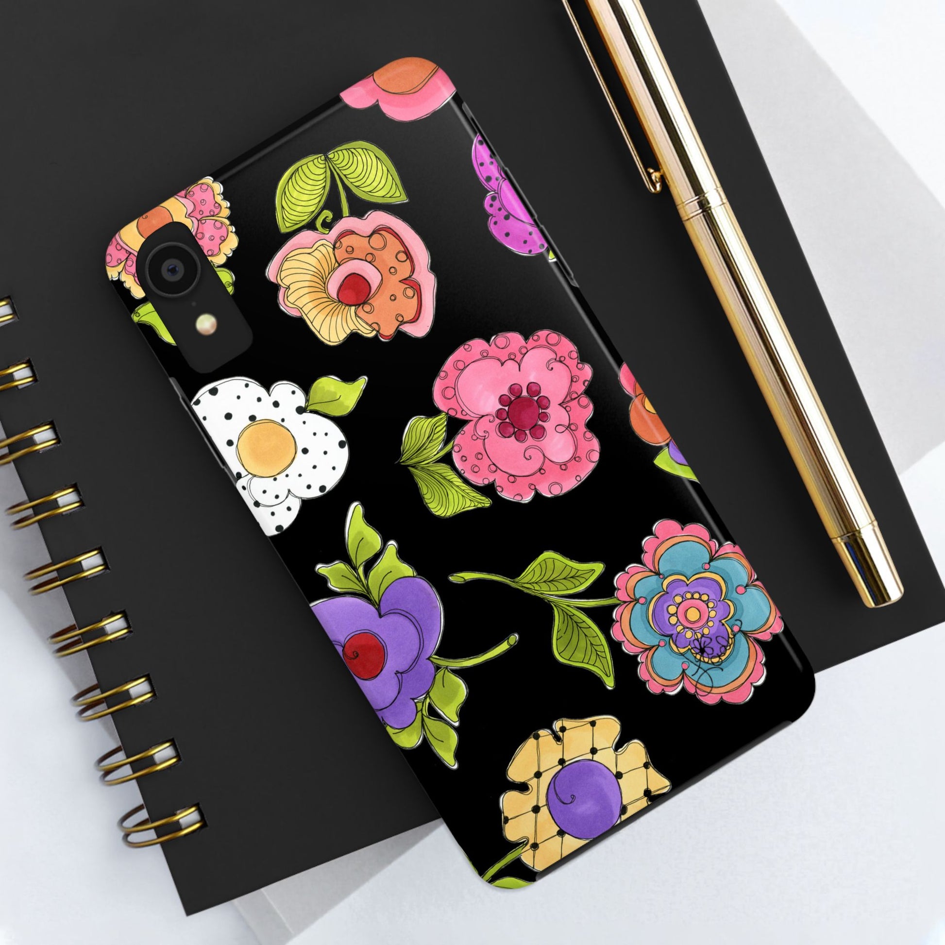 Fanciful flowers float on a deep black background. In and out of your pocket or purse it will add beauty and style to your day.