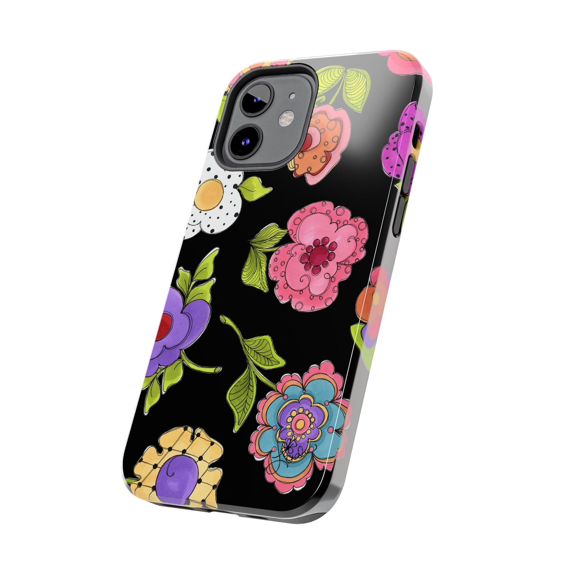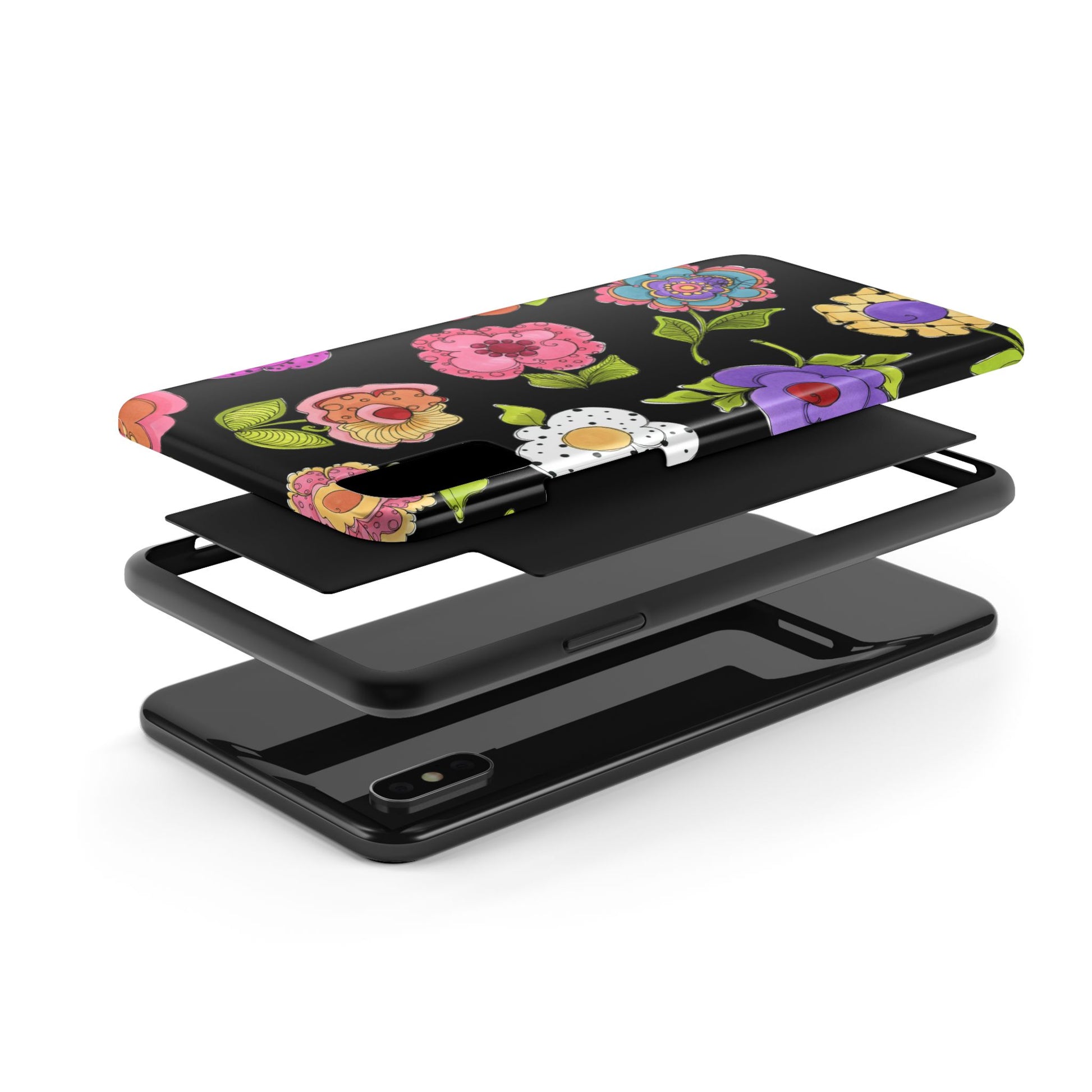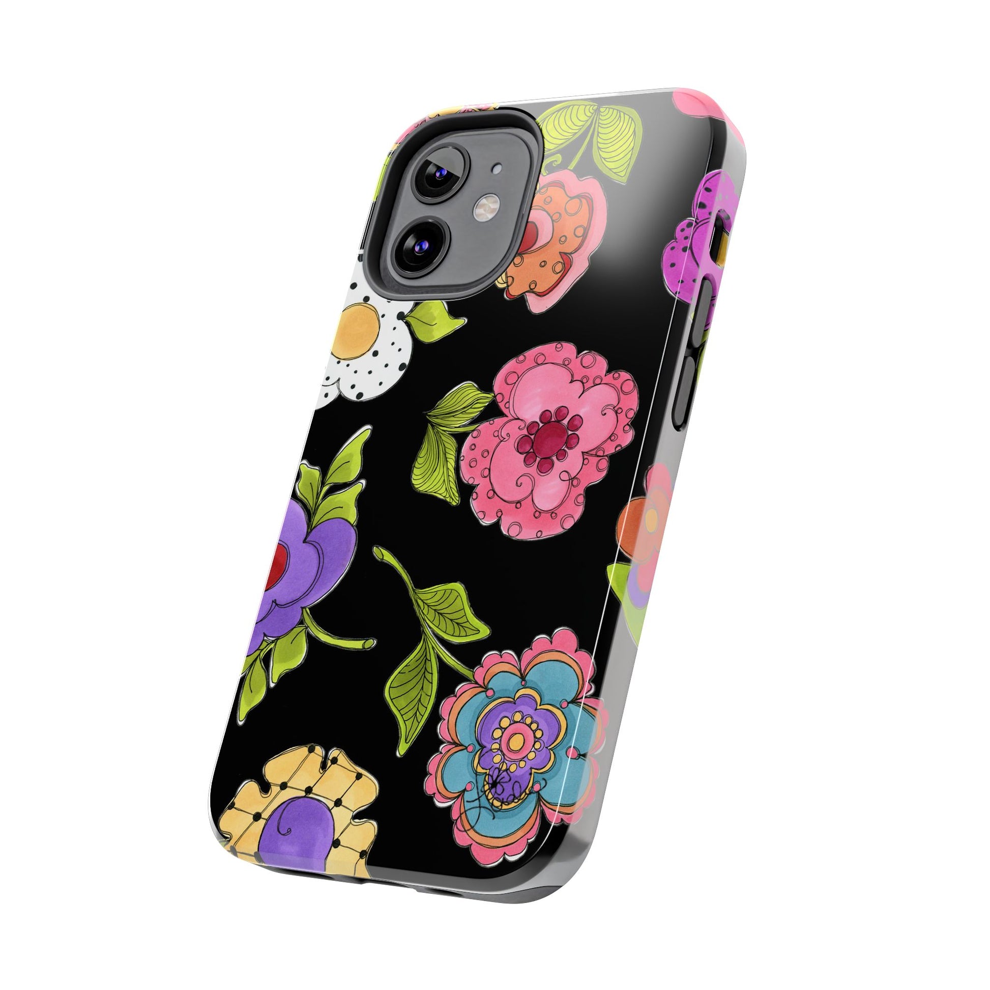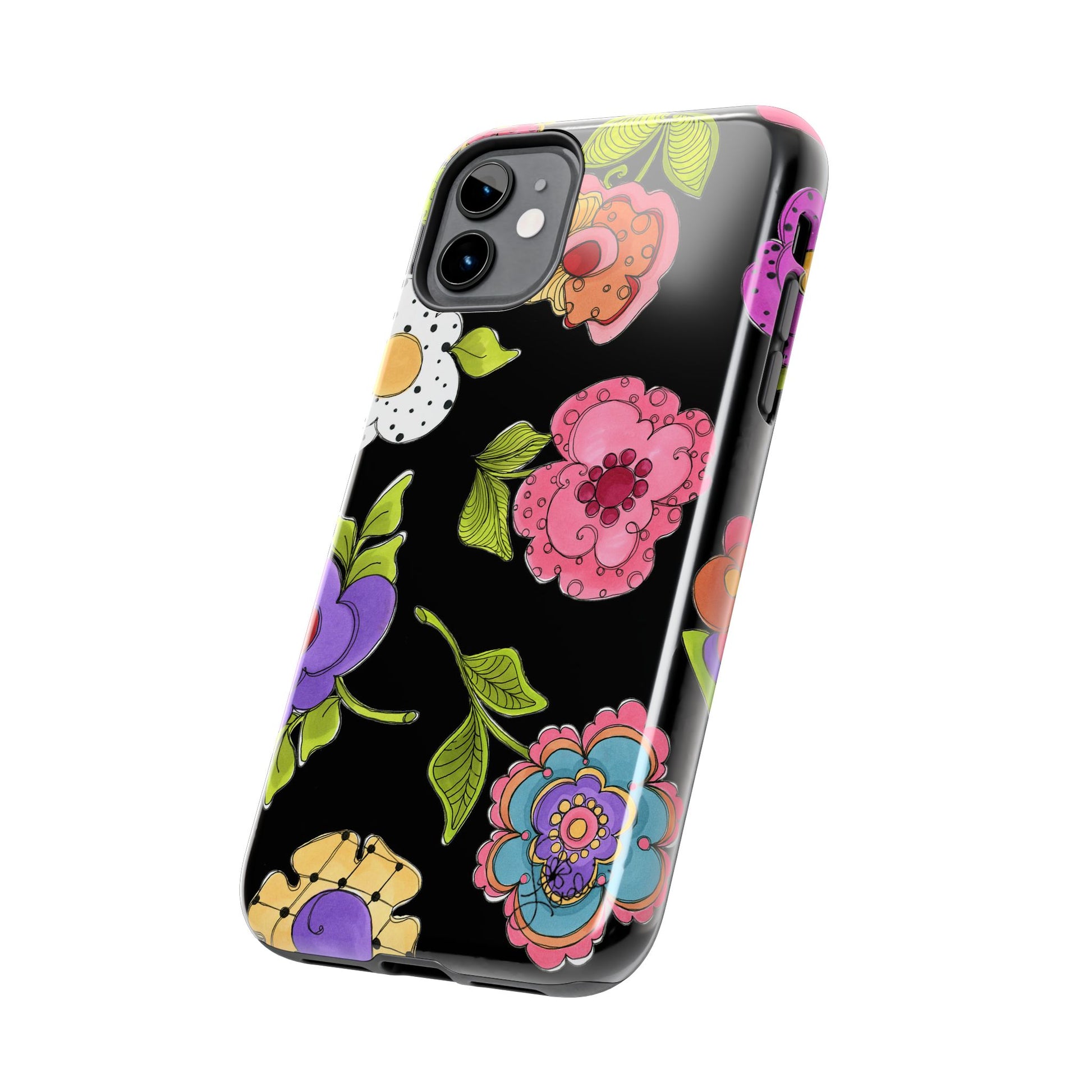 Fanciful flowers float on a deep black background. In and out of your pocket or purse it will add beauty and style to your day.