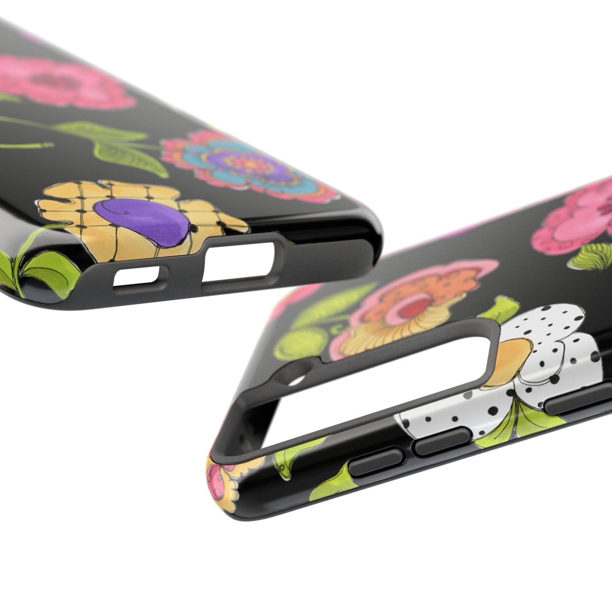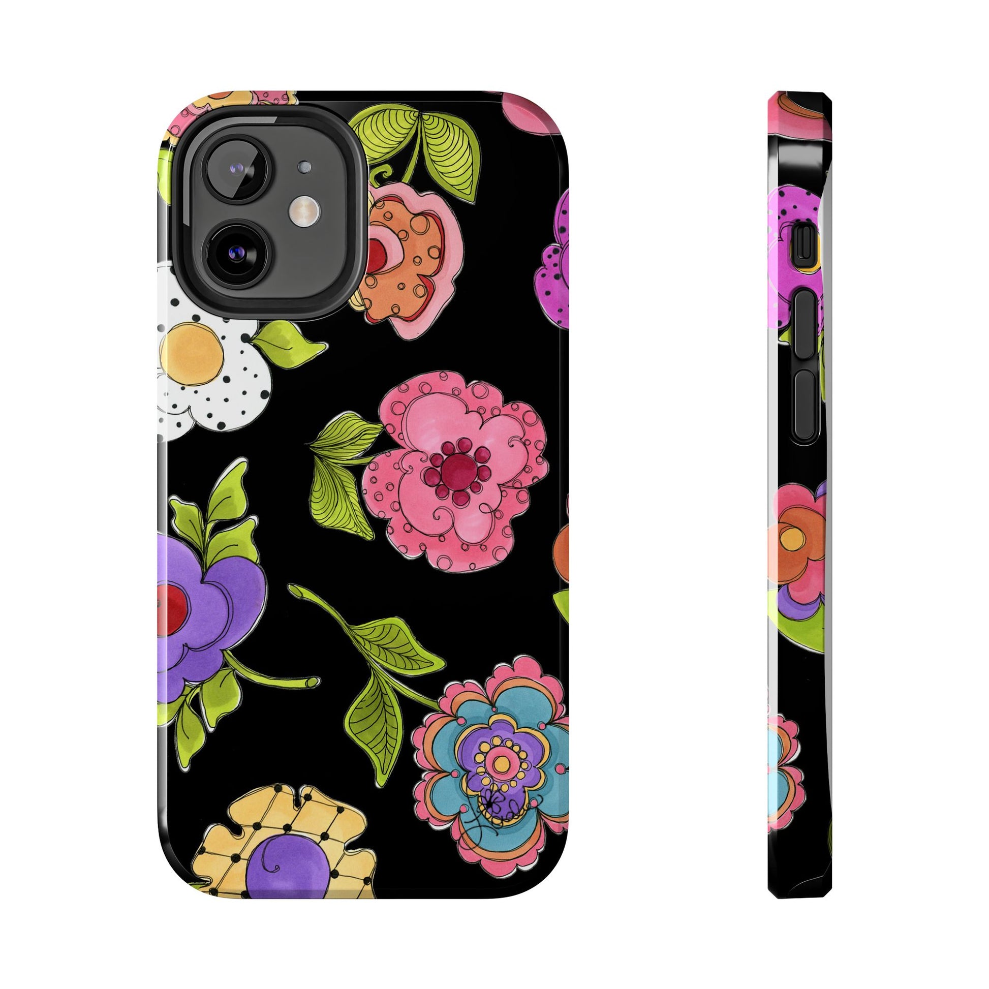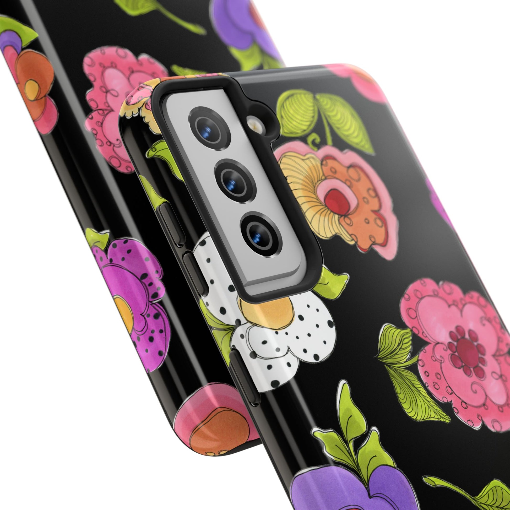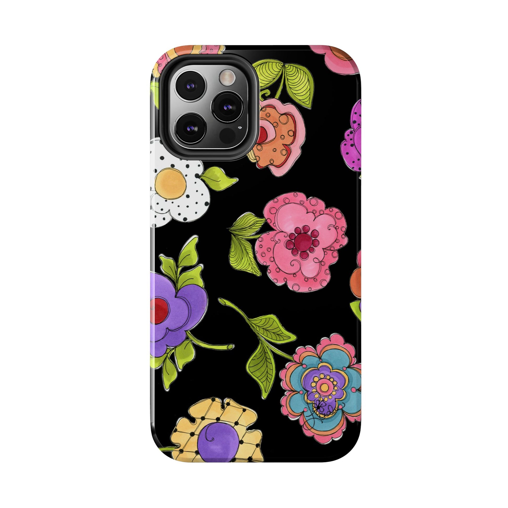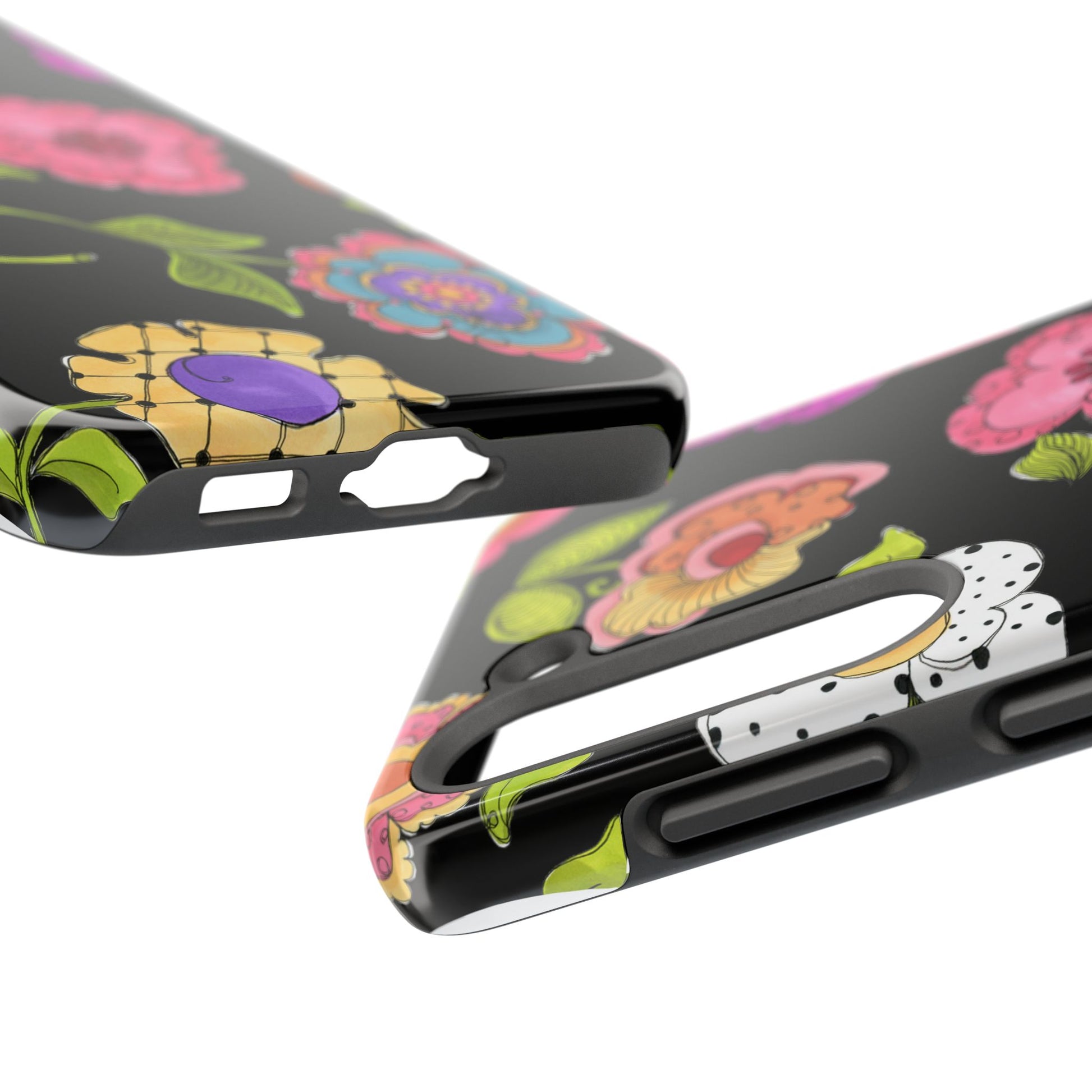 Fanciful flowers float on a deep black background. In and out of your pocket or purse it will add beauty and style to your day.