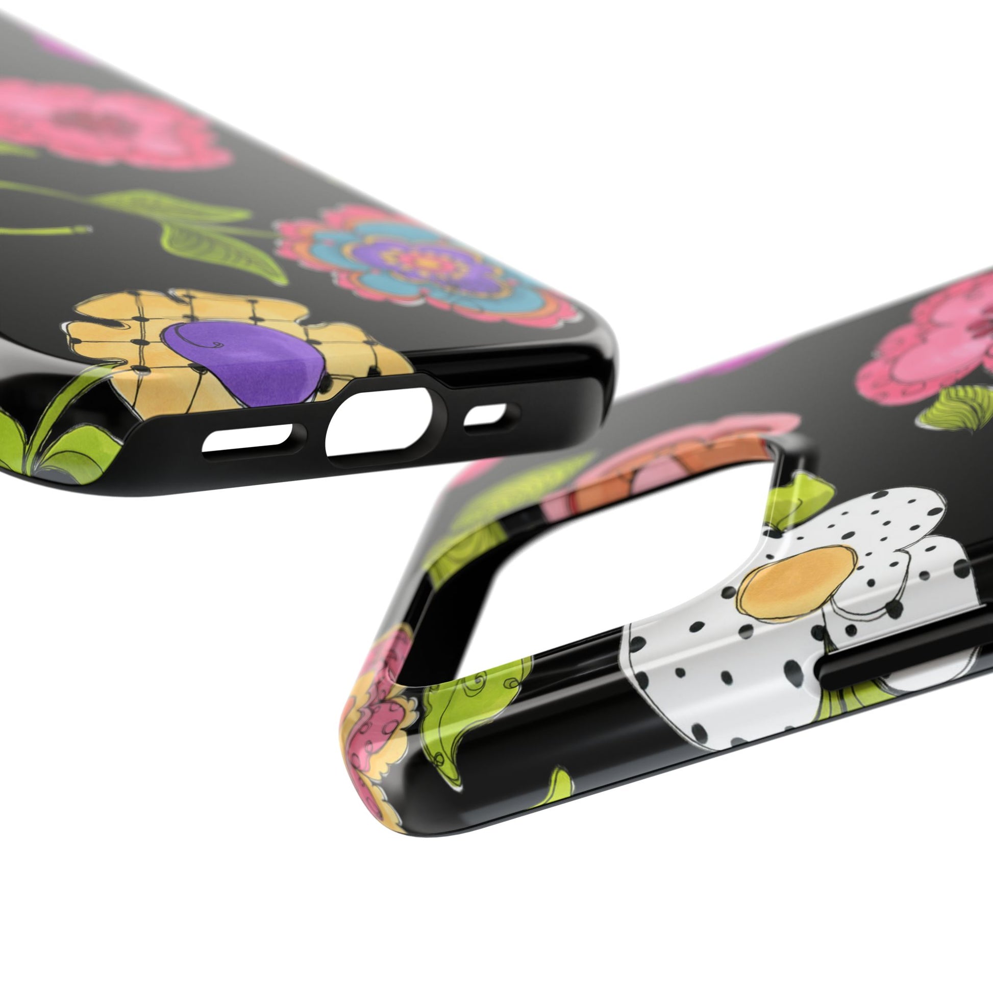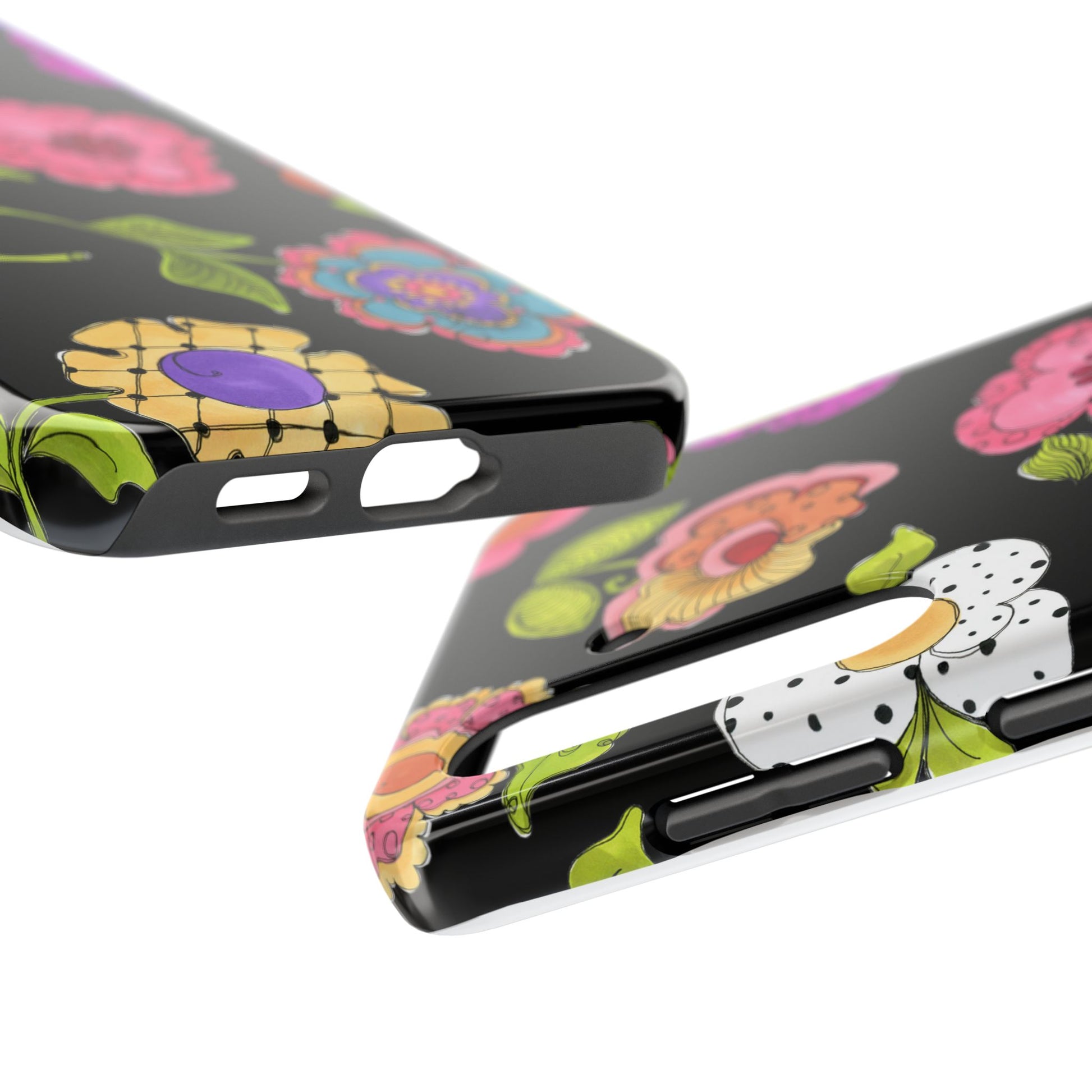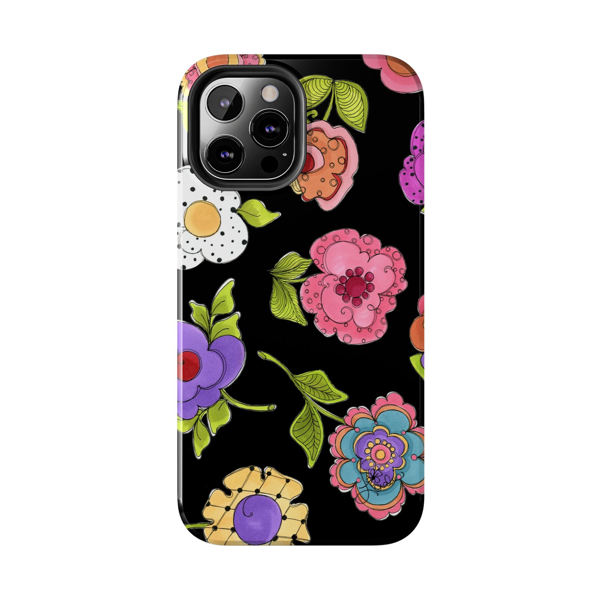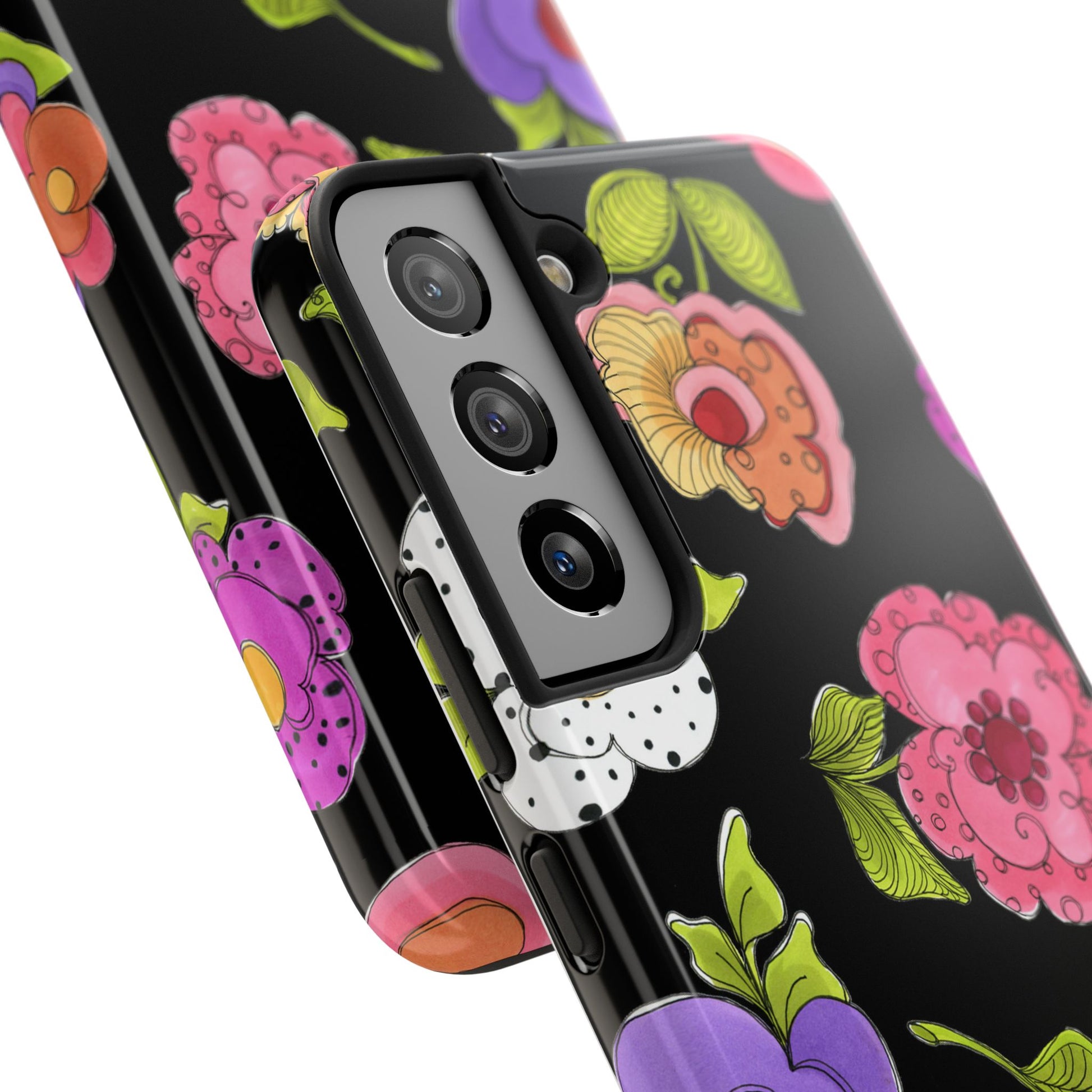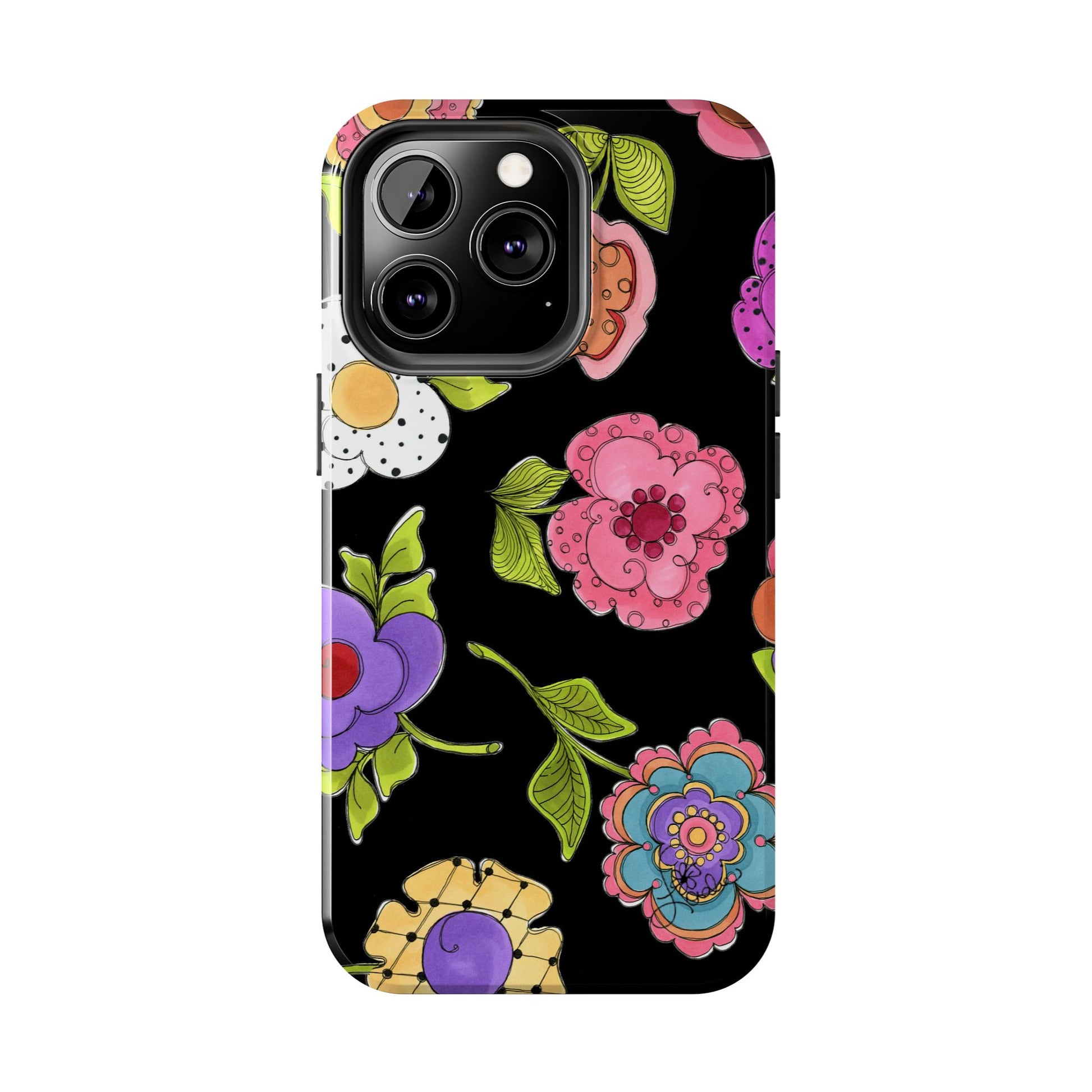 Fanciful flowers float on a deep black background. In and out of your pocket or purse it will add beauty and style to your day.