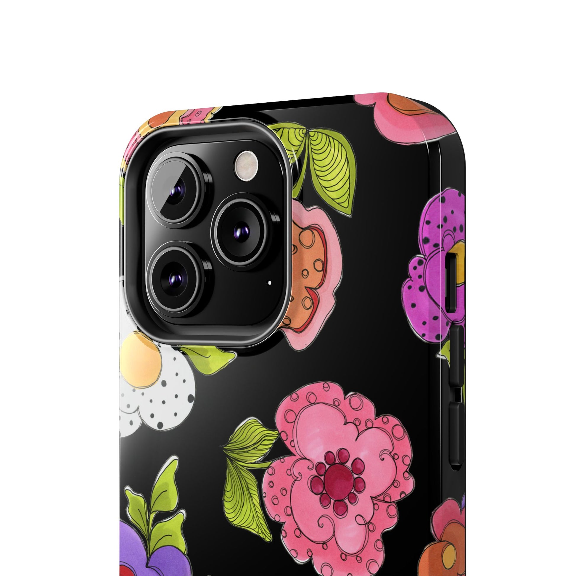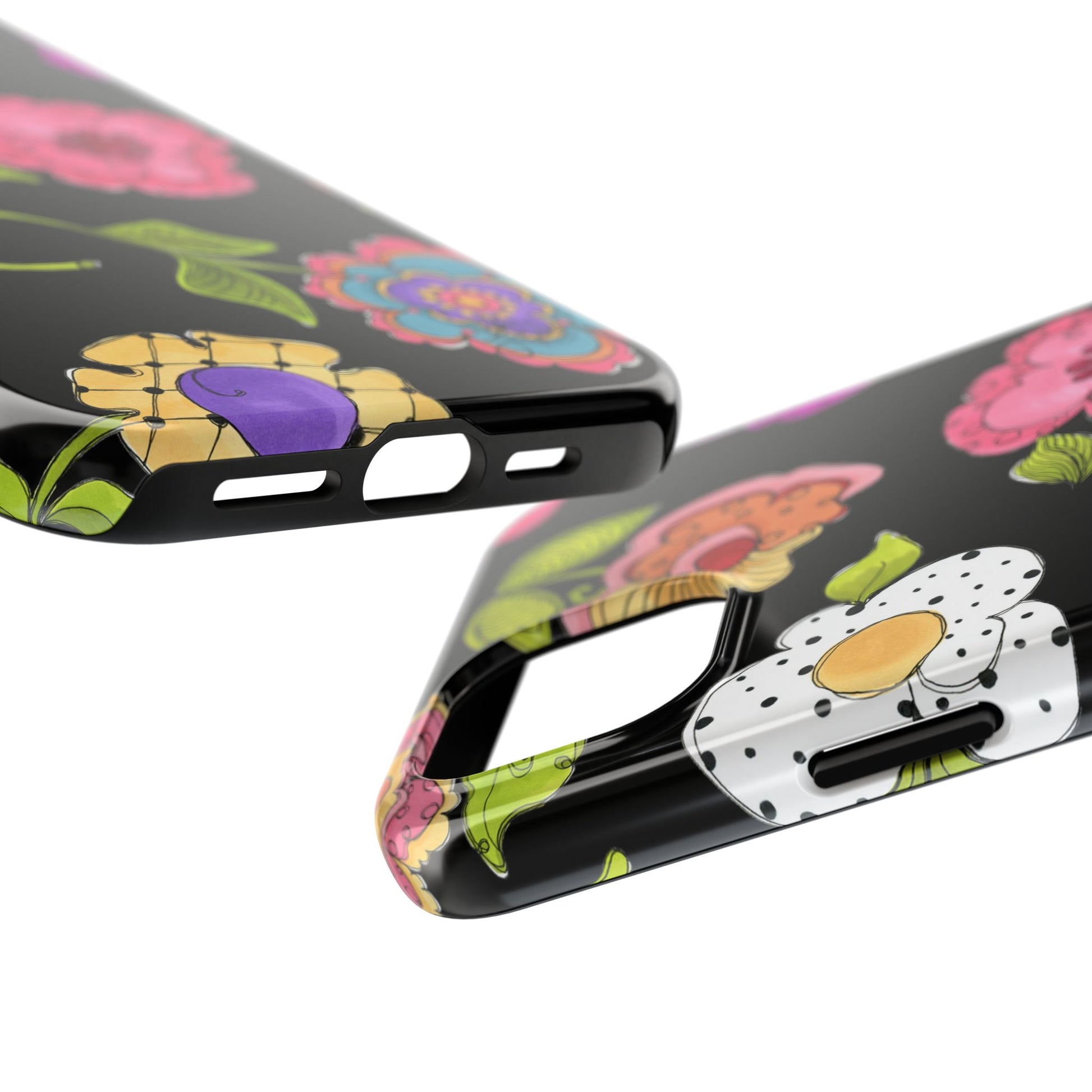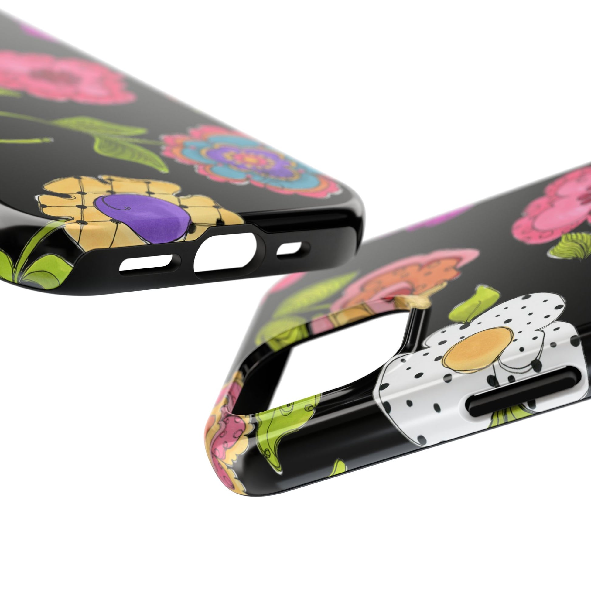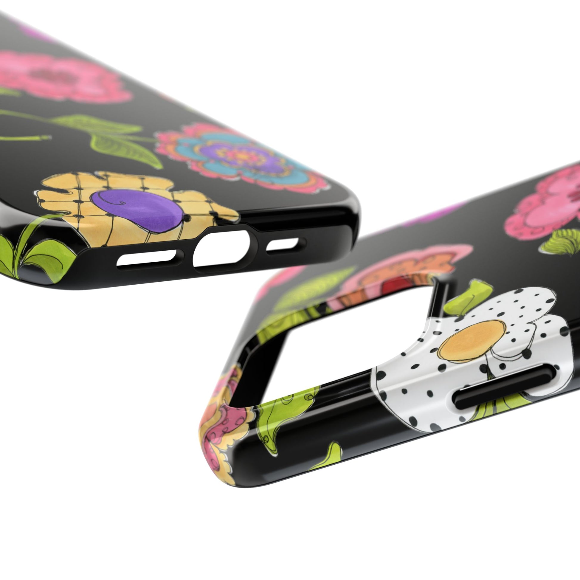 Fanciful flowers float on a deep black background. In and out of your pocket or purse it will add beauty and style to your day.