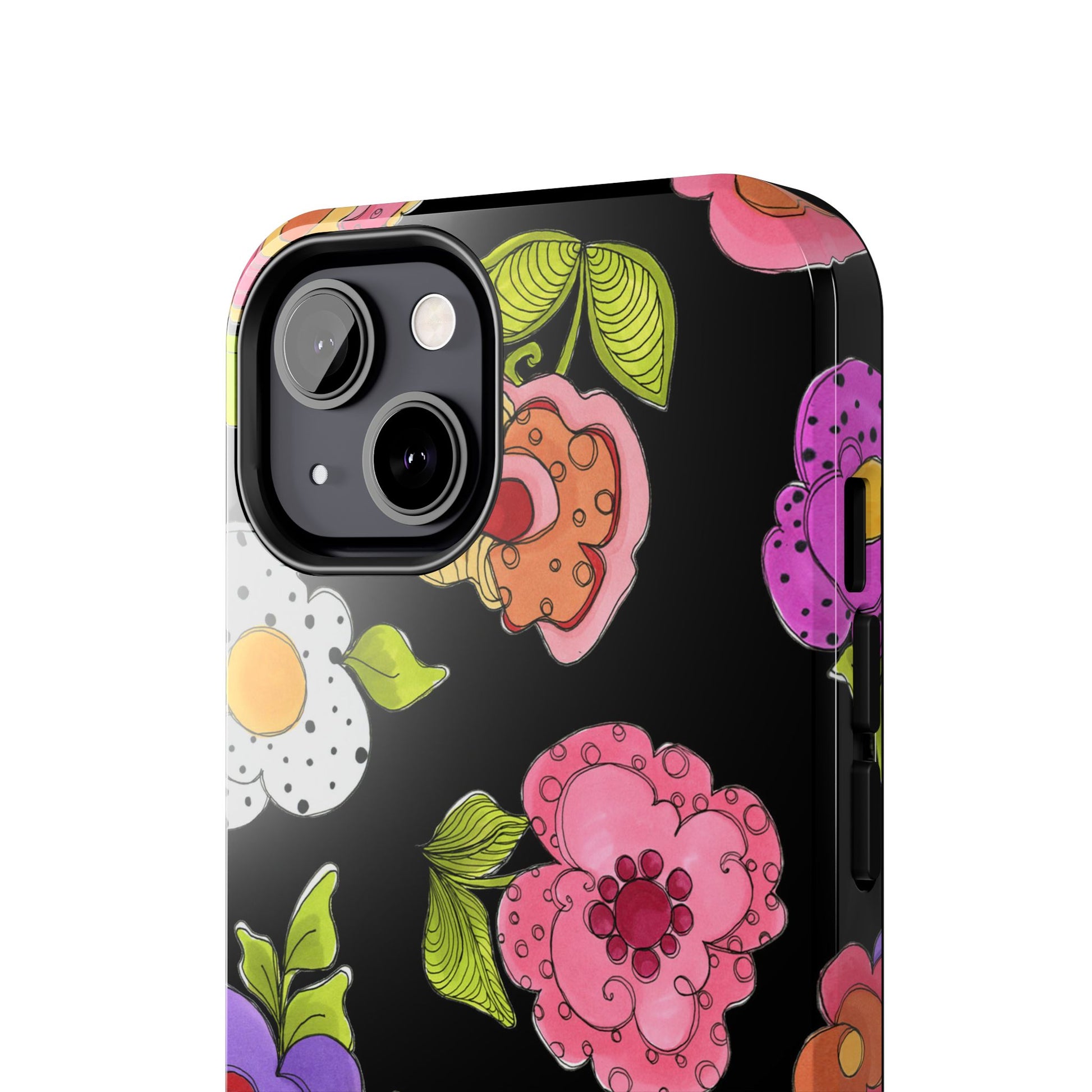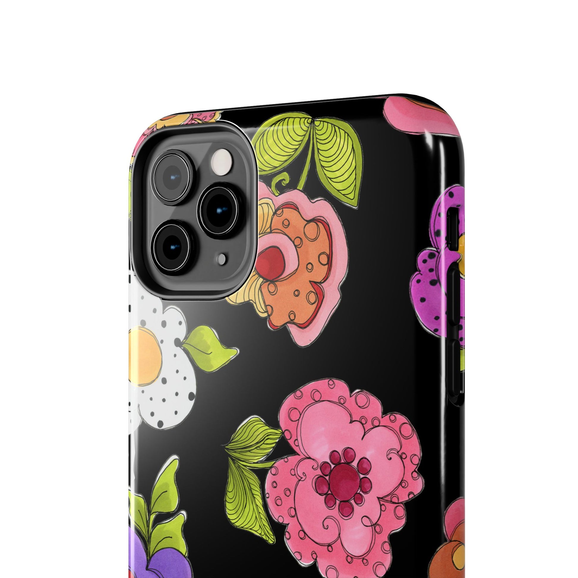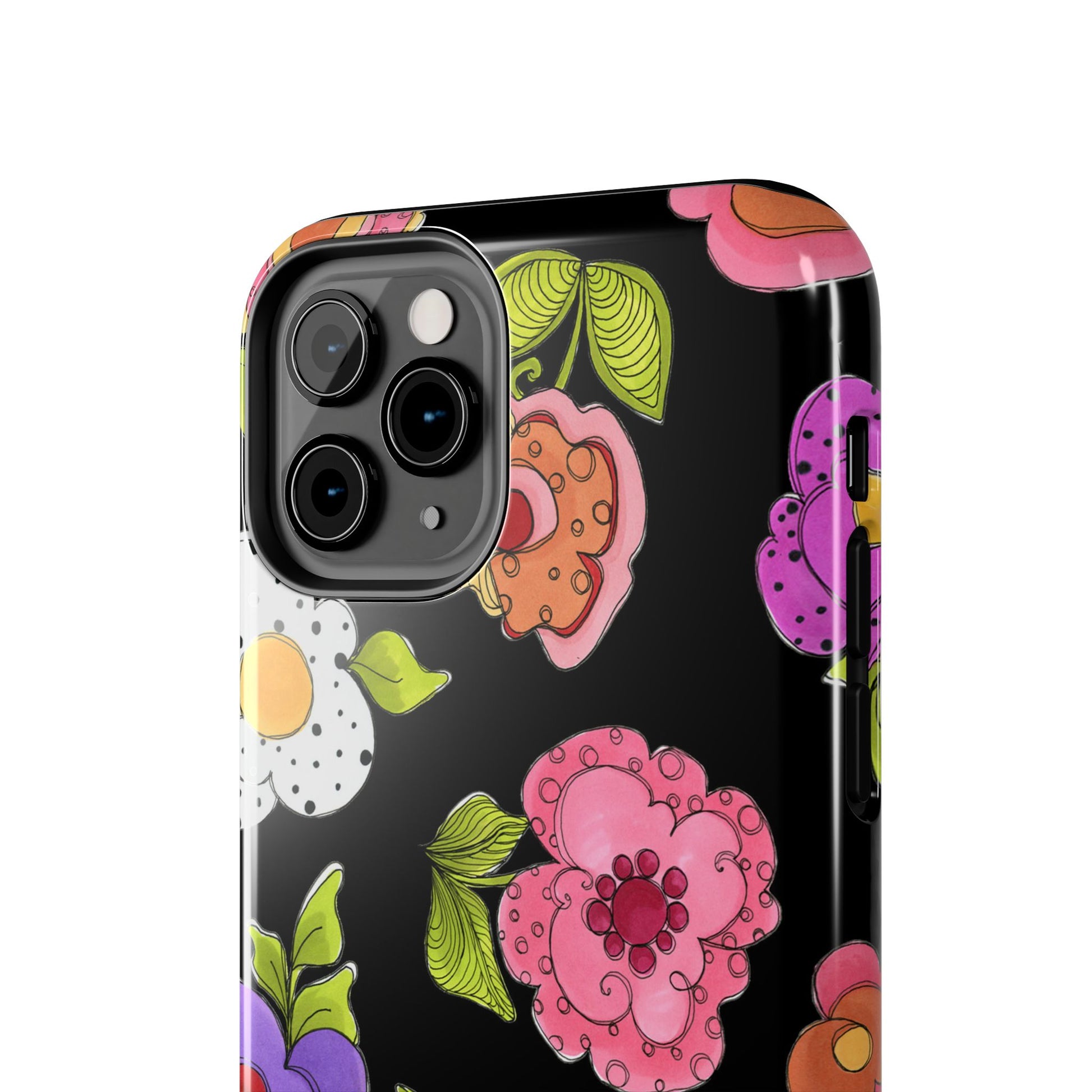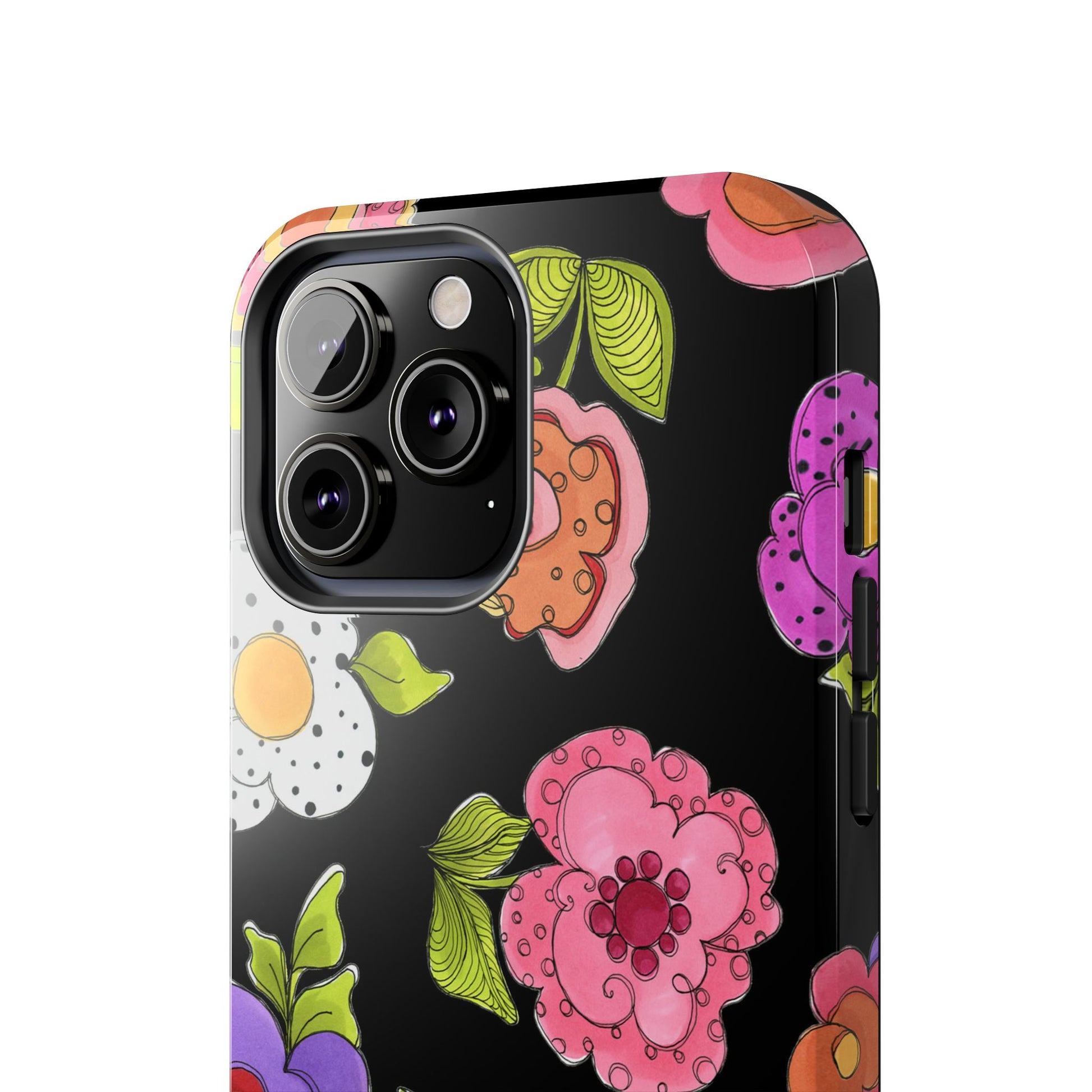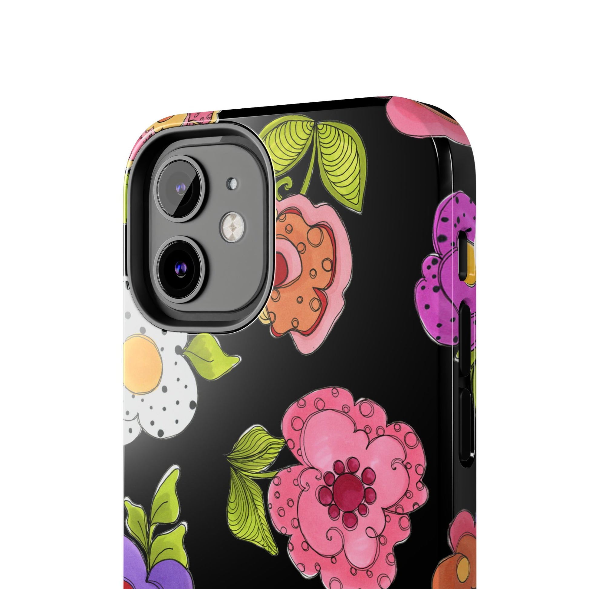 Fanciful flowers float on a deep black background. In and out of your pocket or purse it will add beauty and style to your day.