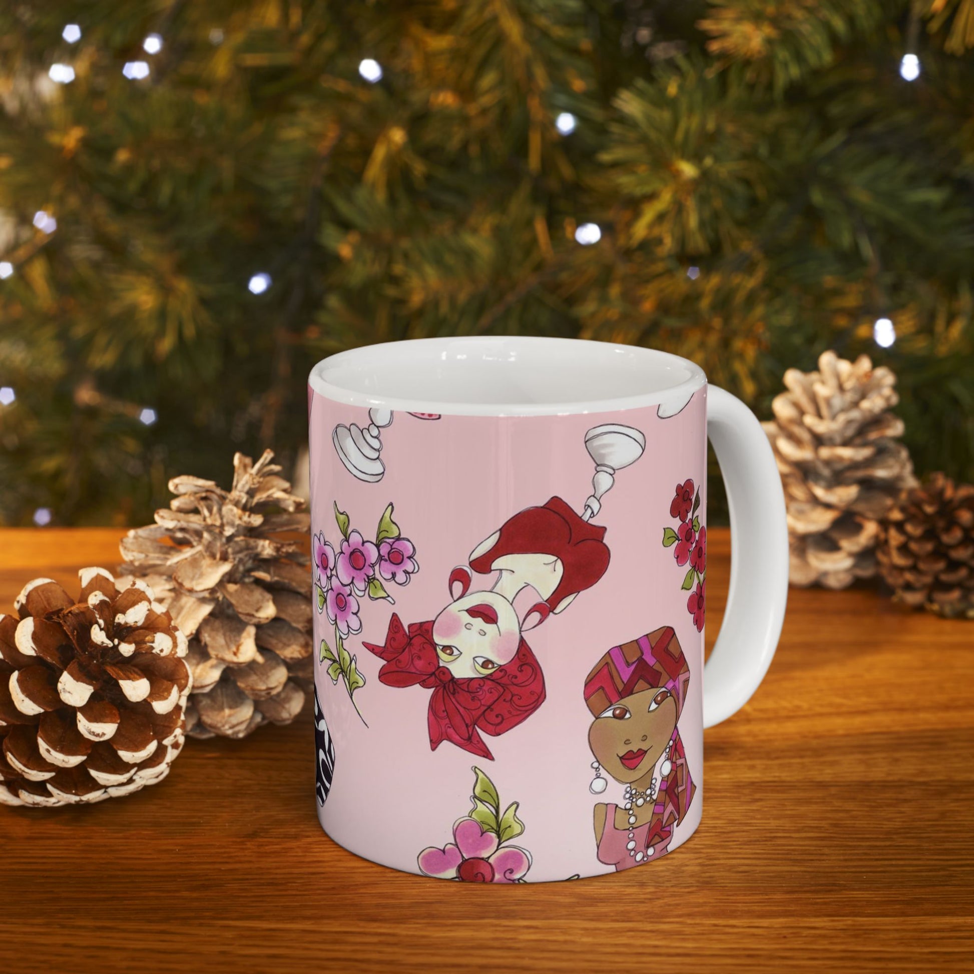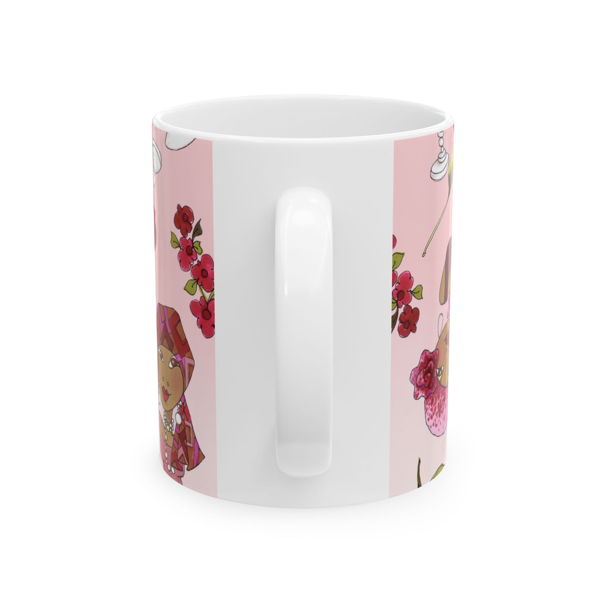 White ceramic 11oz mug with fun, colorful, Loralie sewing ladies enjoying each other's quirky company. Every project is more fun with the perfect Sewing Sisters mug! Makes a great gift!