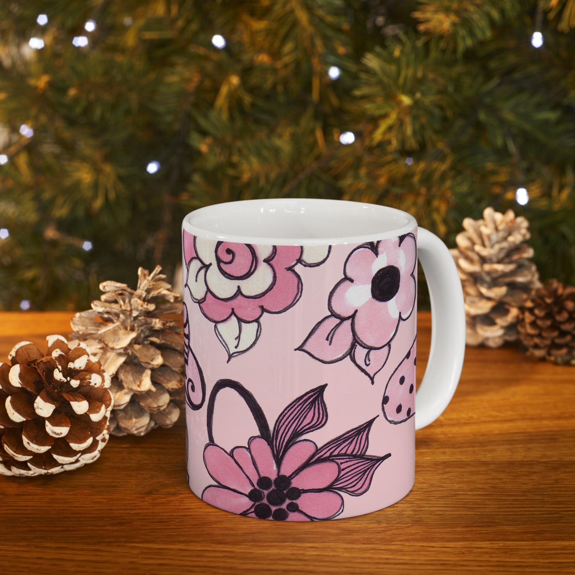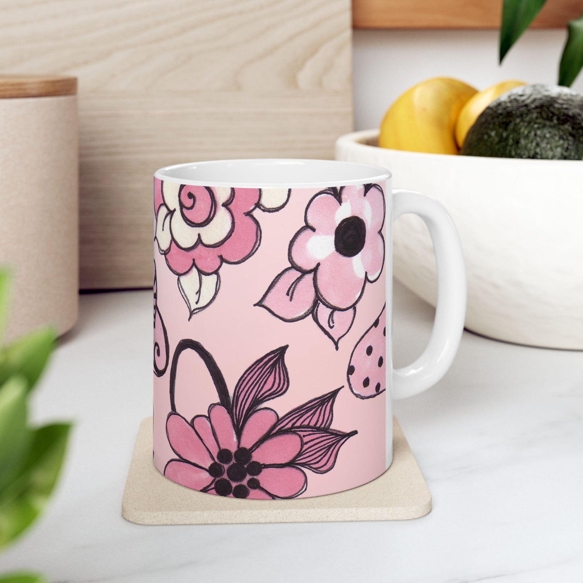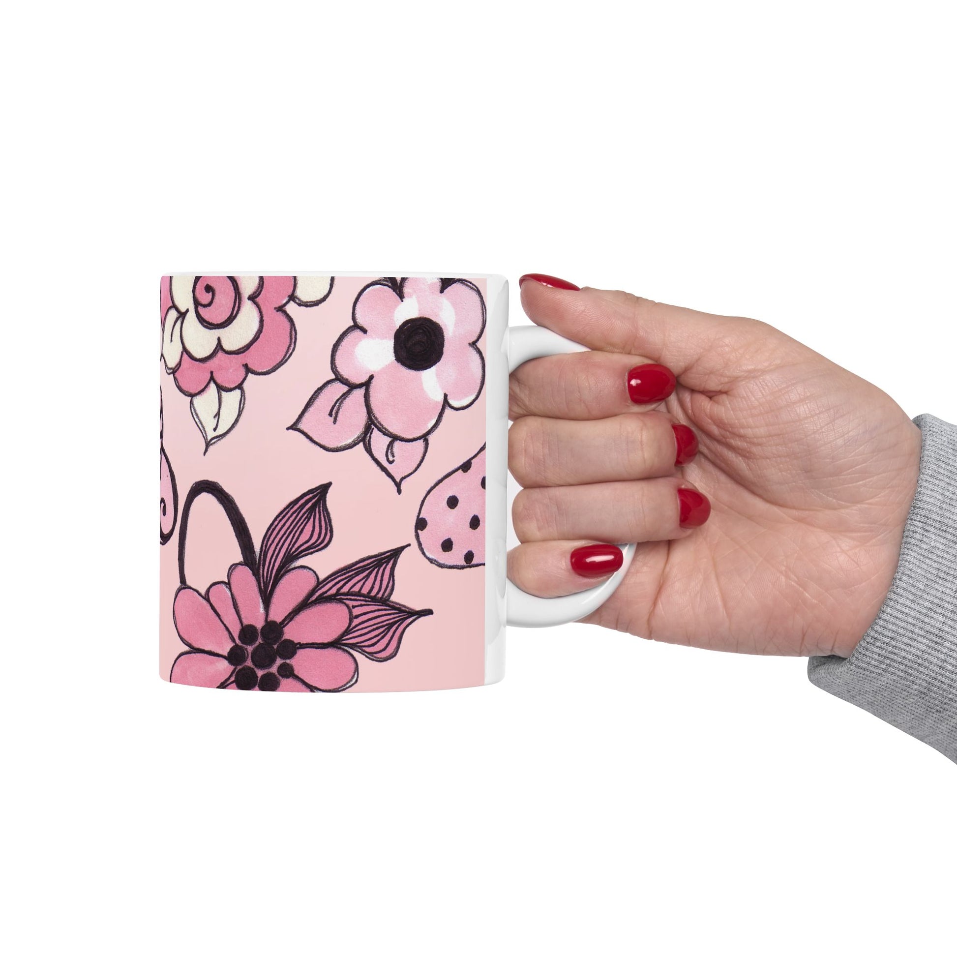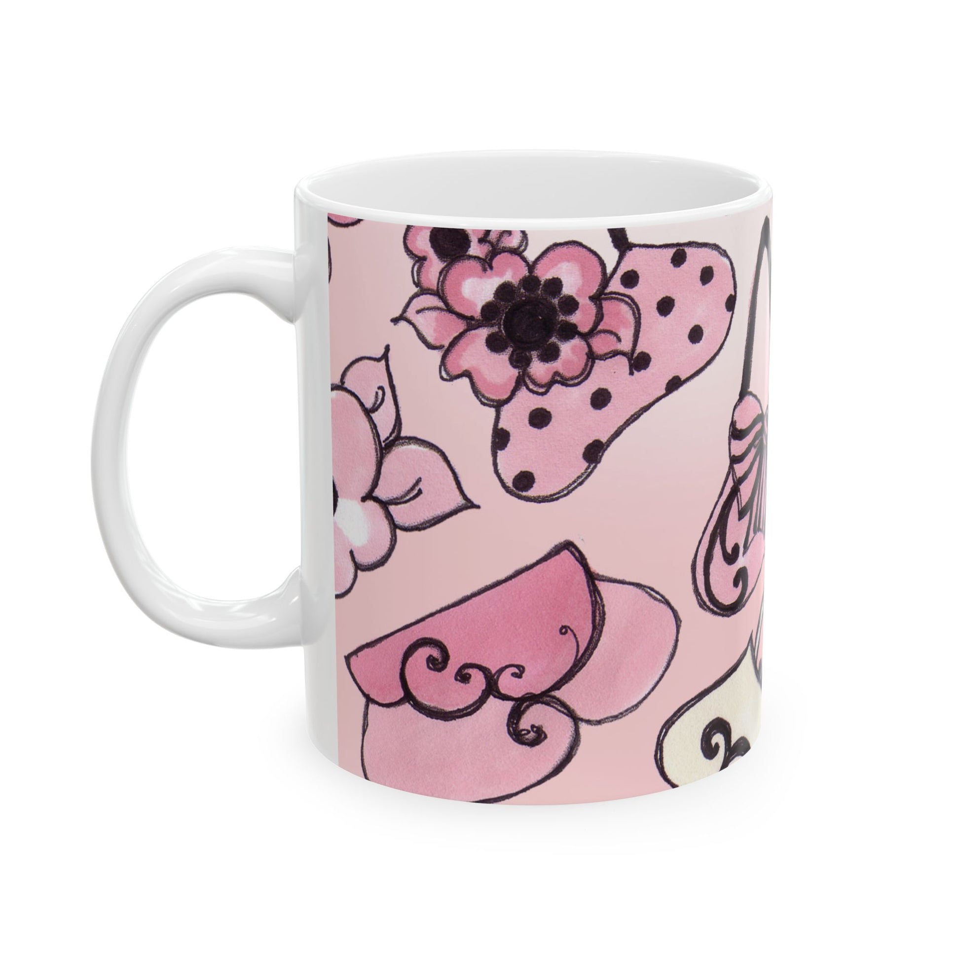 White ceramic 11oz mug with fun, colorful, Loralie sewing ladies enjoying each other's quirky company. Every project is more fun with the perfect Sewing Sisters mug! Makes a great gift!