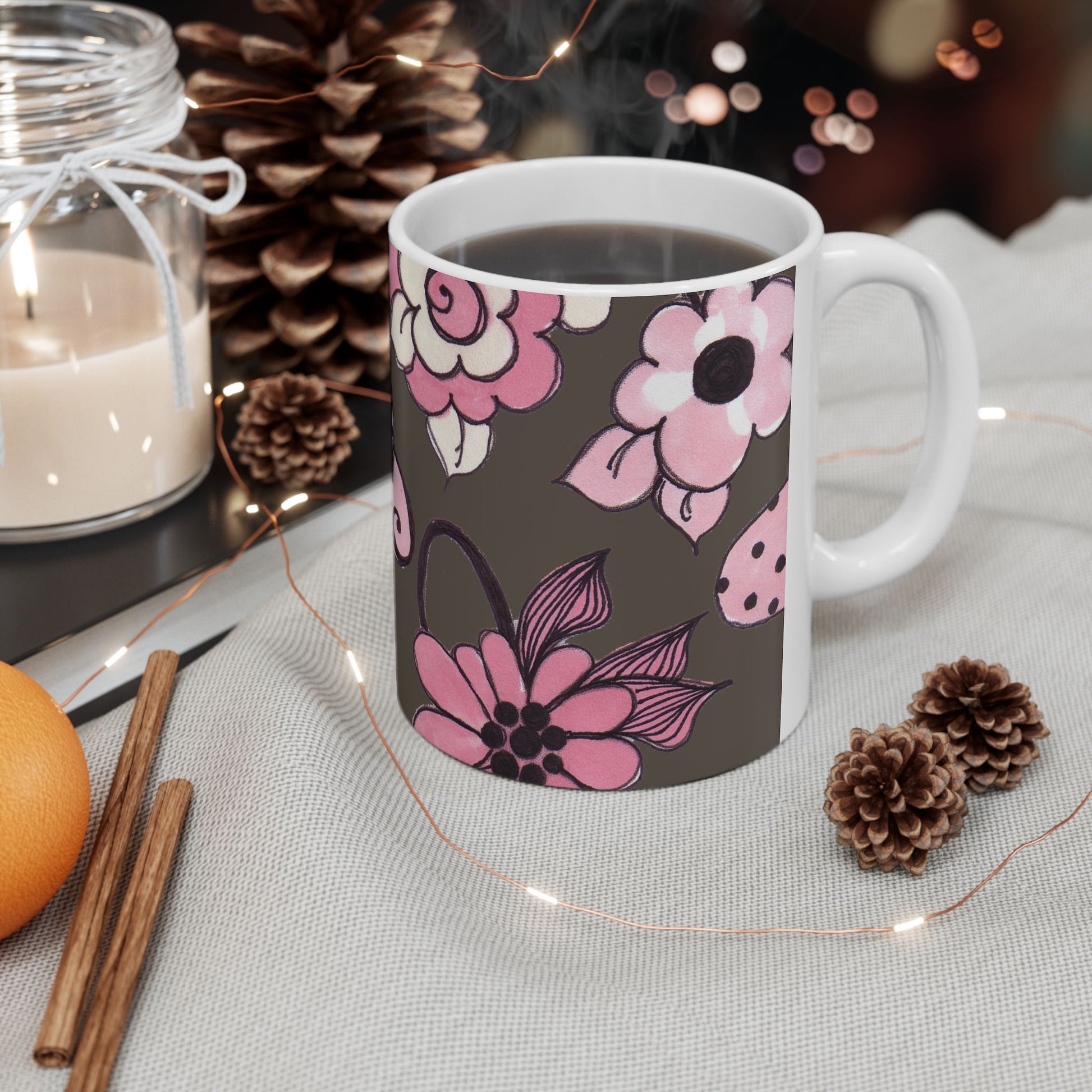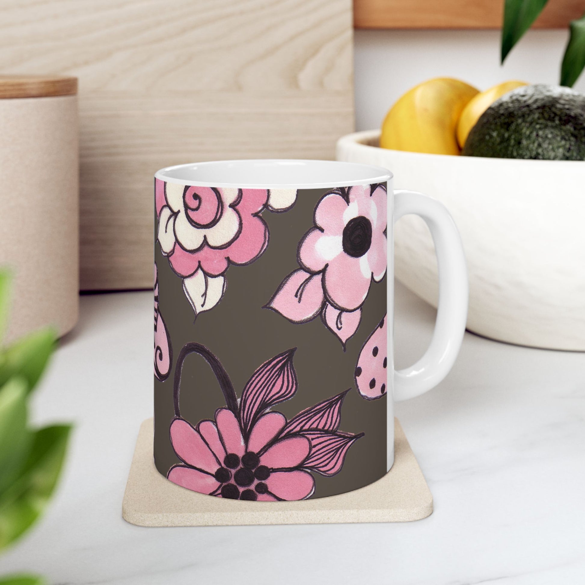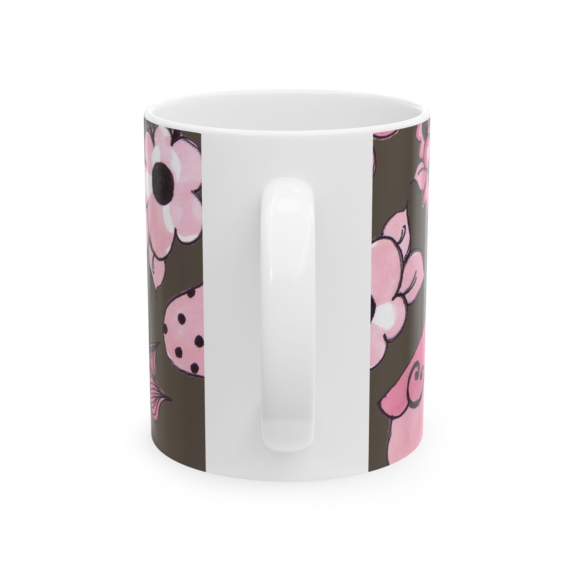 White ceramic 11oz mug with fun, colorful, Loralie sewing ladies enjoying each other's quirky company. Every project is more fun with the perfect Sewing Sisters mug! Makes a great gift!