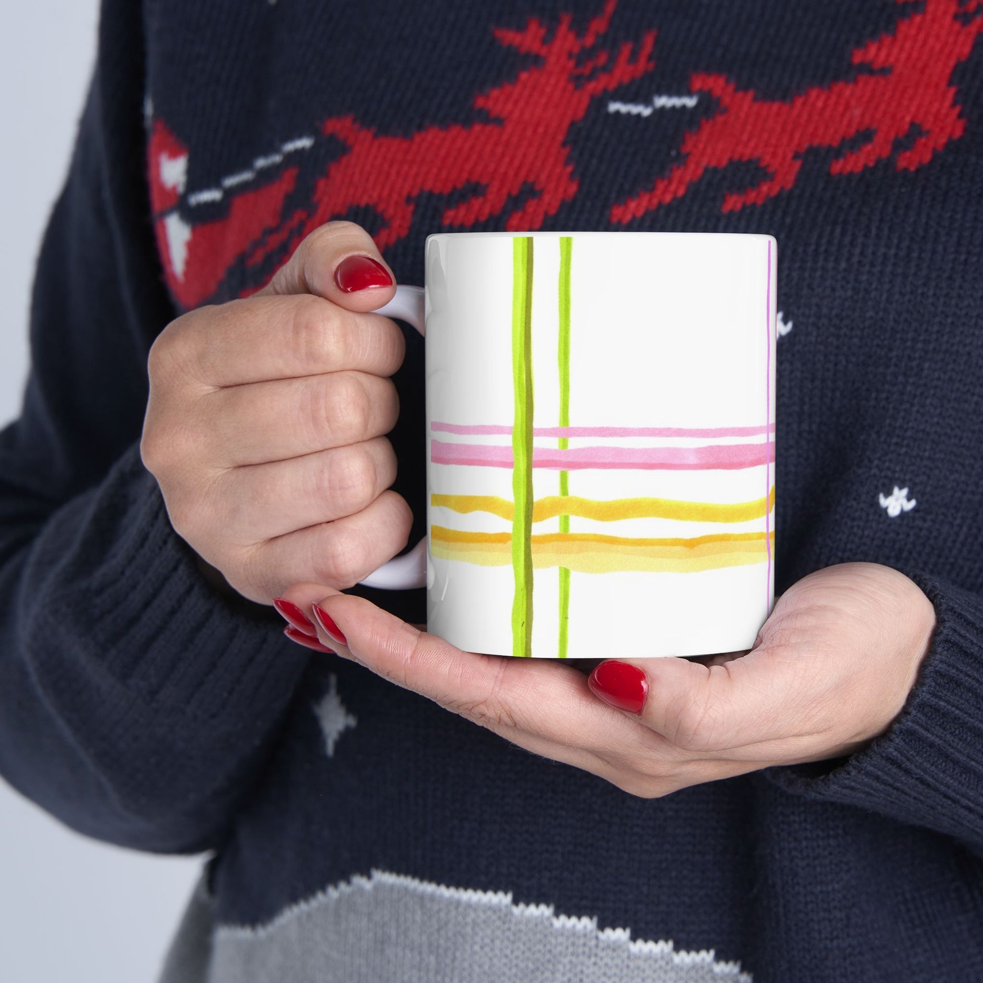 White ceramic 11oz mug with fun, colorful, Loralie sewing ladies enjoying each other's quirky company. Every project is more fun with the perfect Sewing Sisters mug! Makes a great gift!