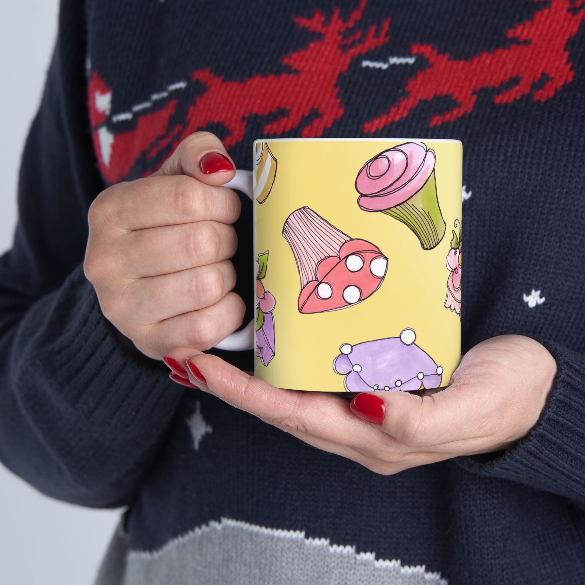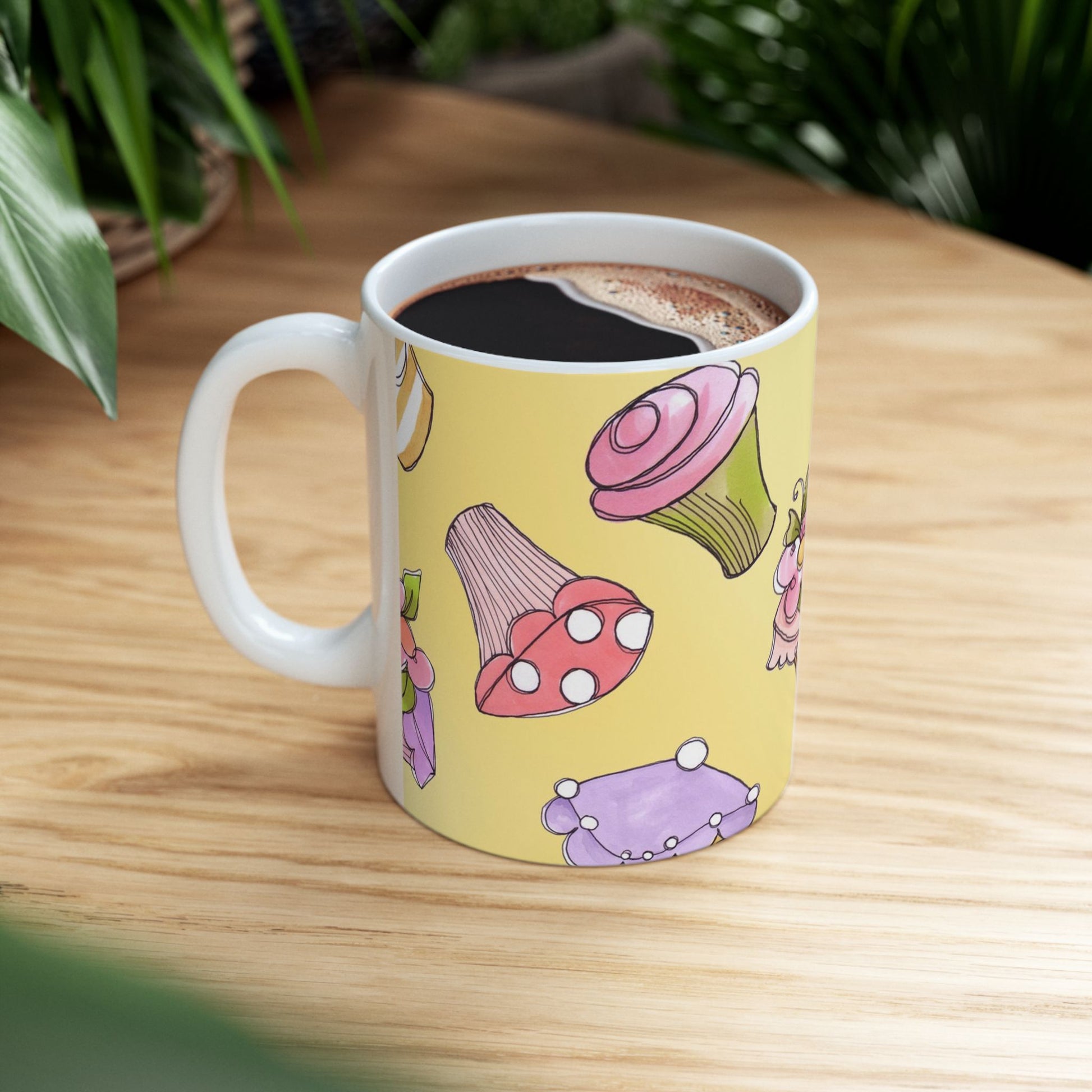 White ceramic 11oz mug with fun, colorful, Loralie sewing ladies enjoying each other's quirky company. Every project is more fun with the perfect Sewing Sisters mug! Makes a great gift!
