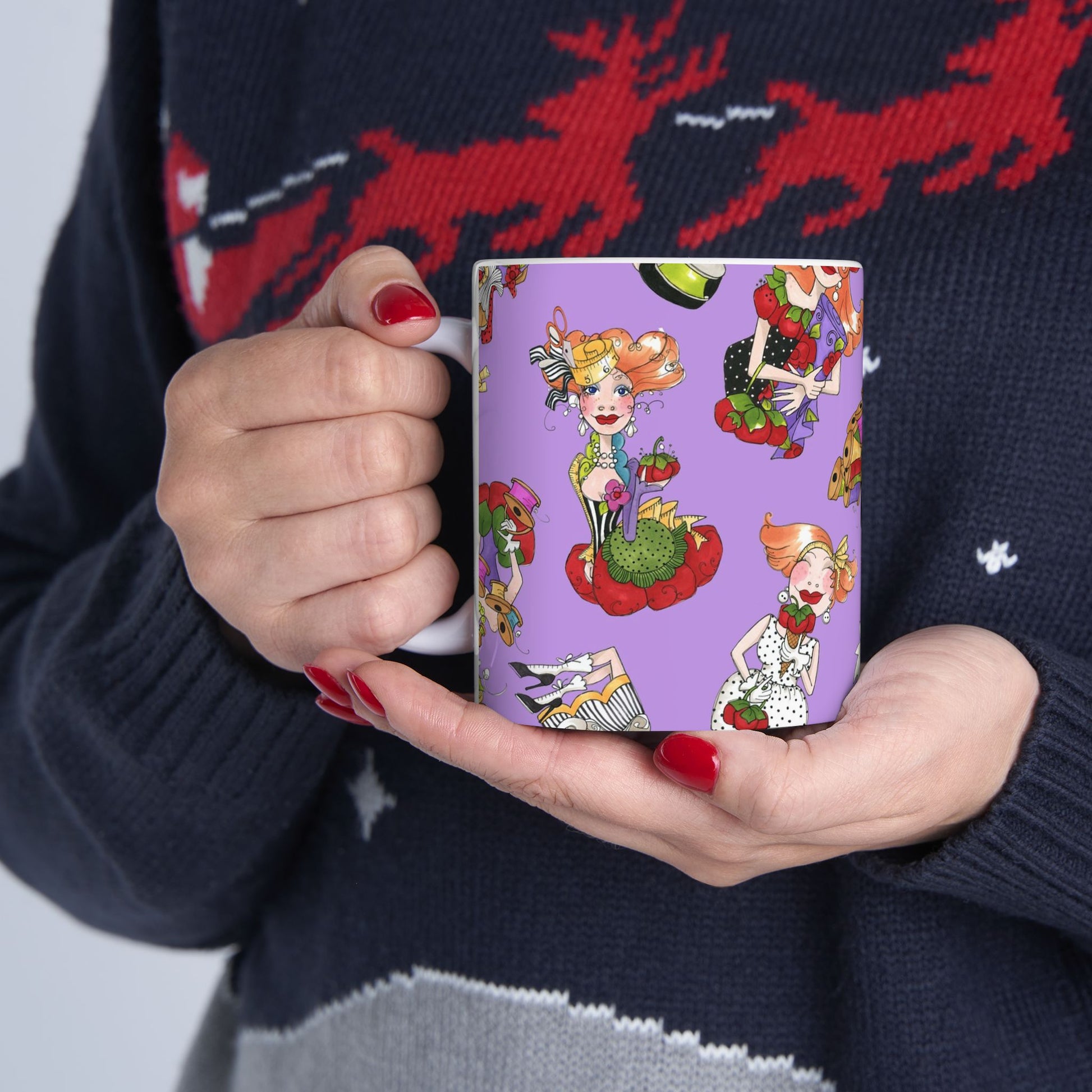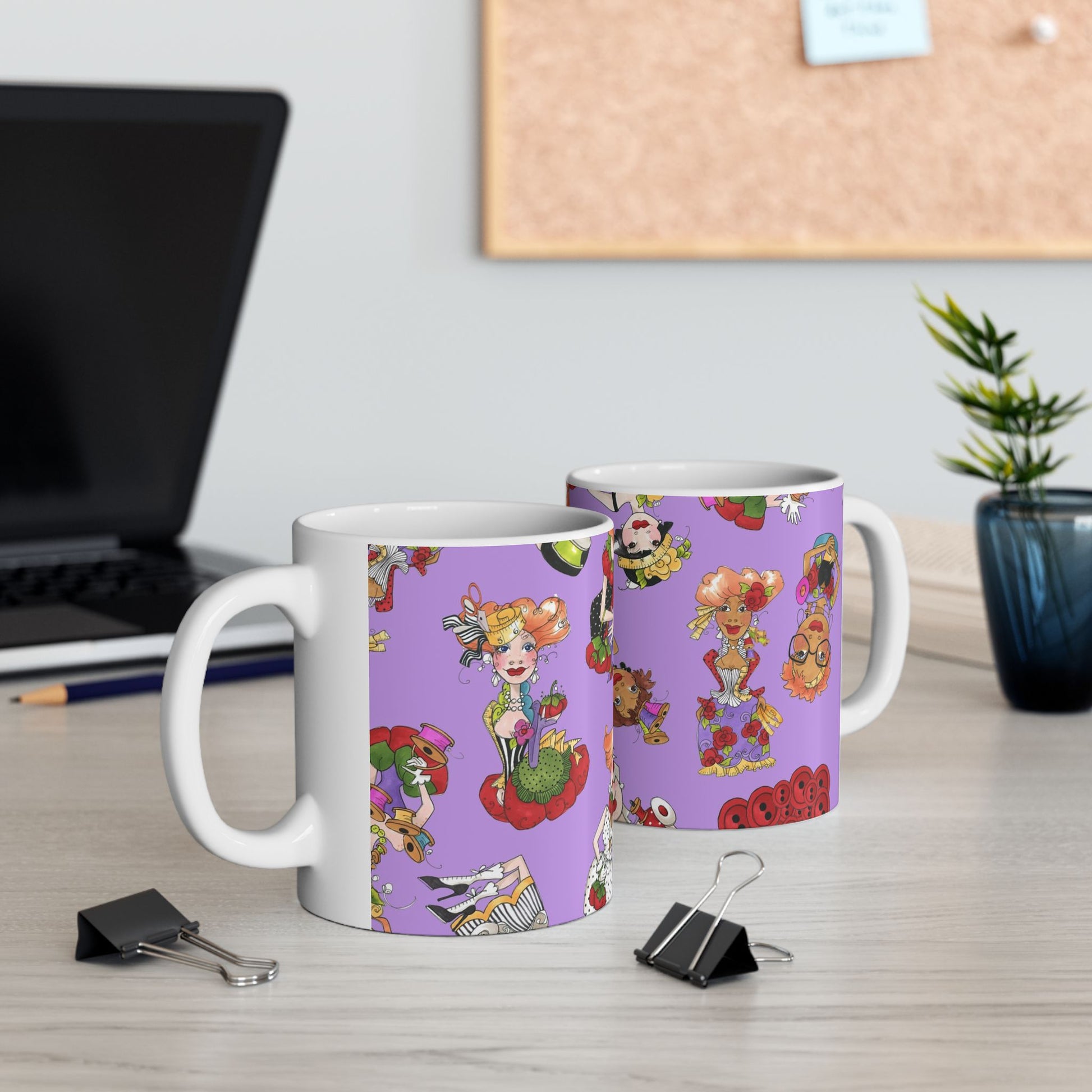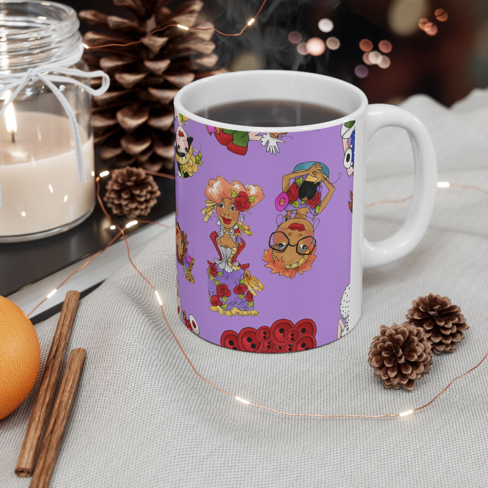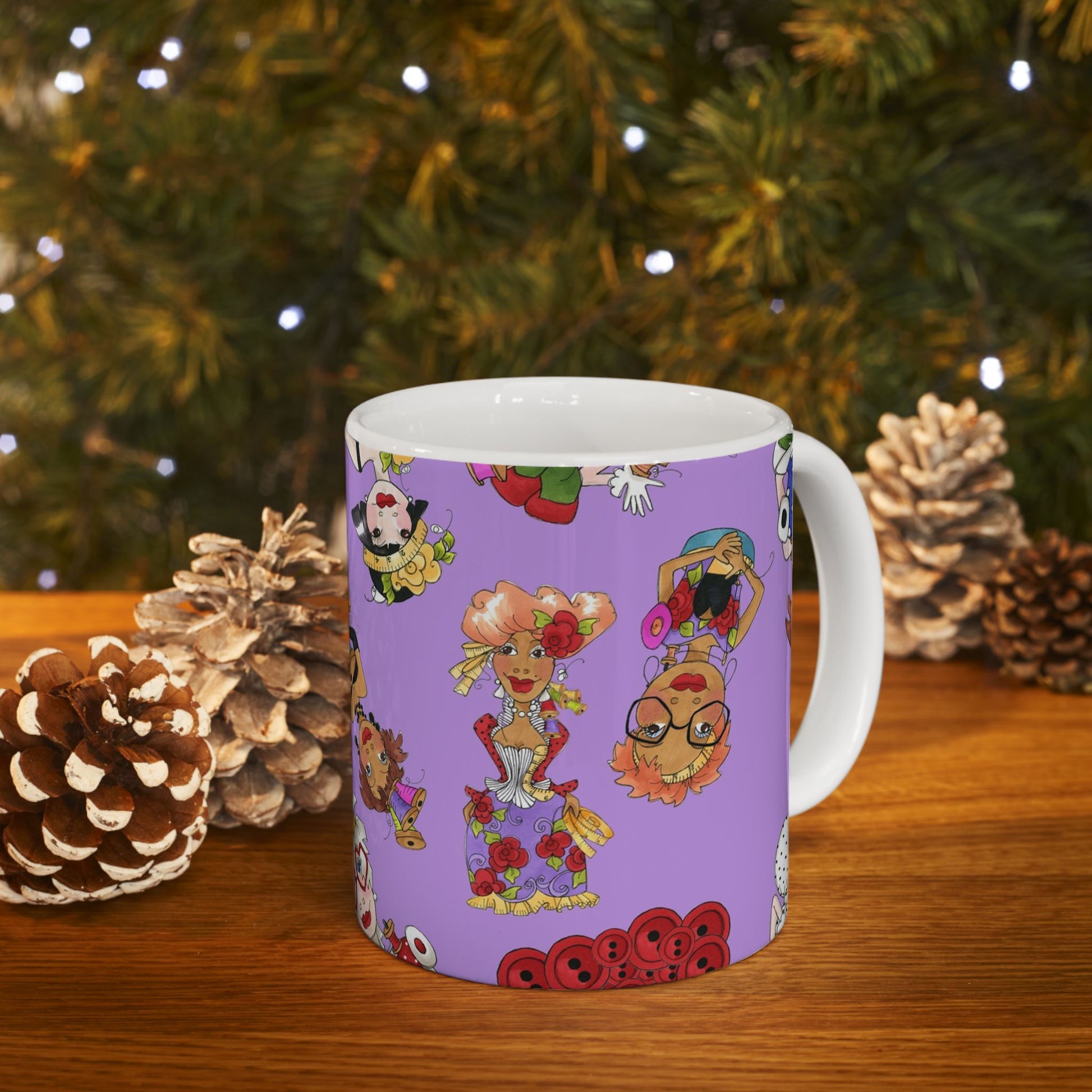 White ceramic 11oz mug with fun, colorful, Loralie sewing ladies enjoying each other's quirky company. Every project is more fun with the perfect Sewing Sisters mug! Makes a great gift!
