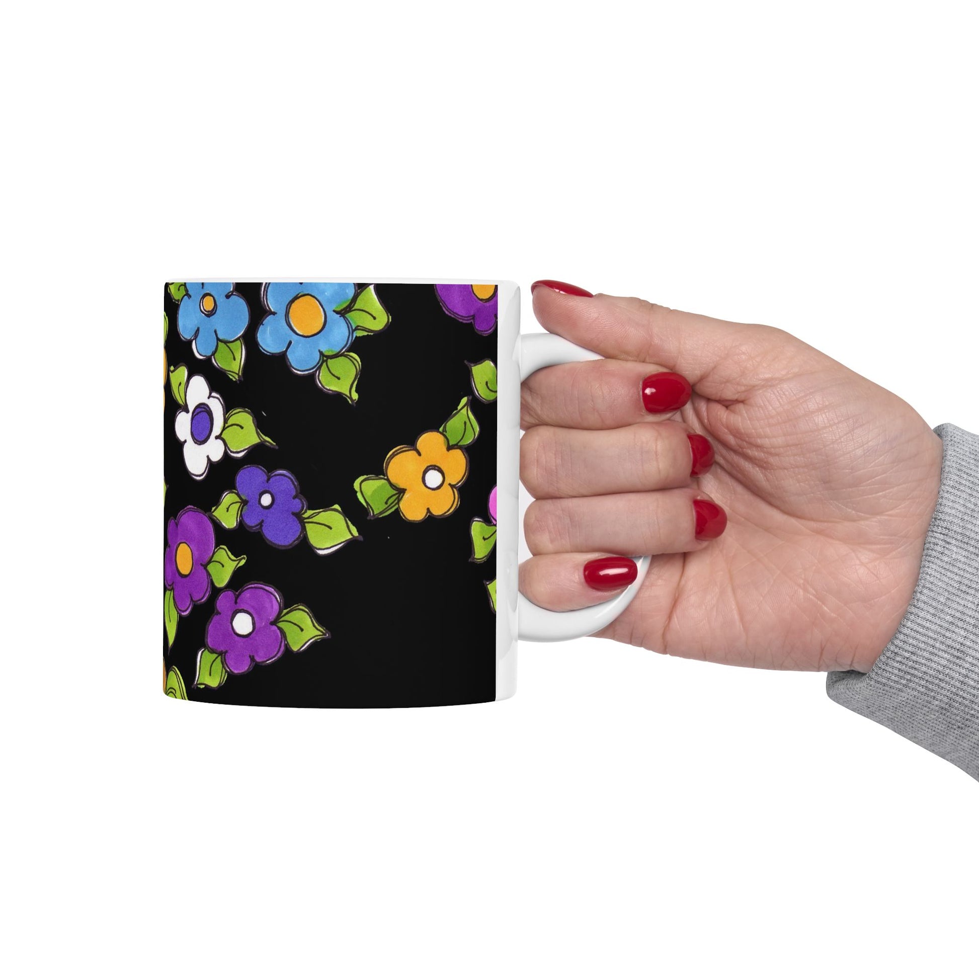 White ceramic 11oz mug with fun, colorful, Loralie sewing ladies enjoying each other's quirky company. Every project is more fun with the perfect Sewing Sisters mug! Makes a great gift!