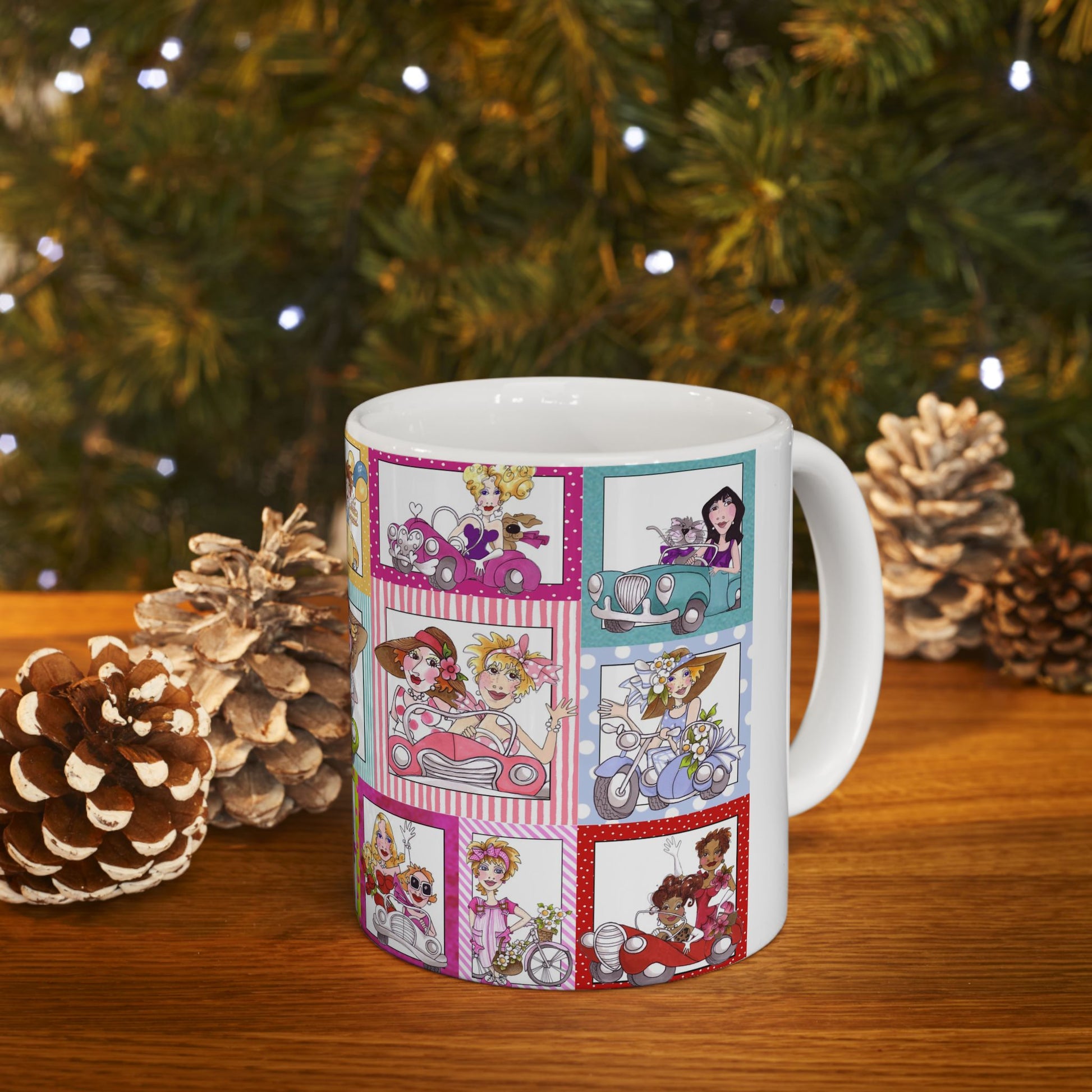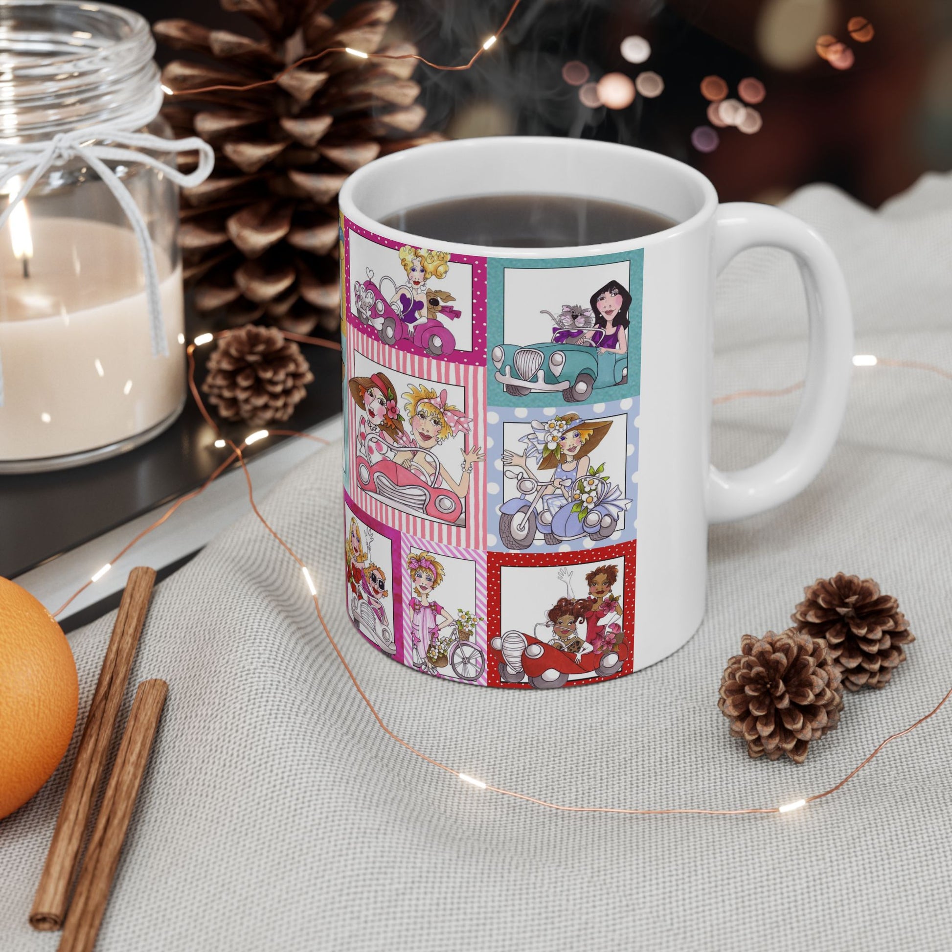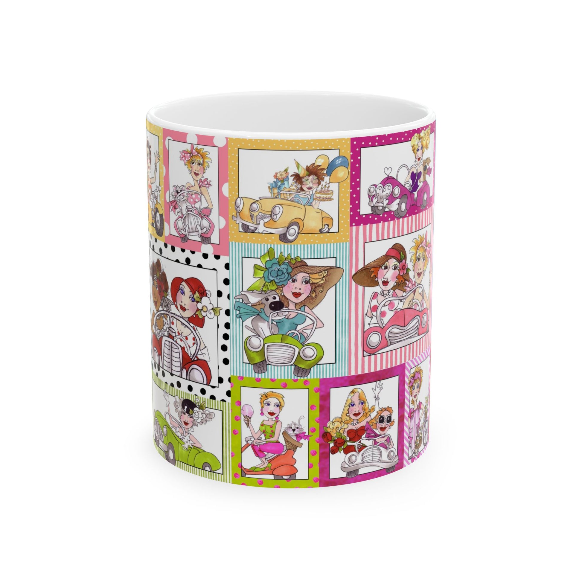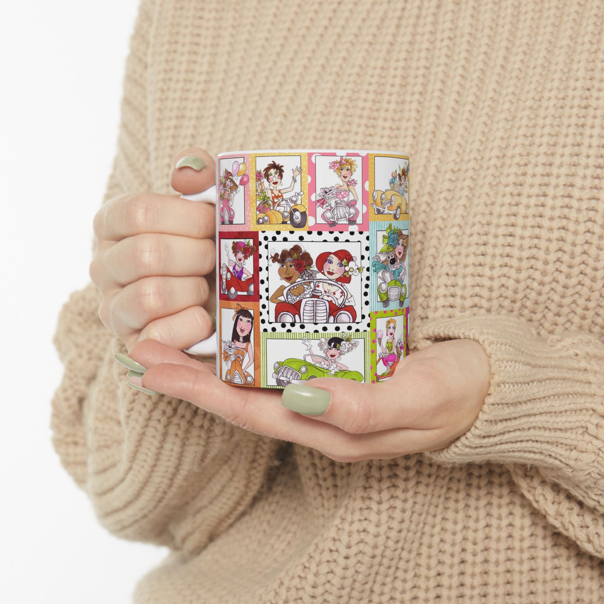 White ceramic 11oz mug with fun, colorful, Loralie sewing ladies enjoying each other's quirky company. Every project is more fun with the perfect Sewing Sisters mug! Makes a great gift!