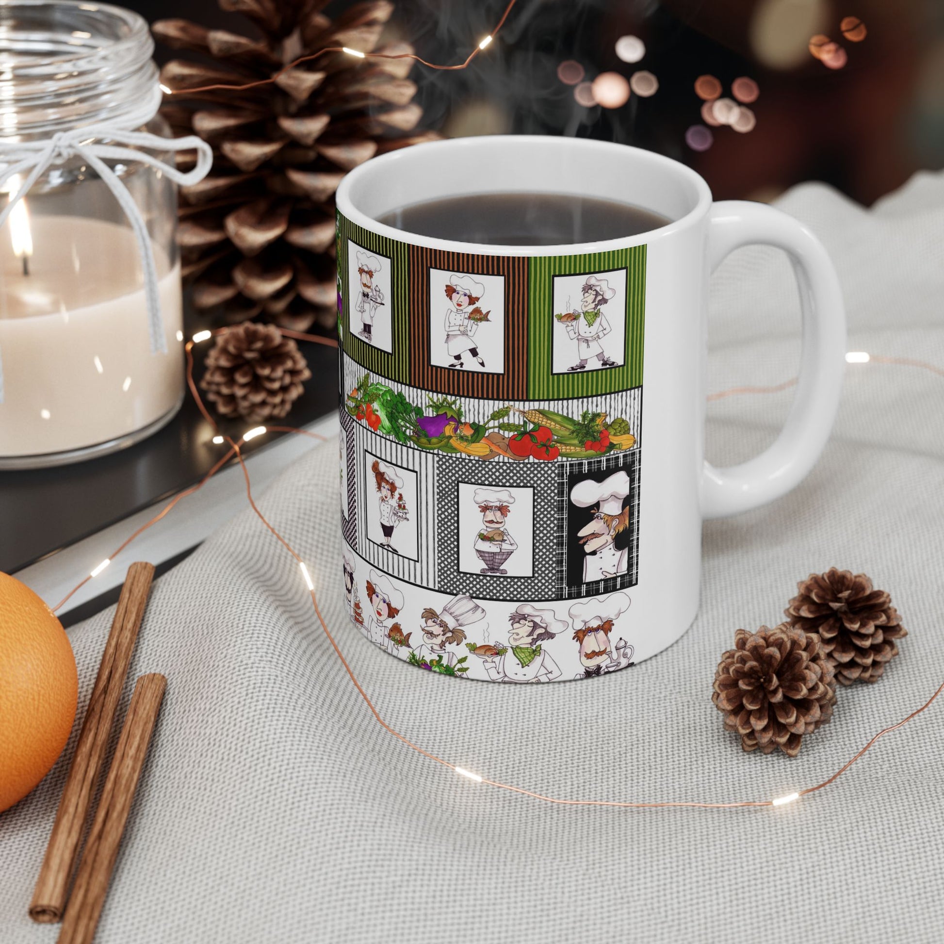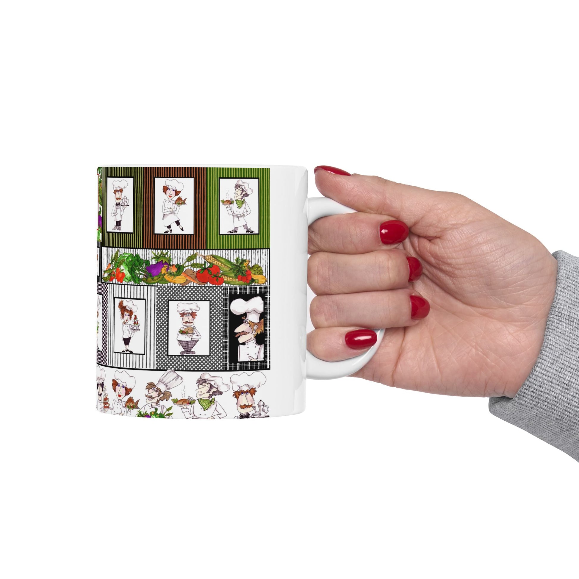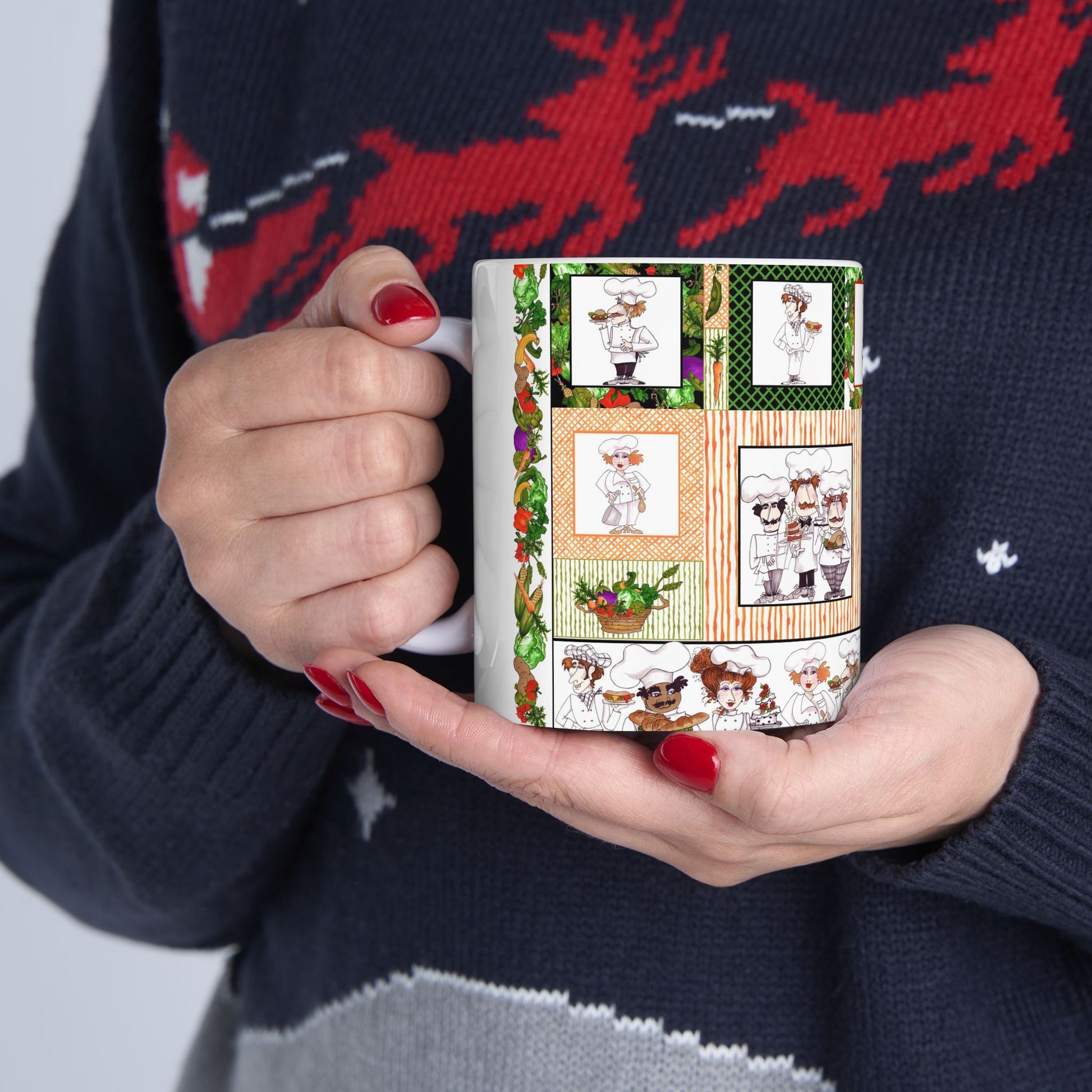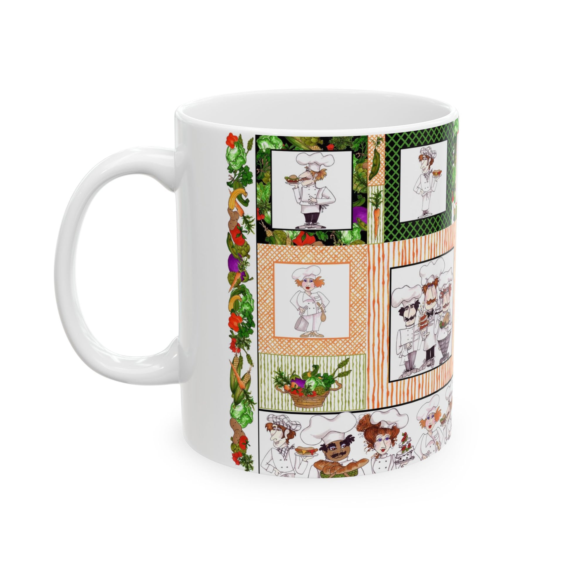 White ceramic 11oz mug with fun, colorful, Loralie sewing ladies enjoying each other's quirky company. Every project is more fun with the perfect Sewing Sisters mug! Makes a great gift!