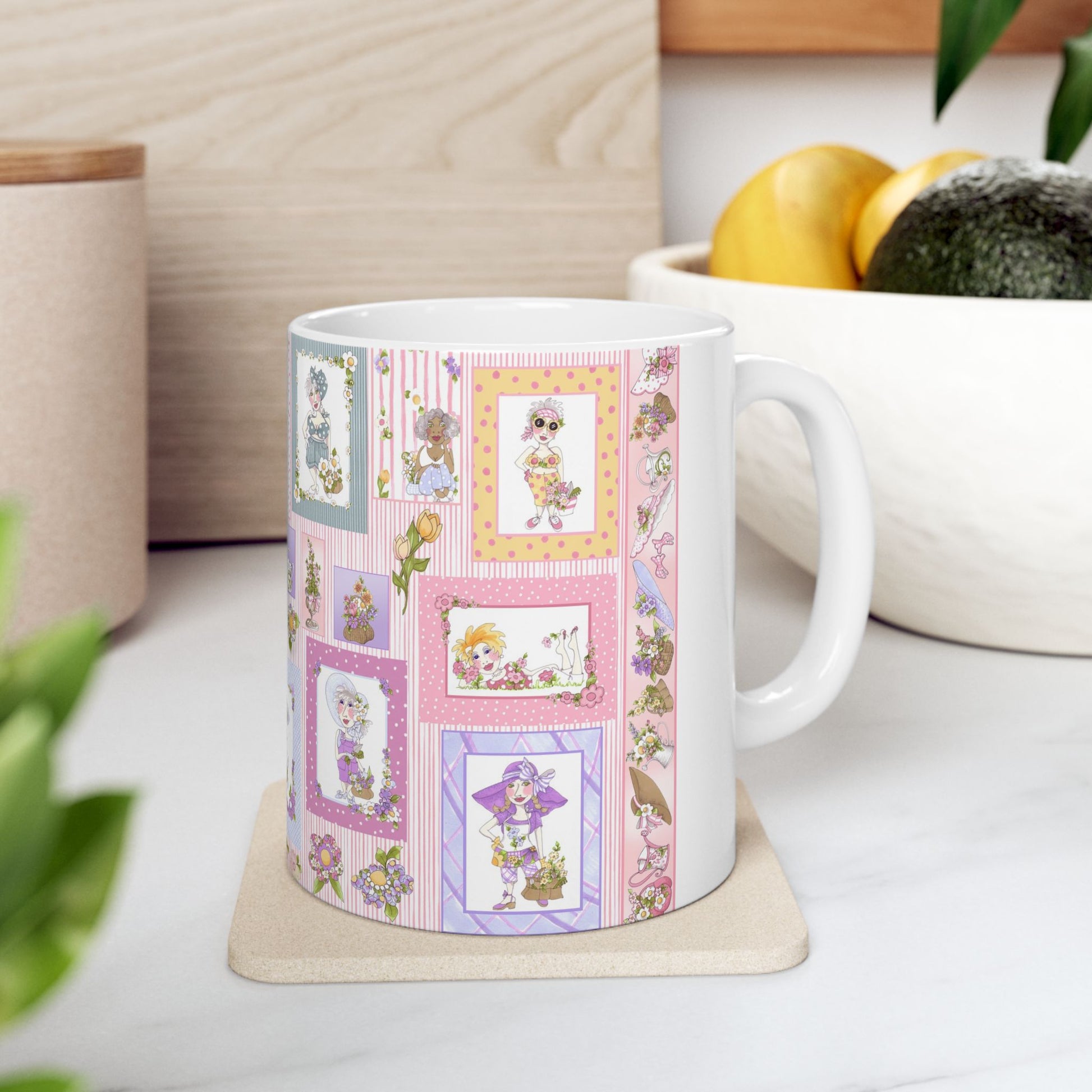 White ceramic 11oz mug with fun, colorful, Loralie sewing ladies enjoying each other's quirky company. Every project is more fun with the perfect Sewing Sisters mug! Makes a great gift!
