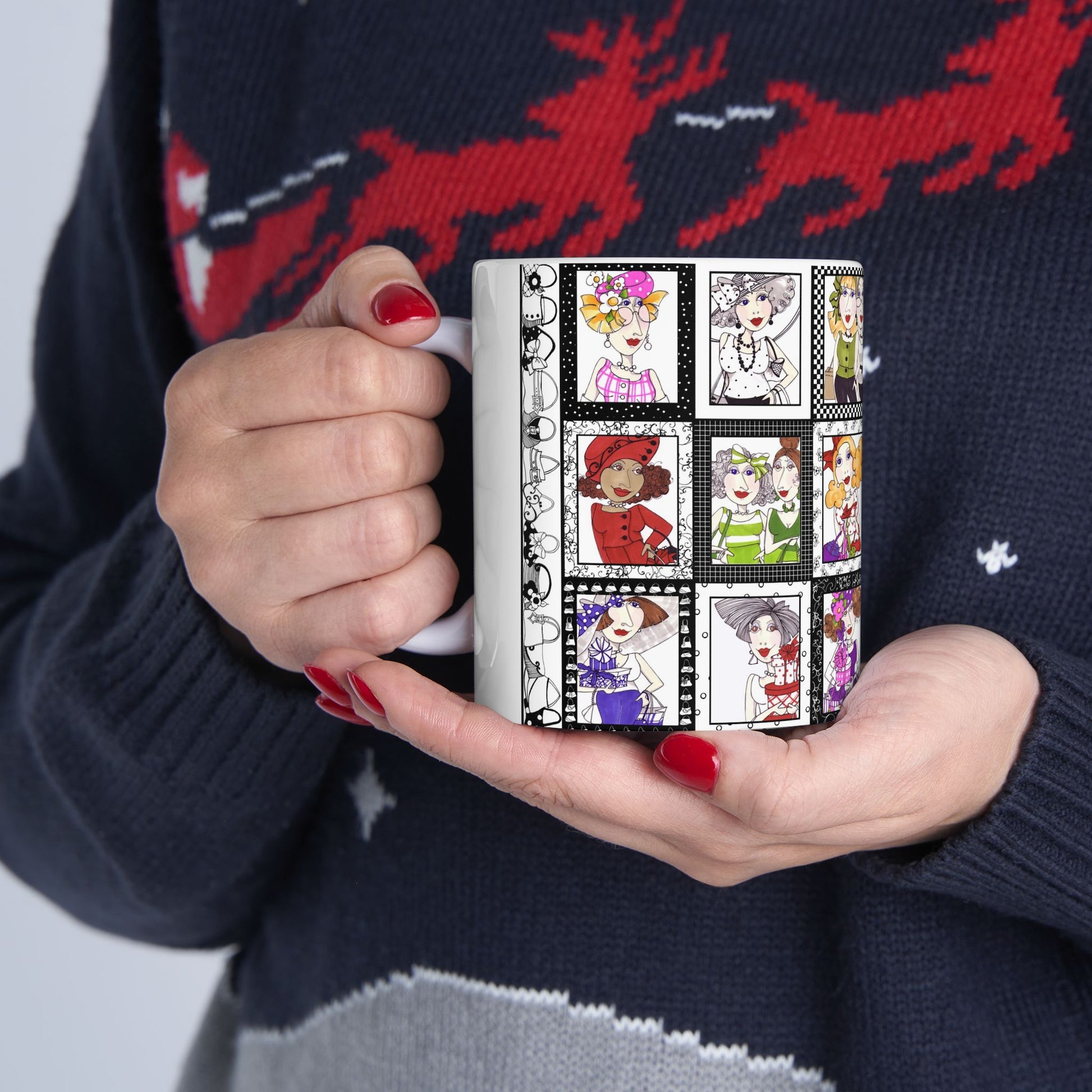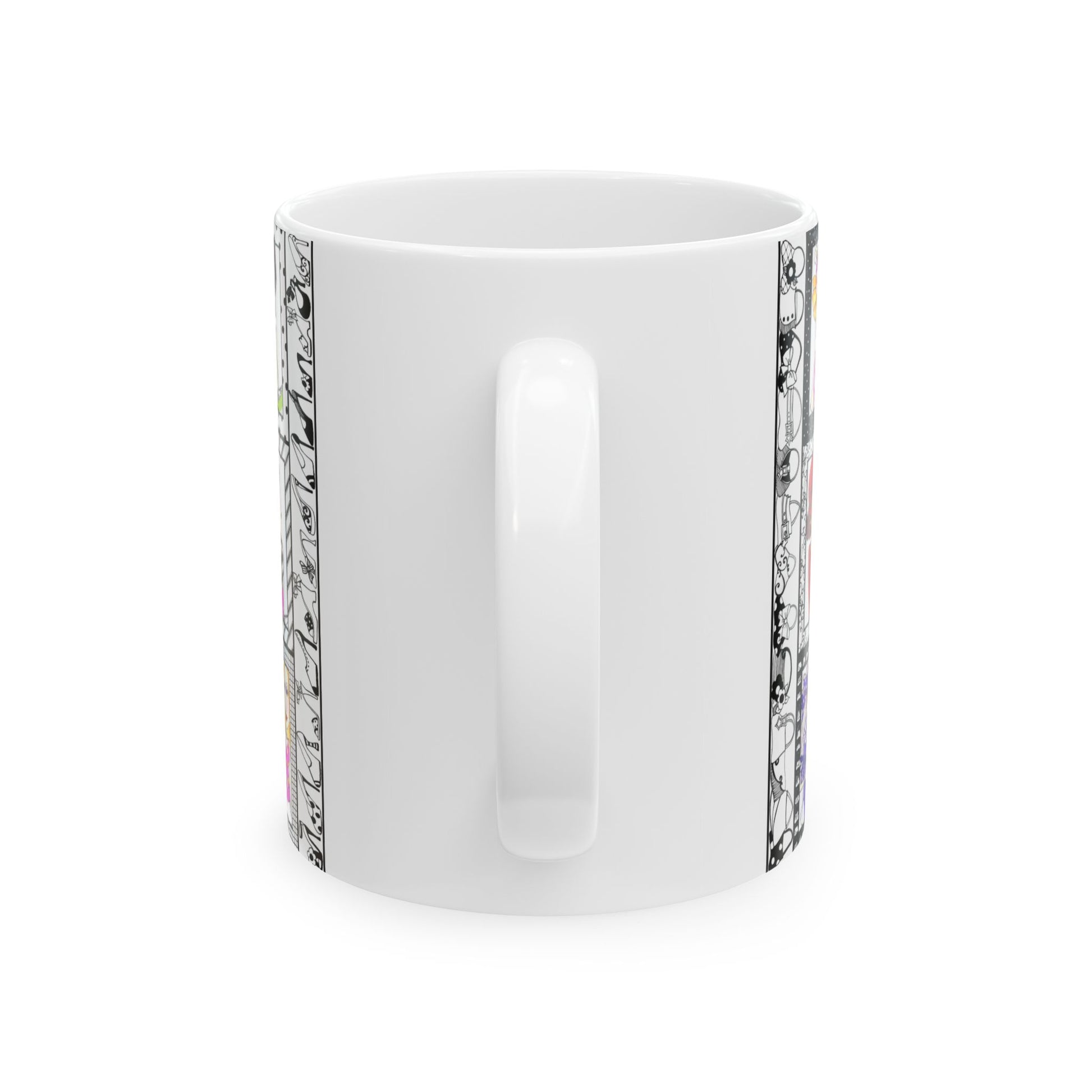 White ceramic 11oz mug with fun, colorful, Loralie sewing ladies enjoying each other's quirky company. Every project is more fun with the perfect Sewing Sisters mug! Makes a great gift!