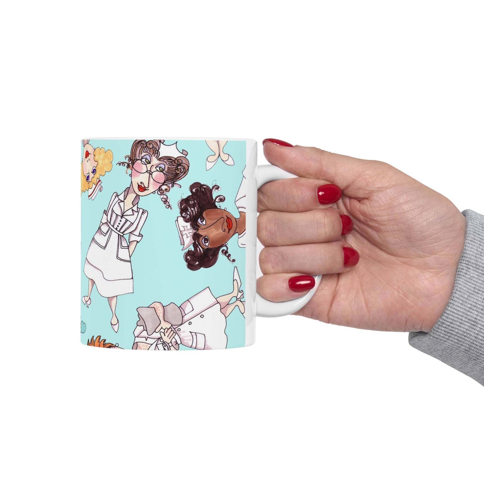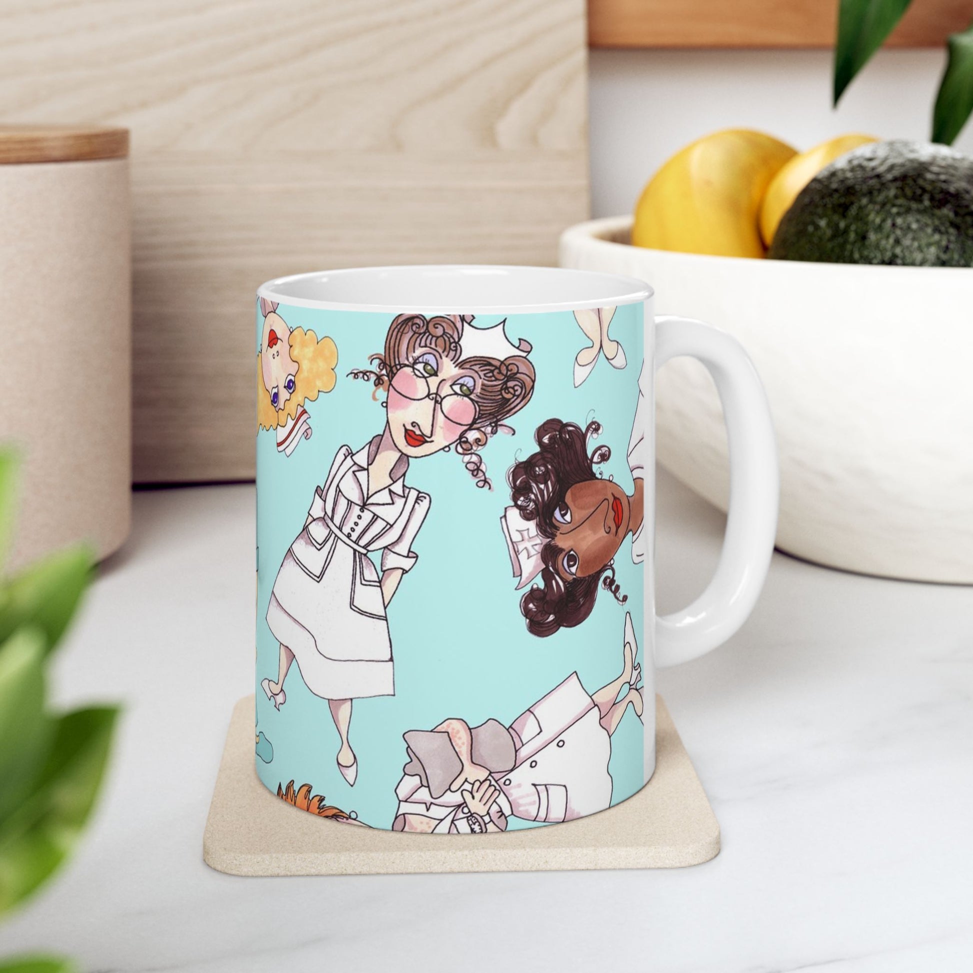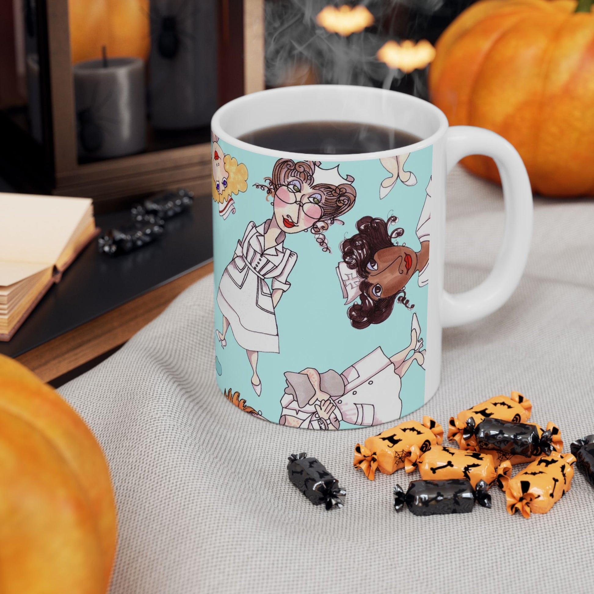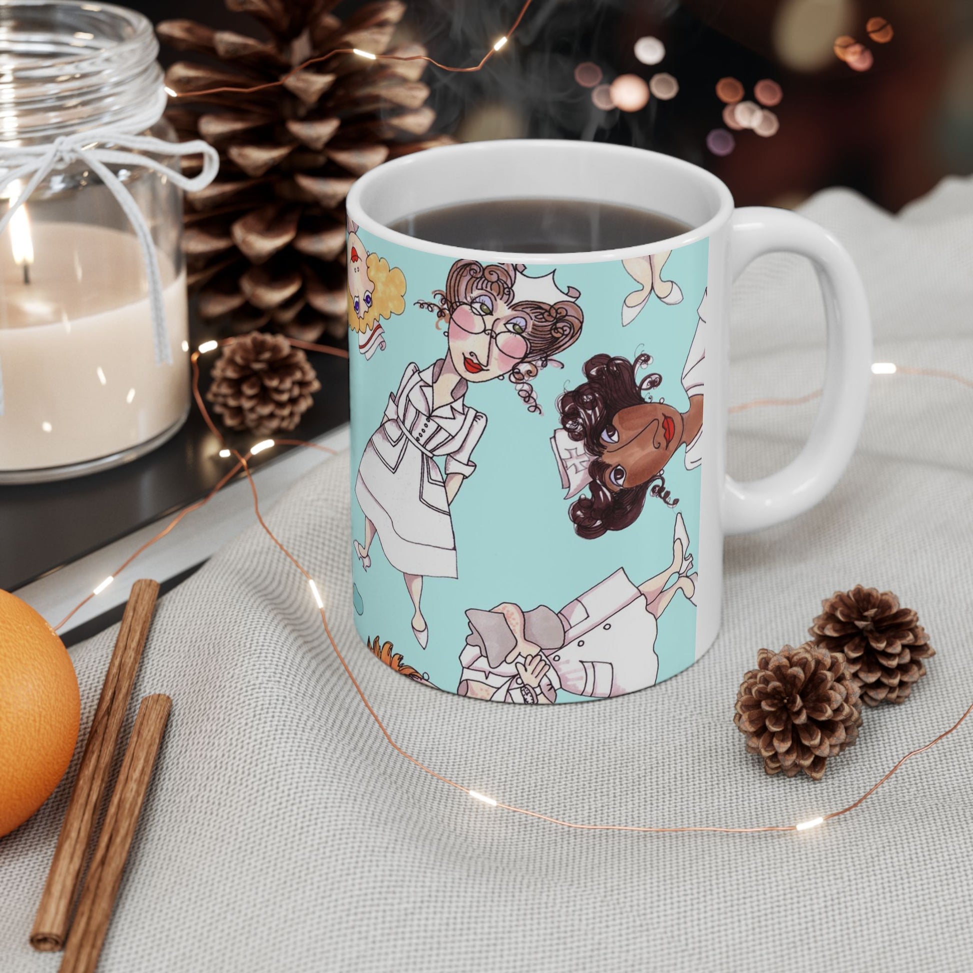 White ceramic 11oz mug with fun, colorful, Loralie sewing ladies enjoying each other's quirky company. Every project is more fun with the perfect Sewing Sisters mug! Makes a great gift!