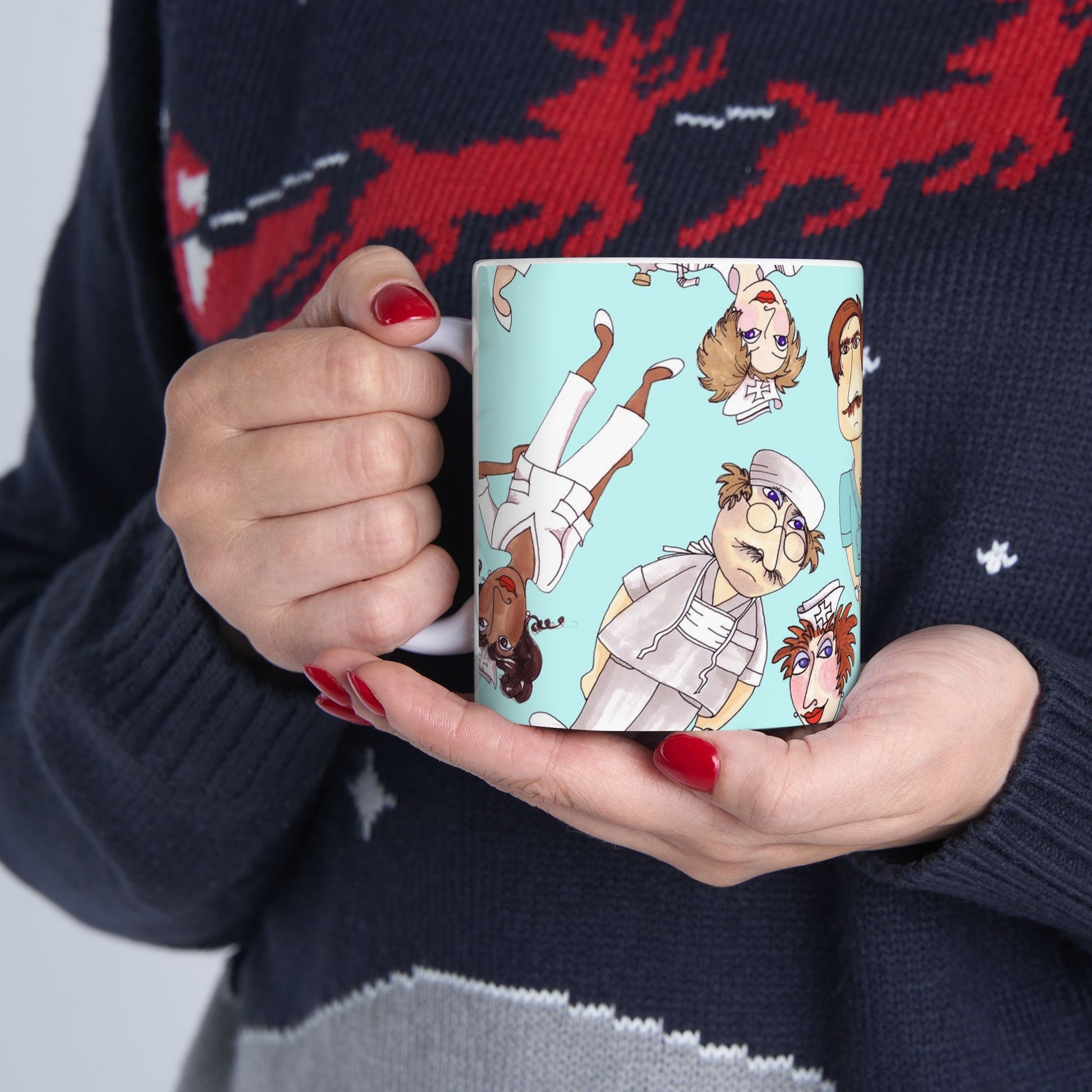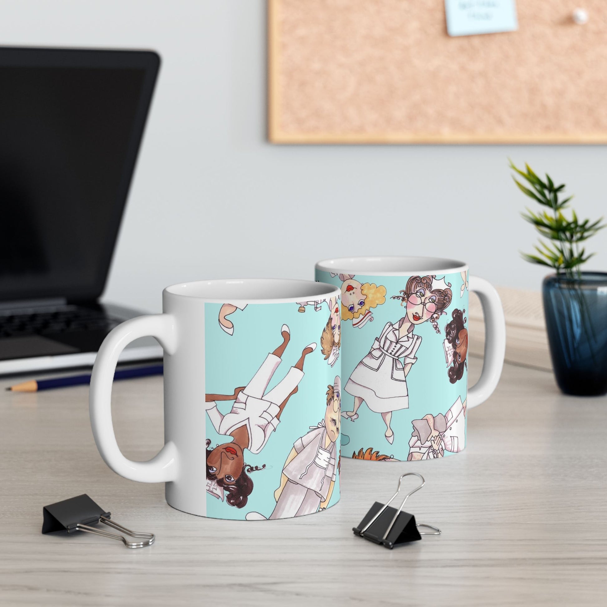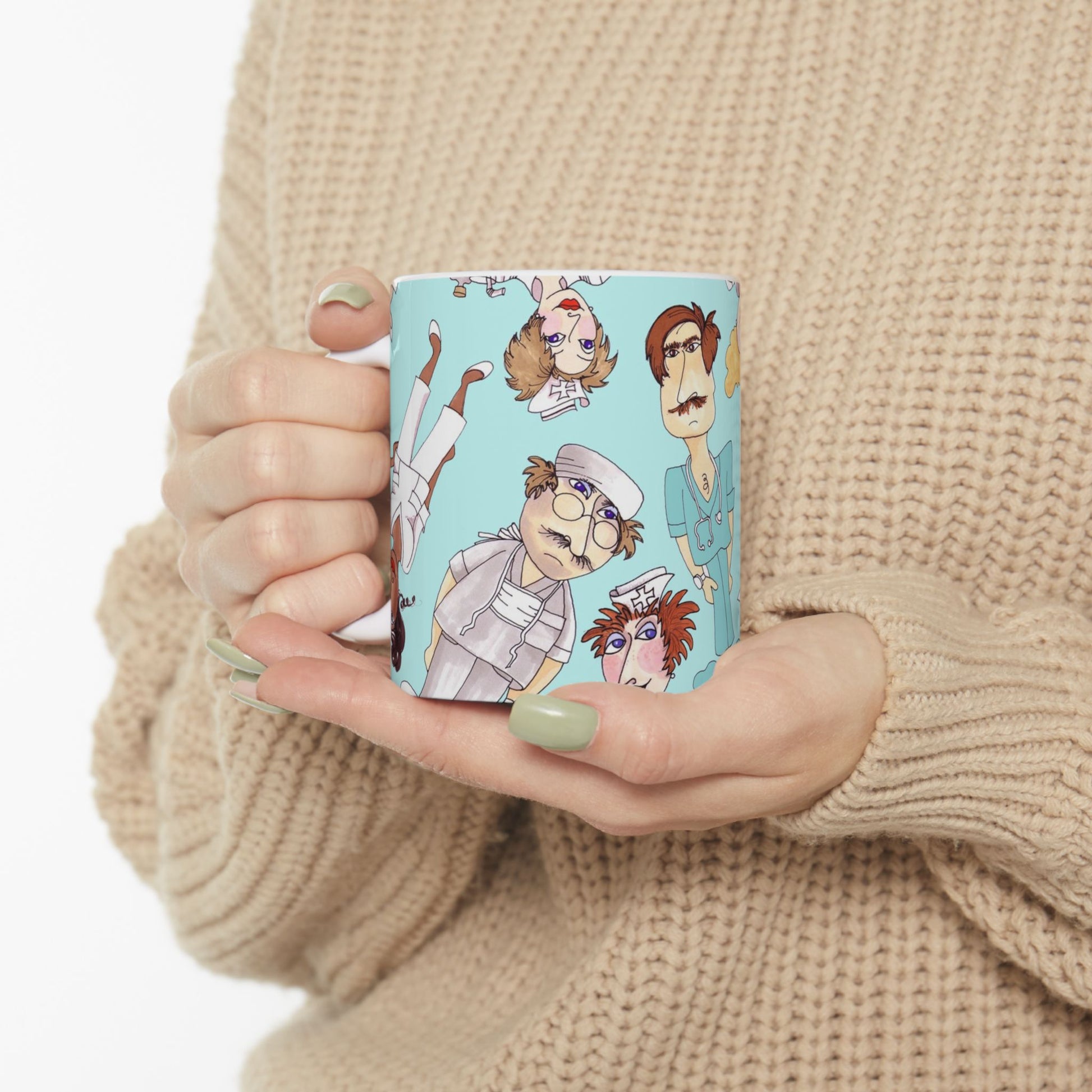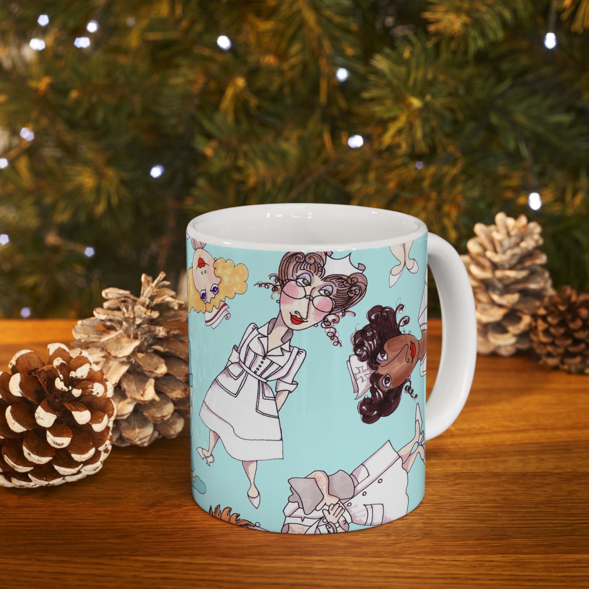 White ceramic 11oz mug with fun, colorful, Loralie sewing ladies enjoying each other's quirky company. Every project is more fun with the perfect Sewing Sisters mug! Makes a great gift!