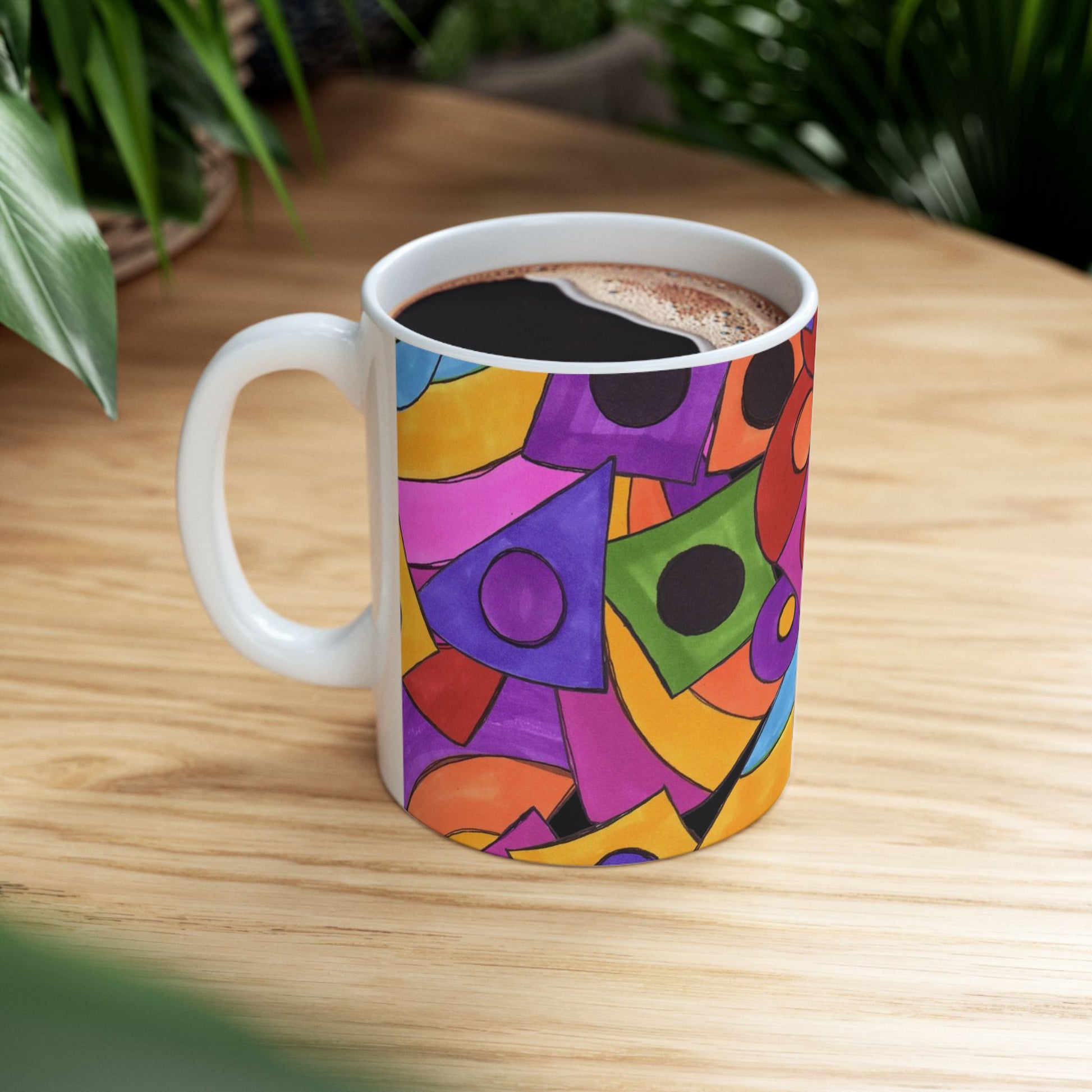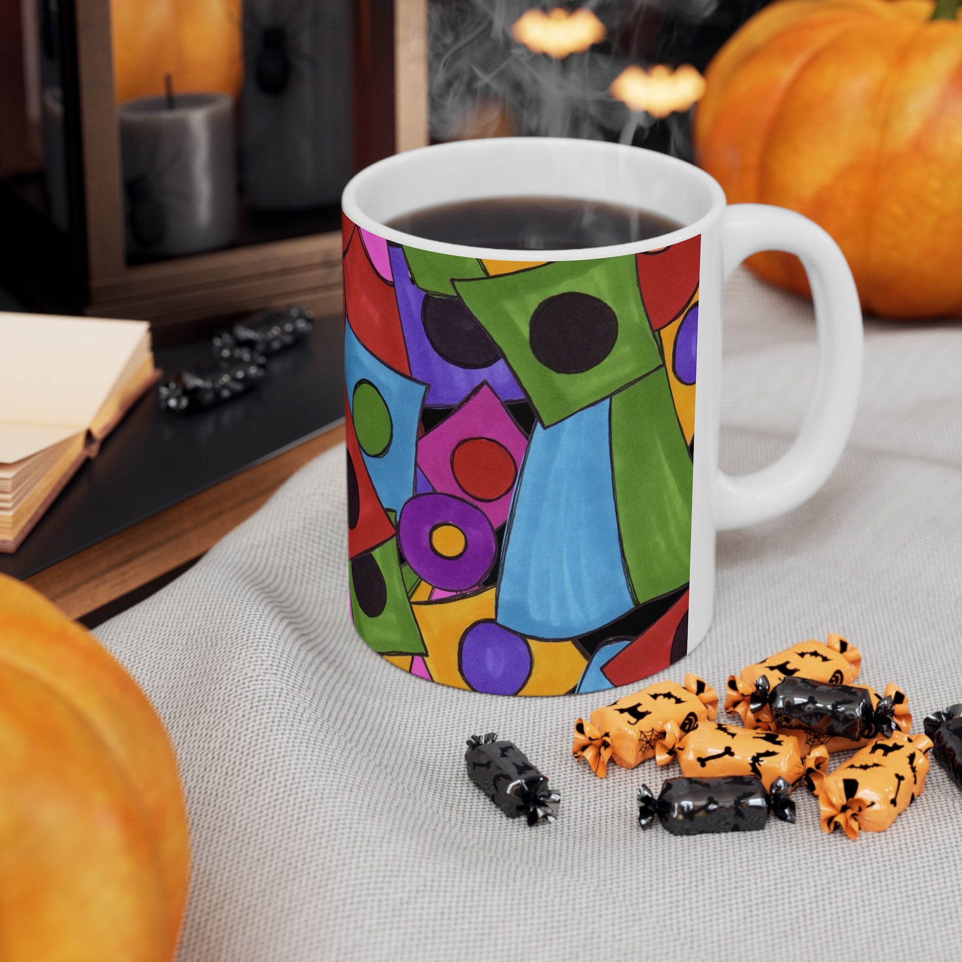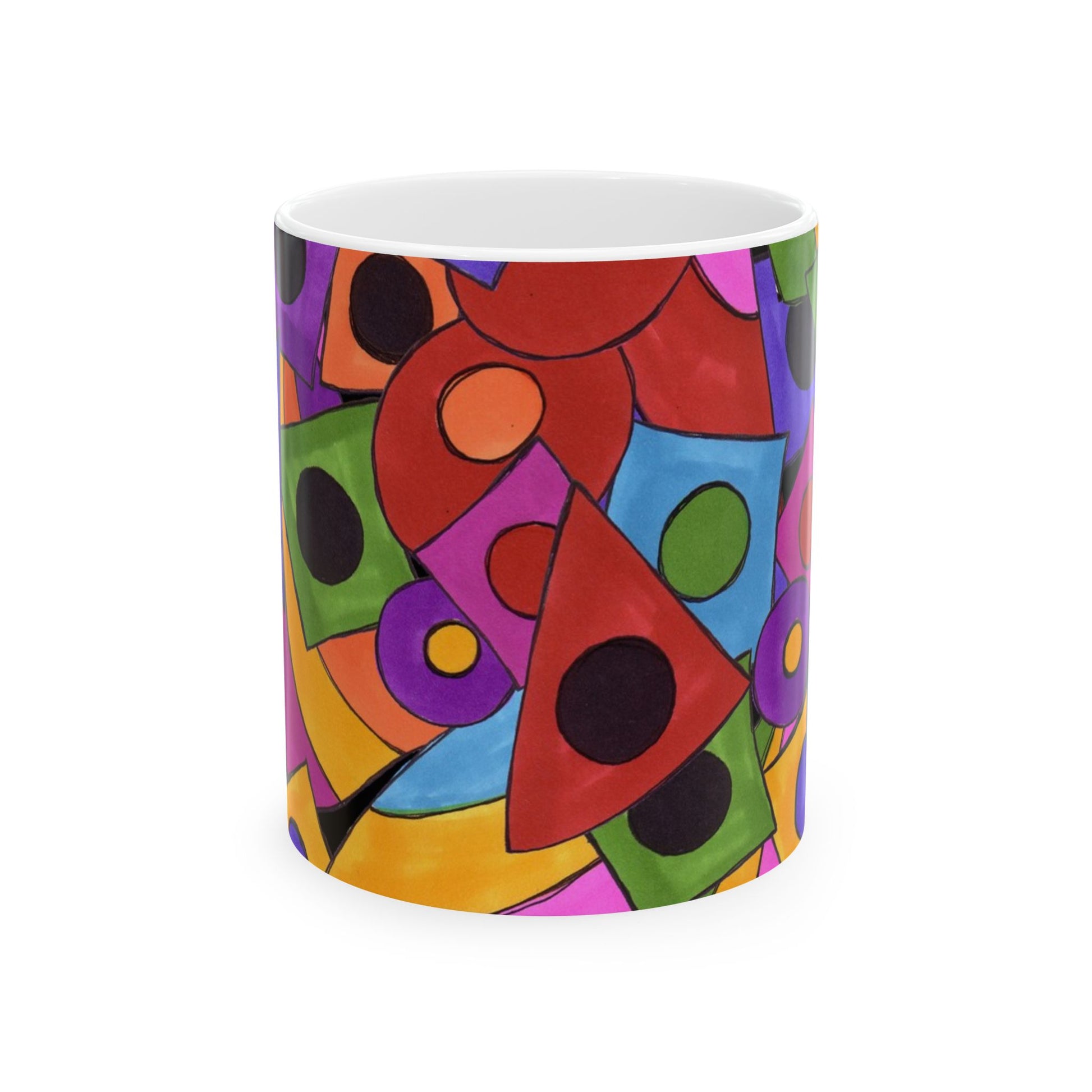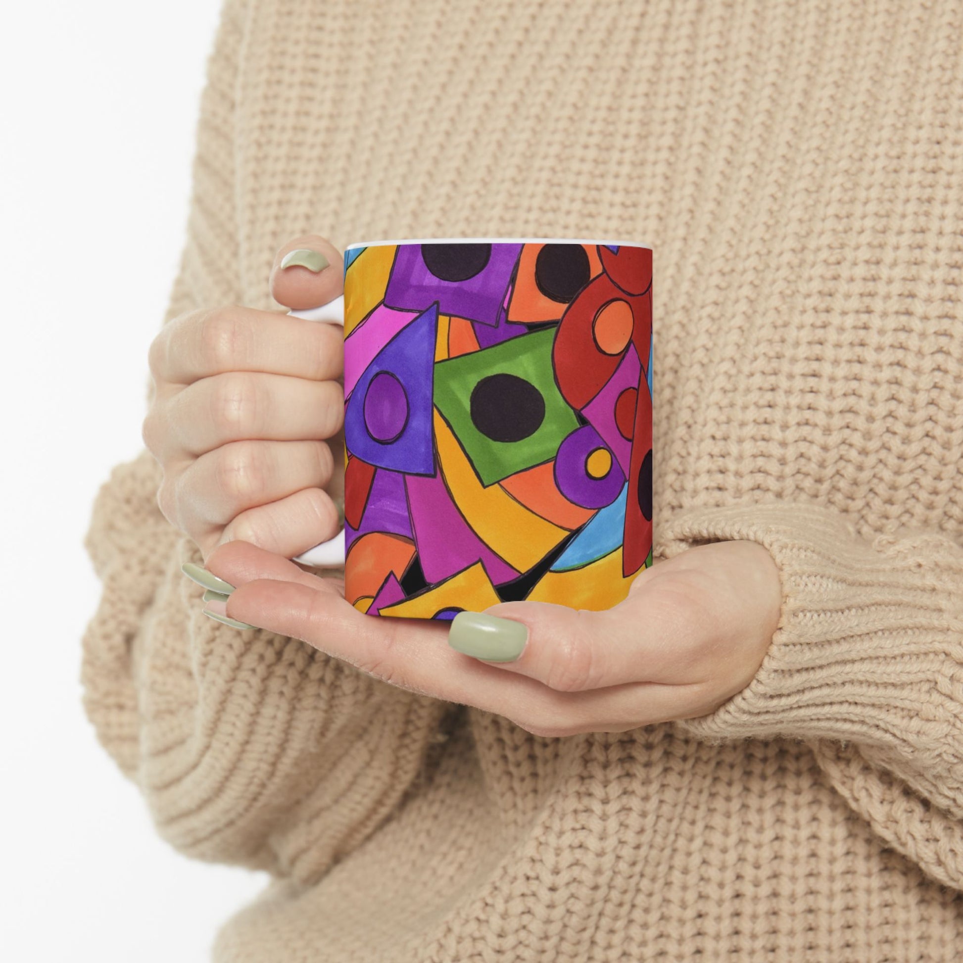 White ceramic 11oz mug with fun, colorful, Loralie sewing ladies enjoying each other's quirky company. Every project is more fun with the perfect Sewing Sisters mug! Makes a great gift!