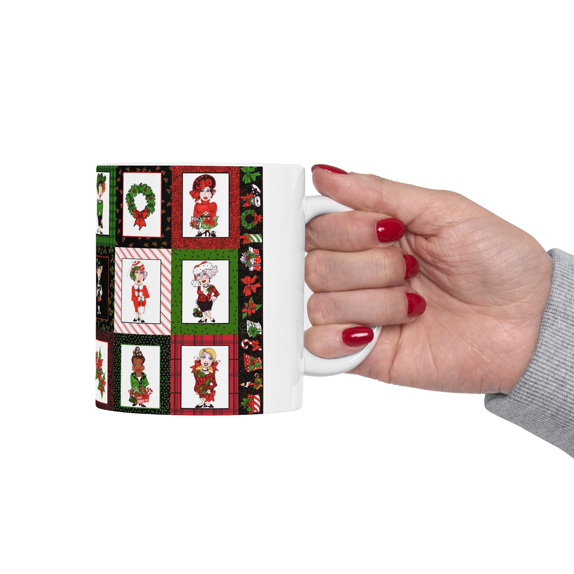 White ceramic 11oz mug with fun, colorful, Loralie sewing ladies enjoying each other's quirky company. Every project is more fun with the perfect Sewing Sisters mug! Makes a great gift!
