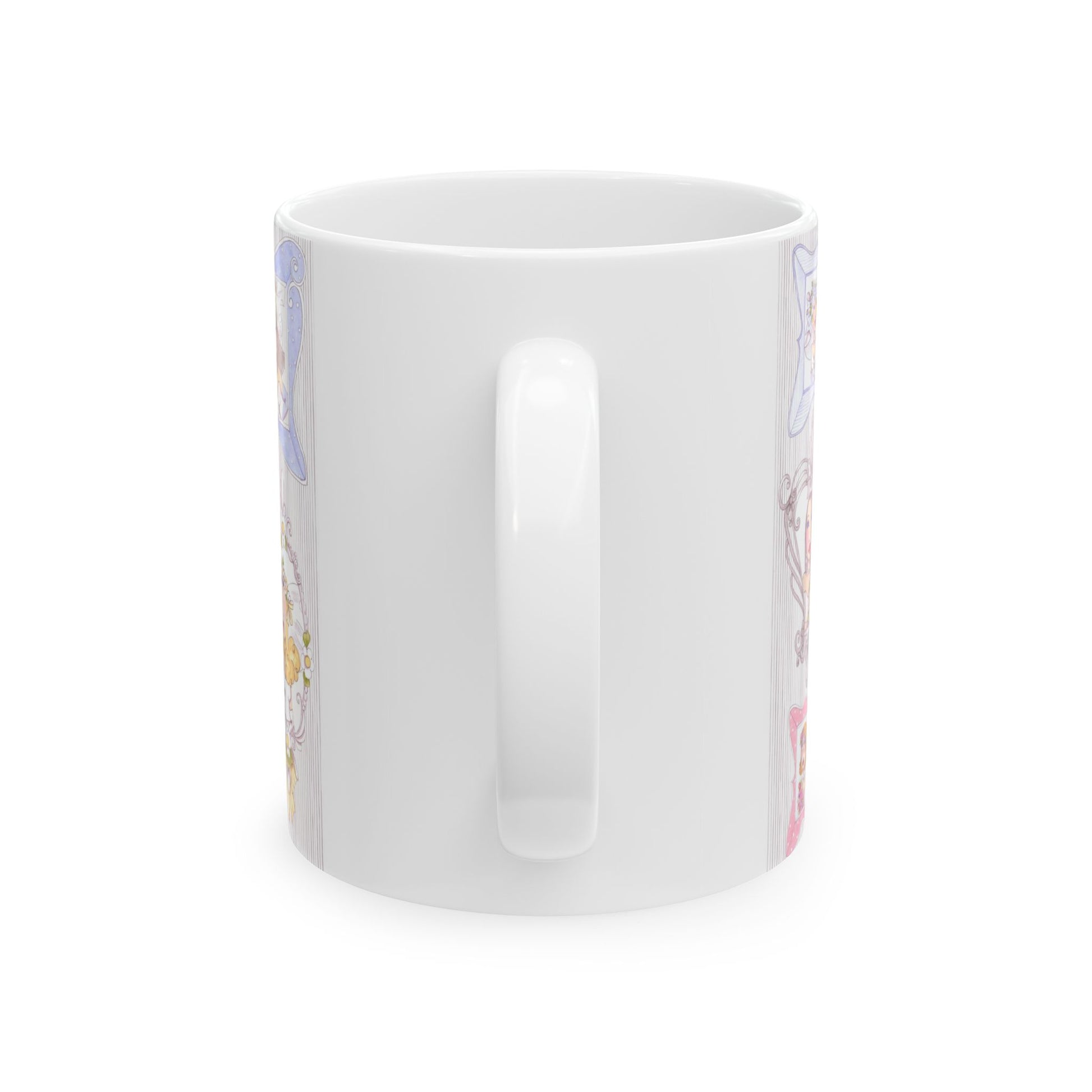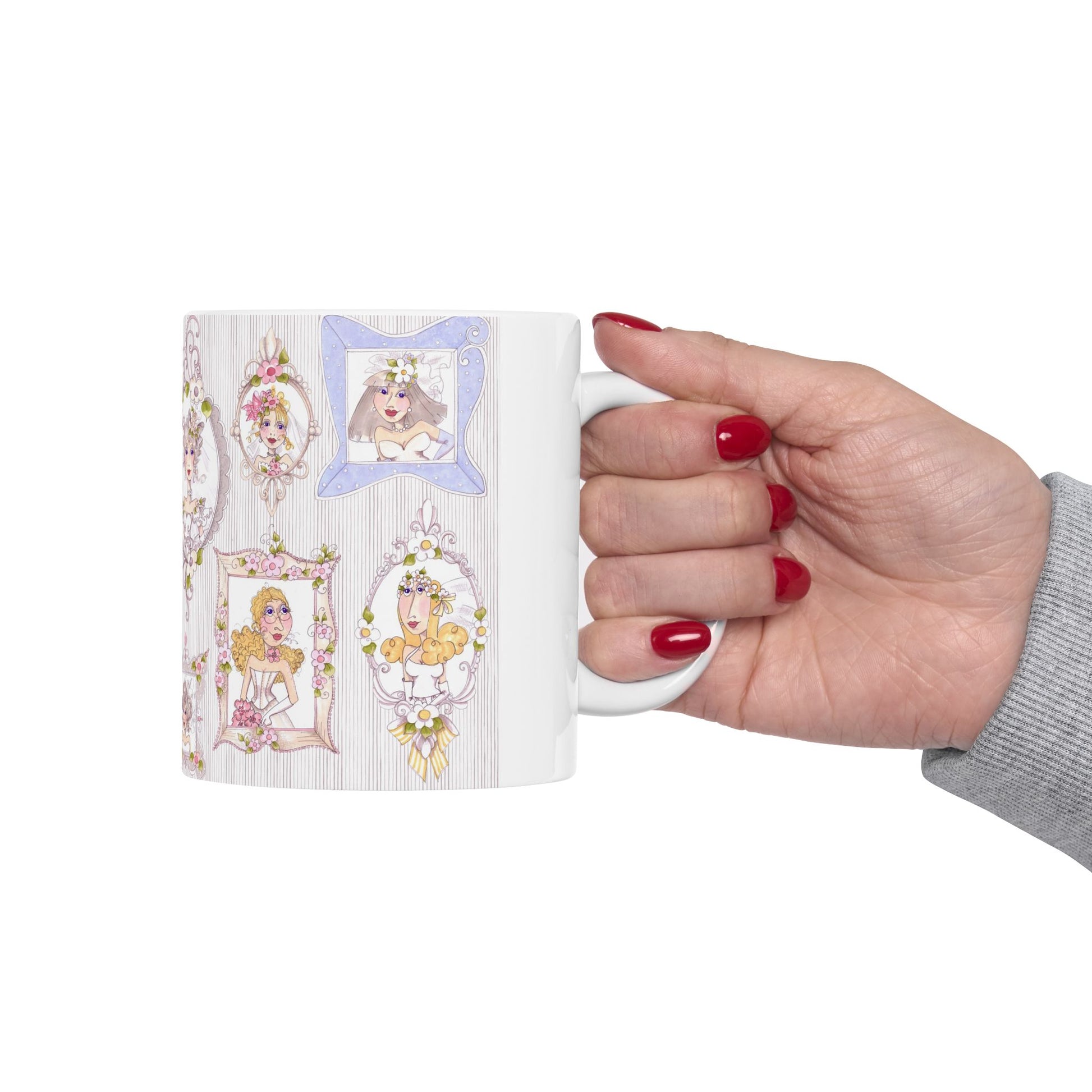 White ceramic 11oz mug with fun, colorful, Loralie sewing ladies enjoying each other's quirky company. Every project is more fun with the perfect Sewing Sisters mug! Makes a great gift!