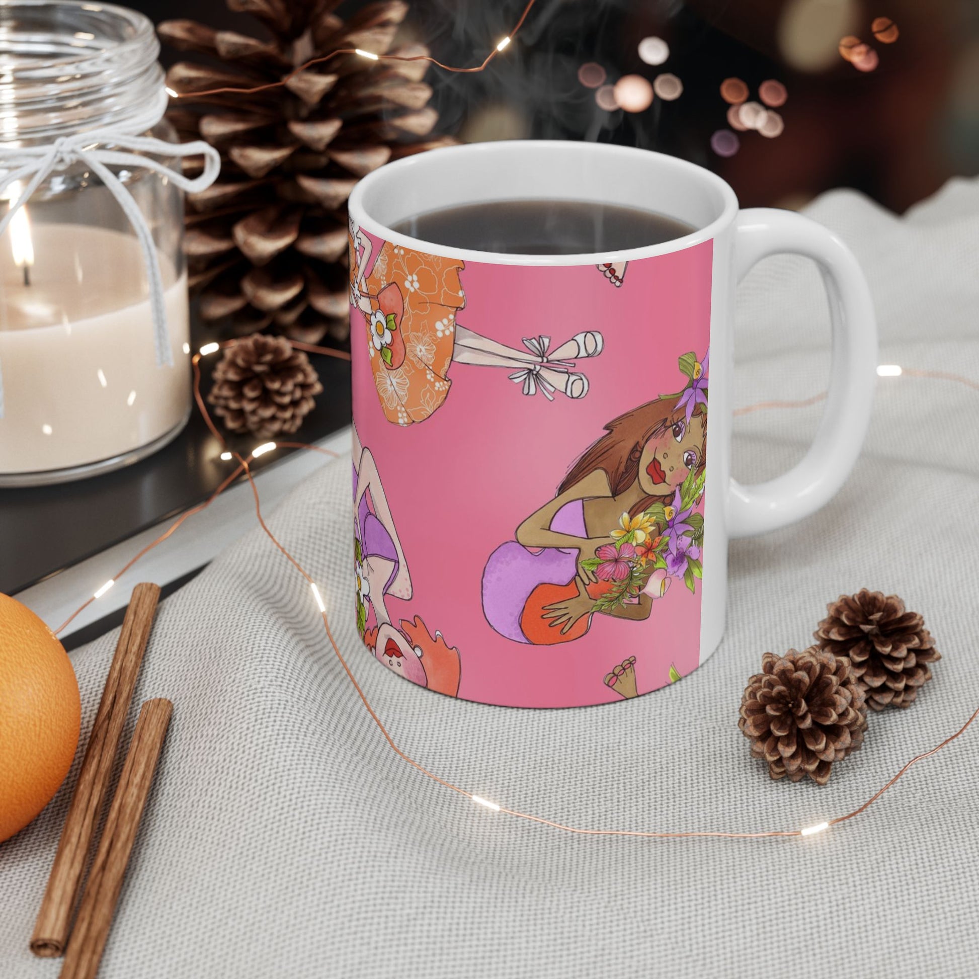 White ceramic 11oz mug with fun, colorful, Loralie sewing ladies enjoying each other's quirky company. Every project is more fun with the perfect Sewing Sisters mug! Makes a great gift!