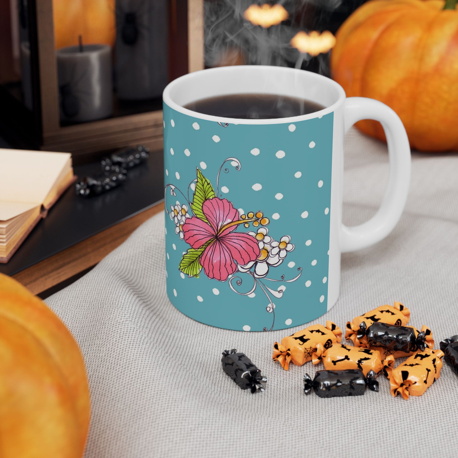 White ceramic 11oz mug with fun, colorful, Loralie sewing ladies enjoying each other's quirky company. Every project is more fun with the perfect Sewing Sisters mug! Makes a great gift!