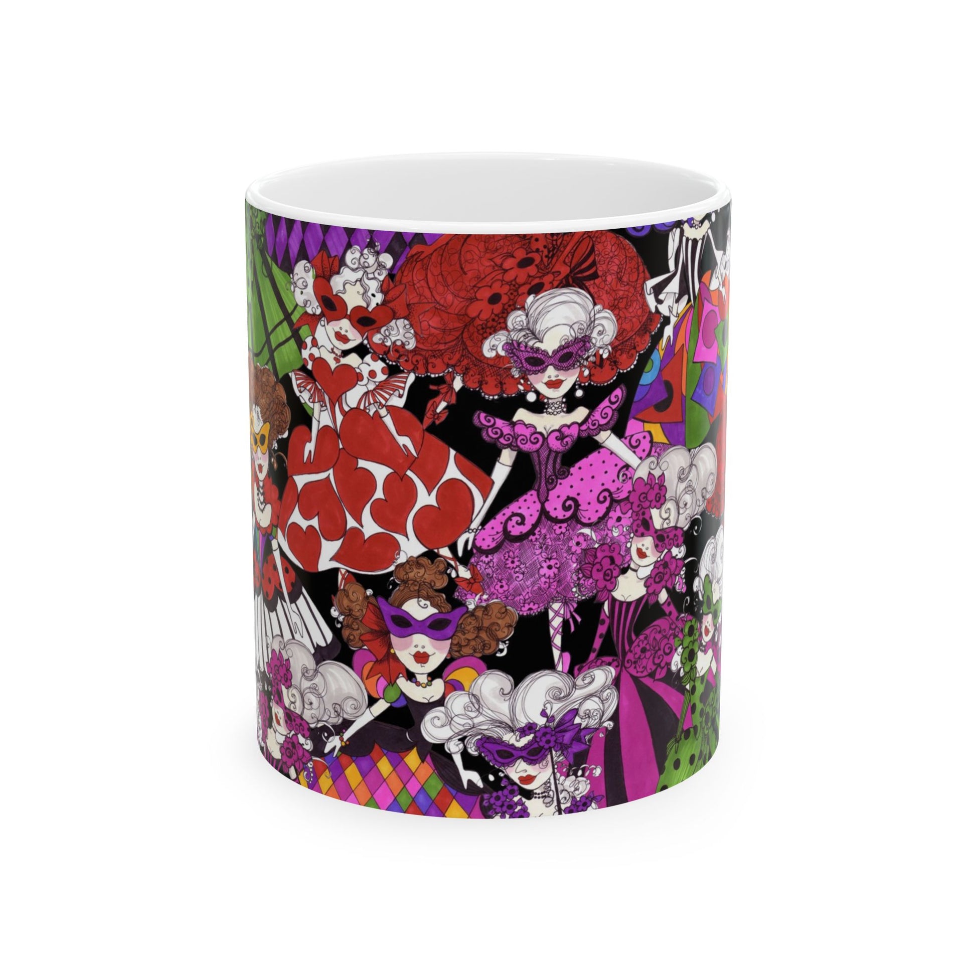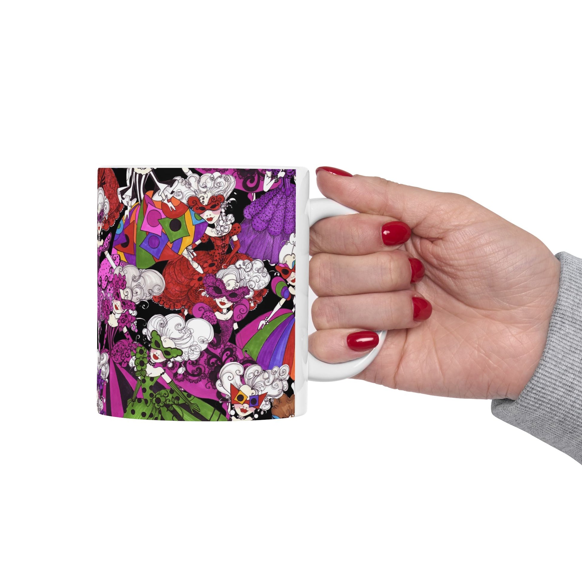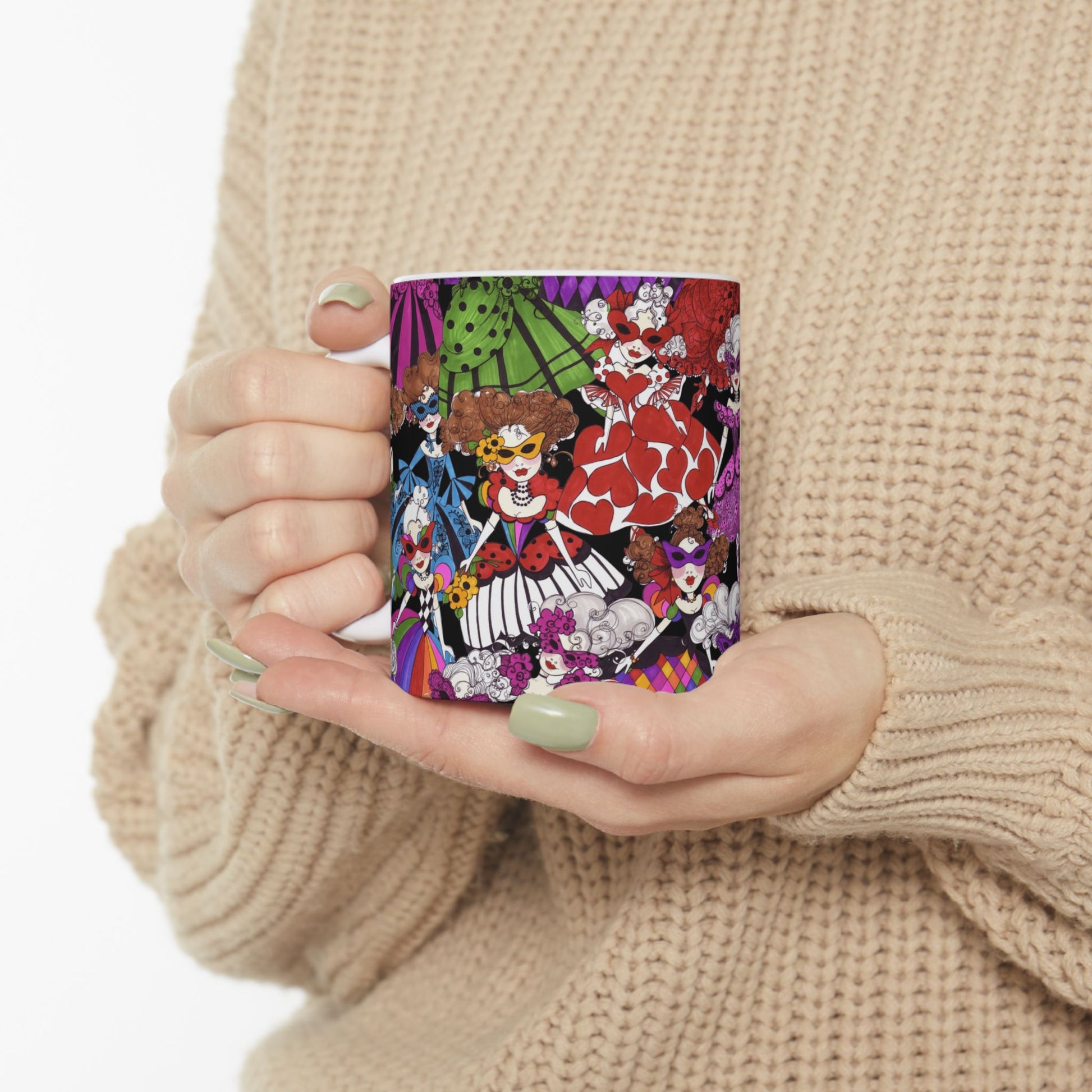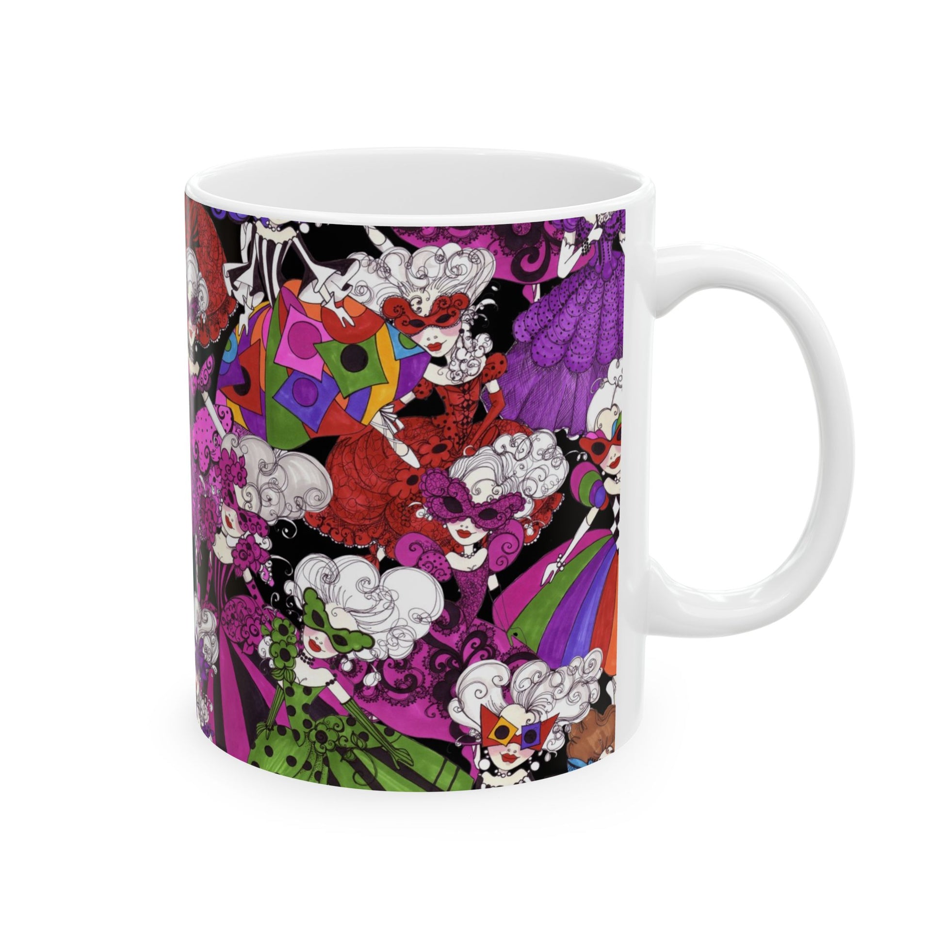 White ceramic 11oz mug with fun, colorful, Loralie sewing ladies enjoying each other's quirky company. Every project is more fun with the perfect Sewing Sisters mug! Makes a great gift!