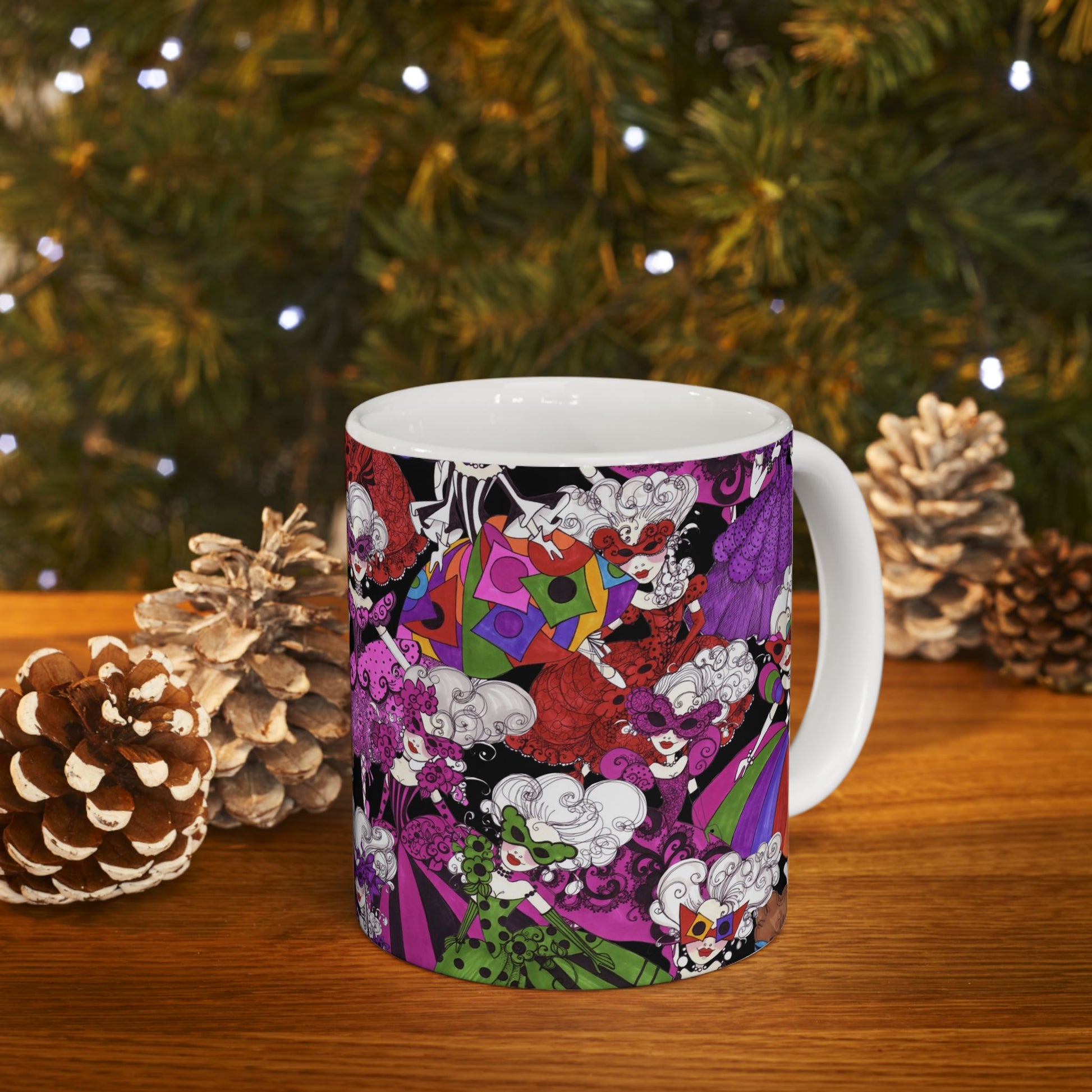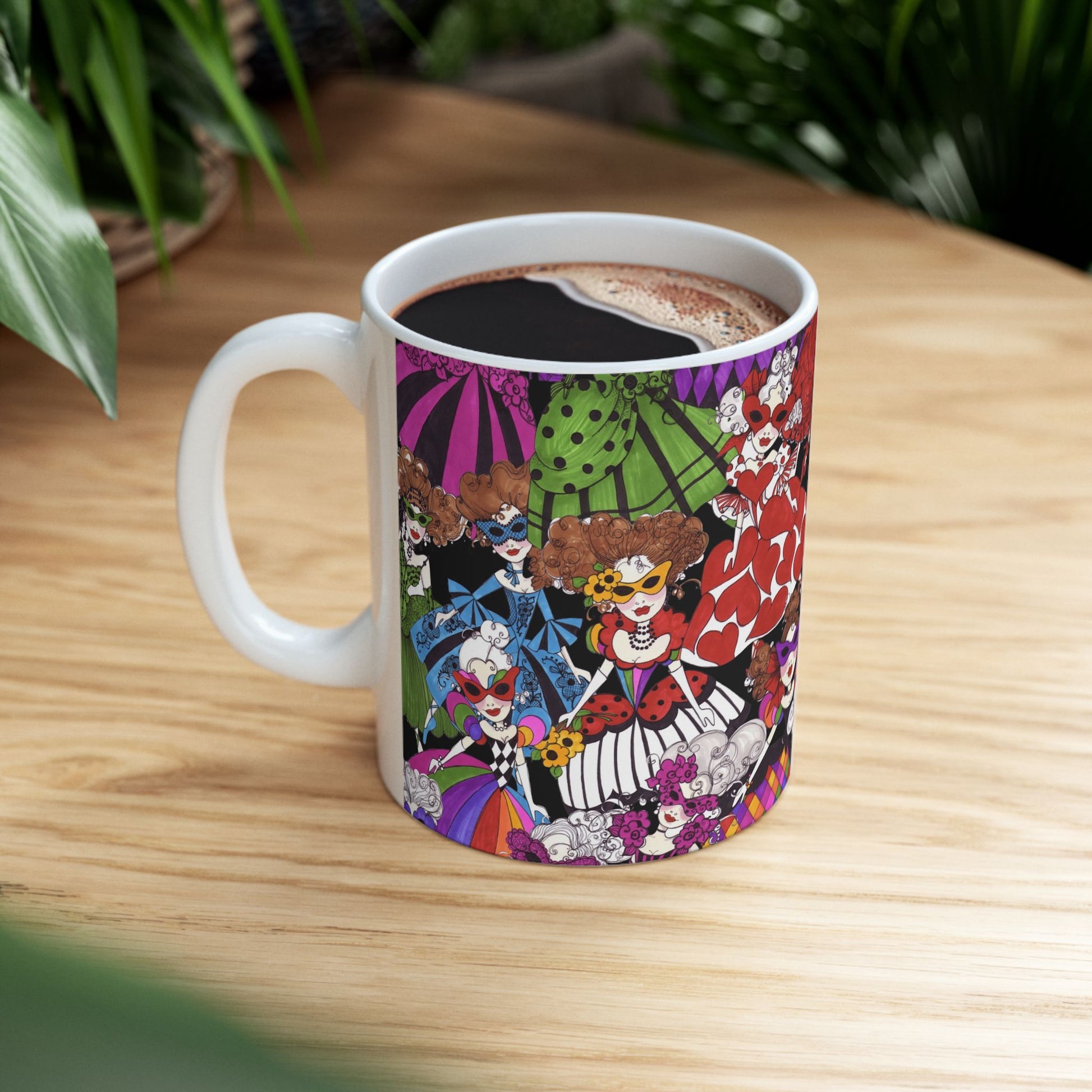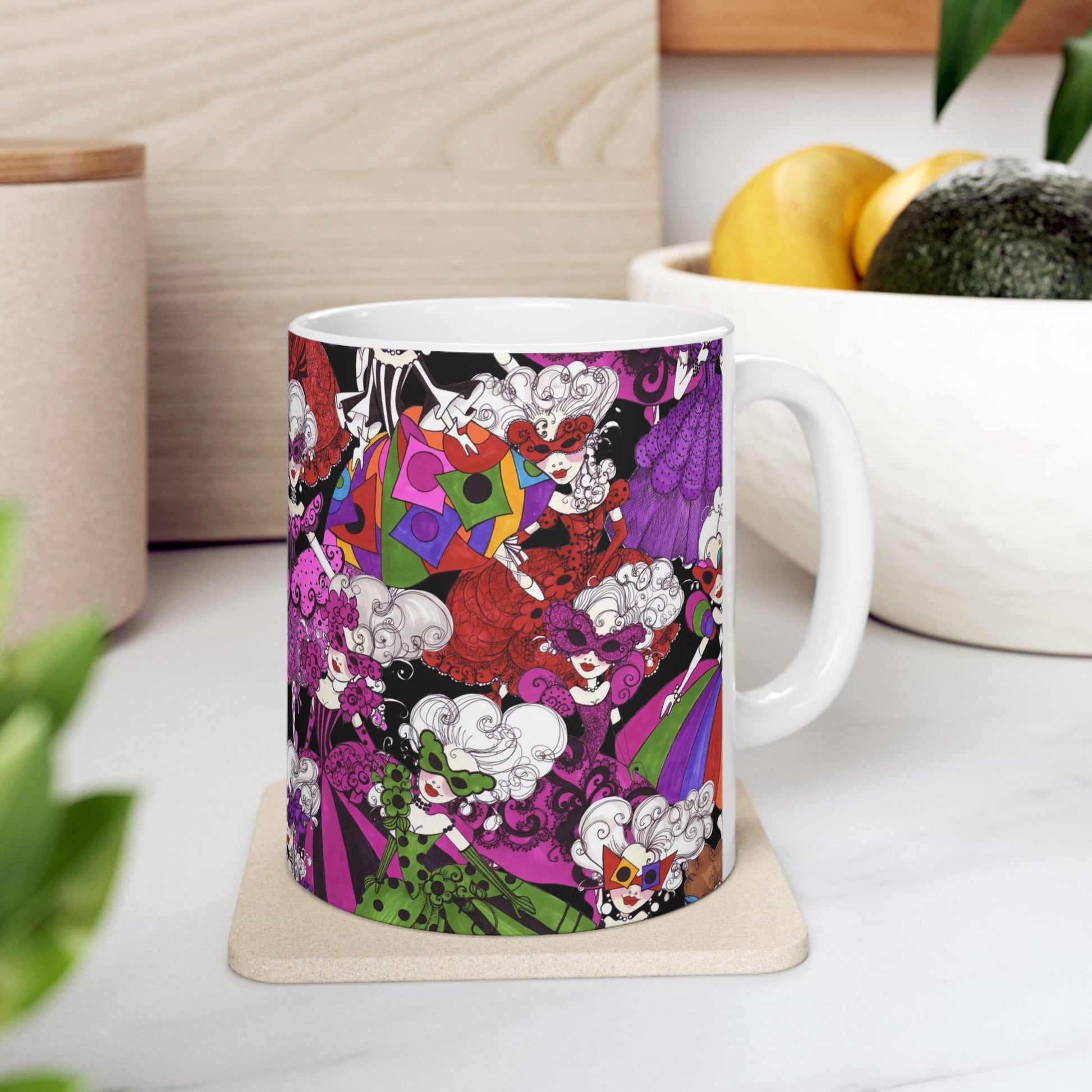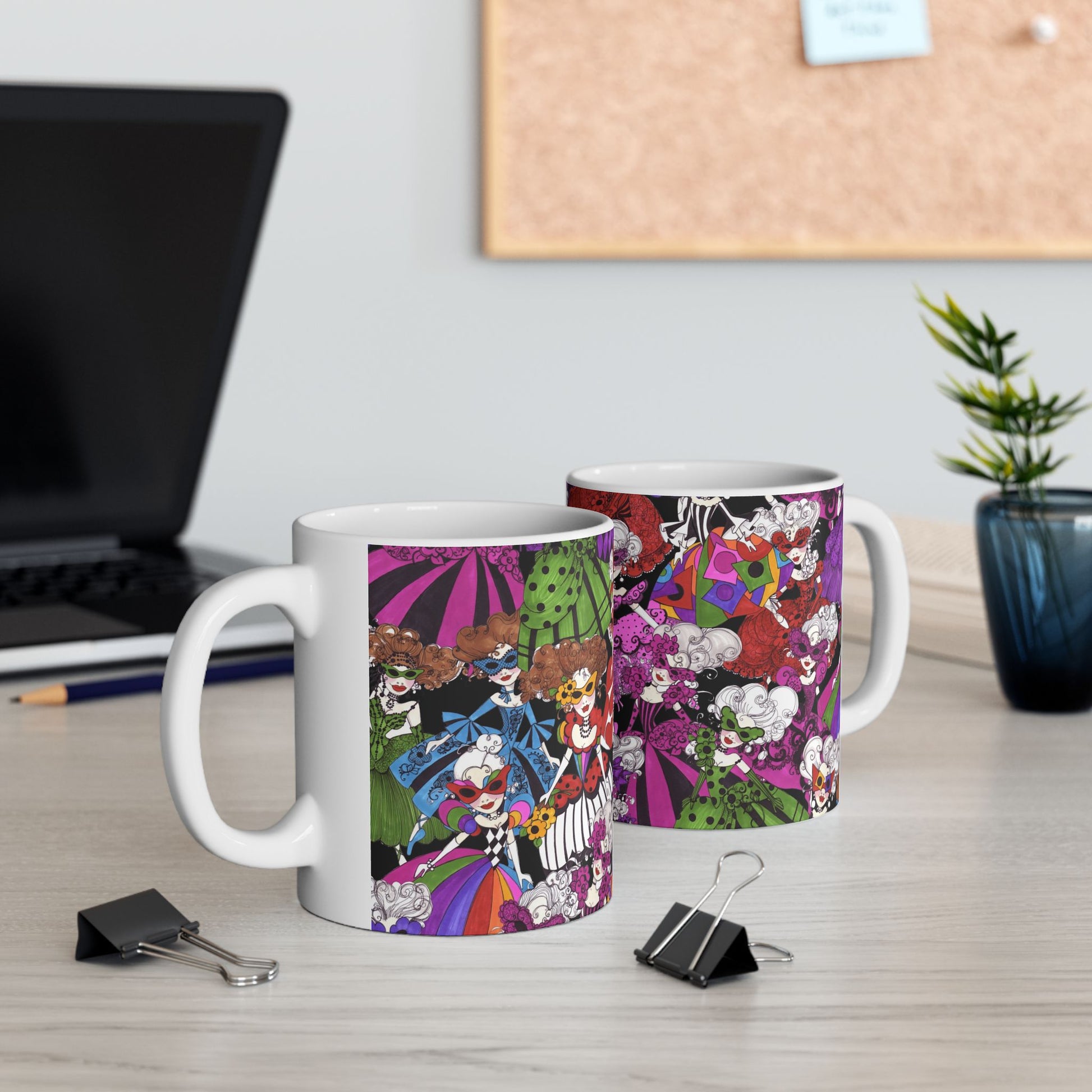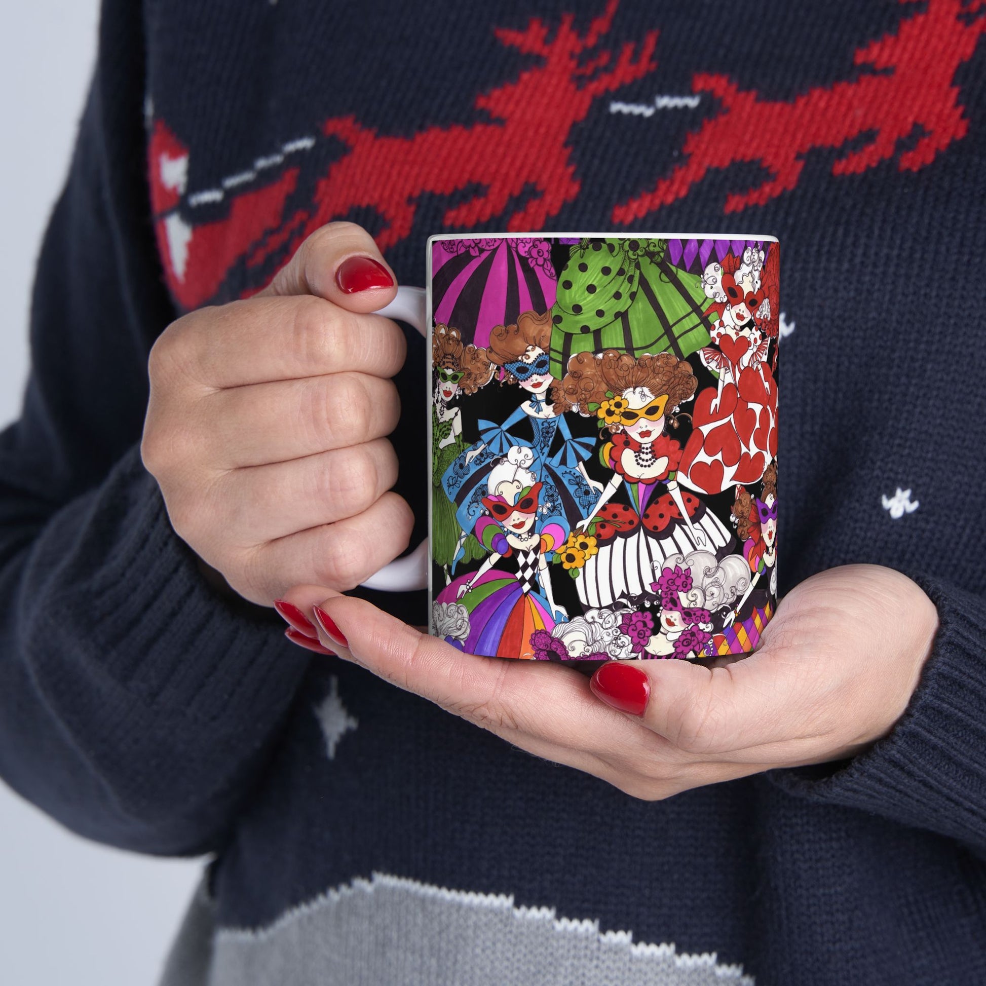 White ceramic 11oz mug with fun, colorful, Loralie sewing ladies enjoying each other's quirky company. Every project is more fun with the perfect Sewing Sisters mug! Makes a great gift!