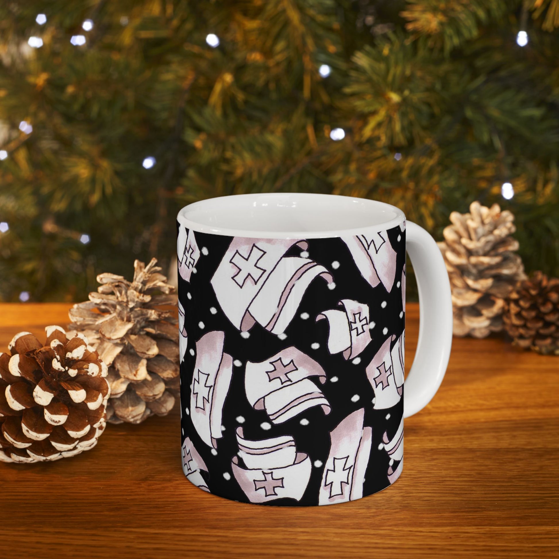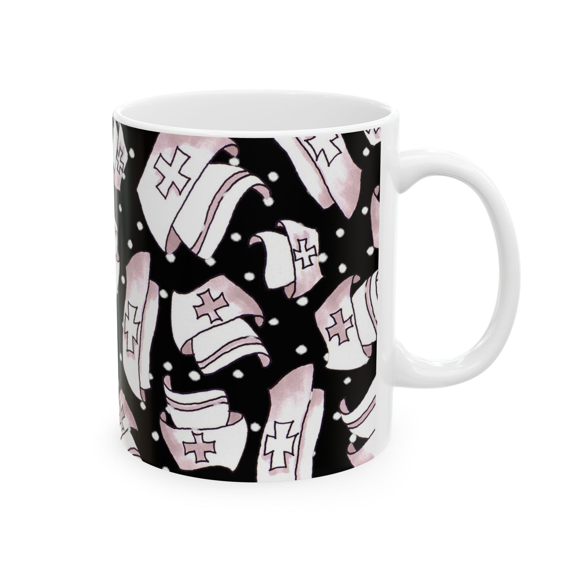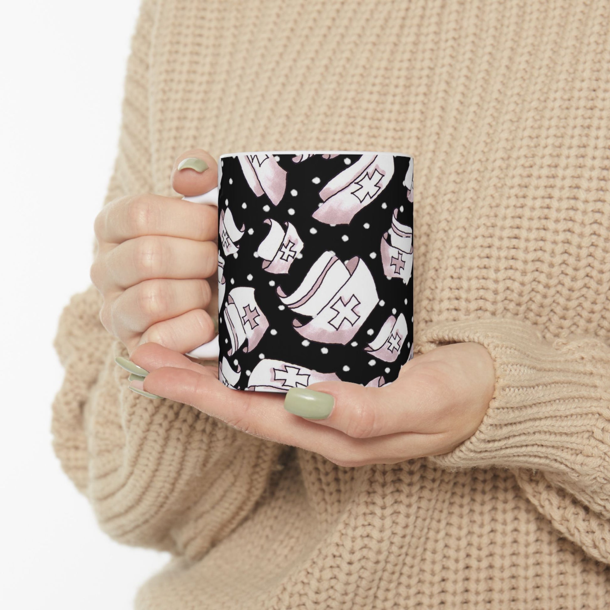 White ceramic 11oz mug with fun, colorful, Loralie sewing ladies enjoying each other's quirky company. Every project is more fun with the perfect Sewing Sisters mug! Makes a great gift!