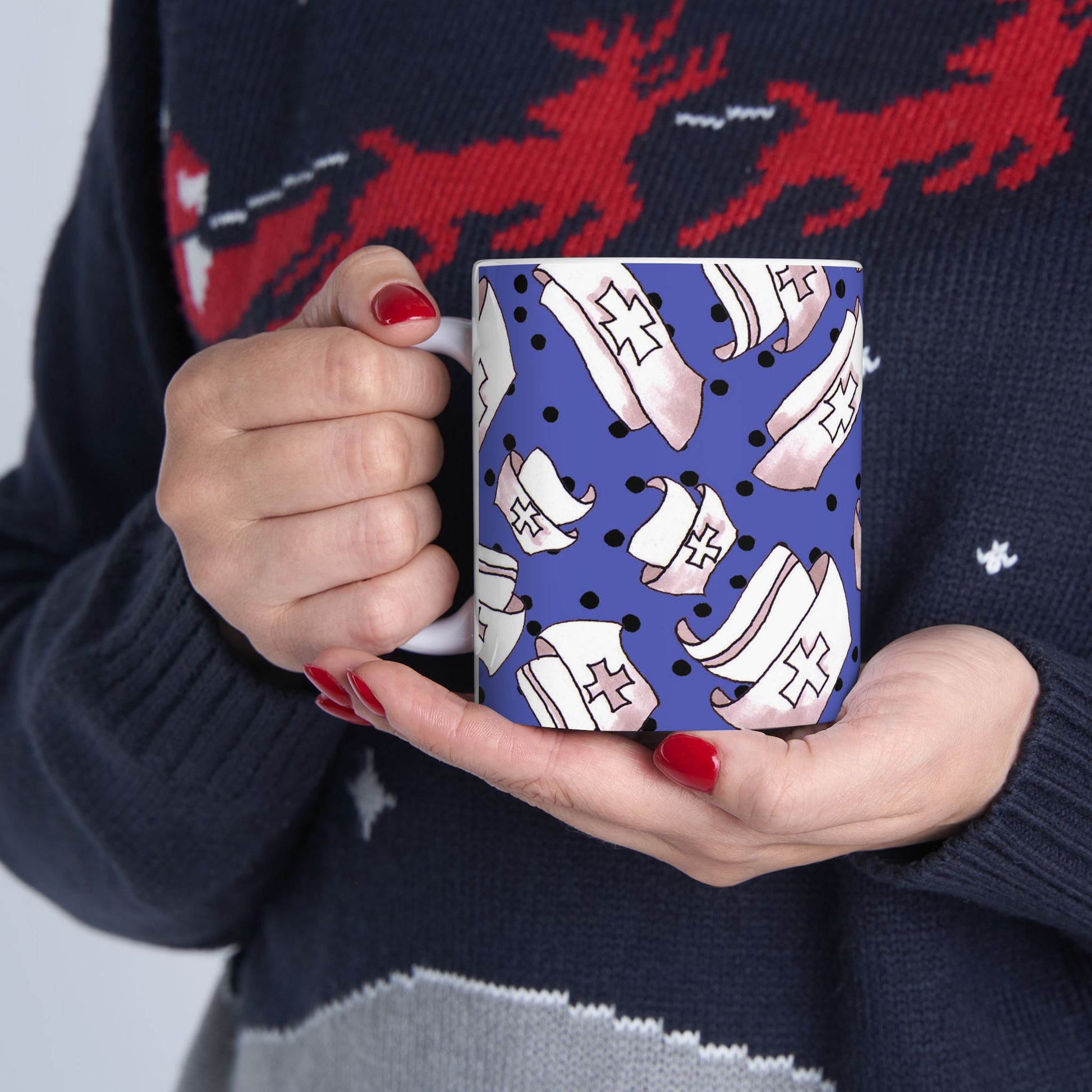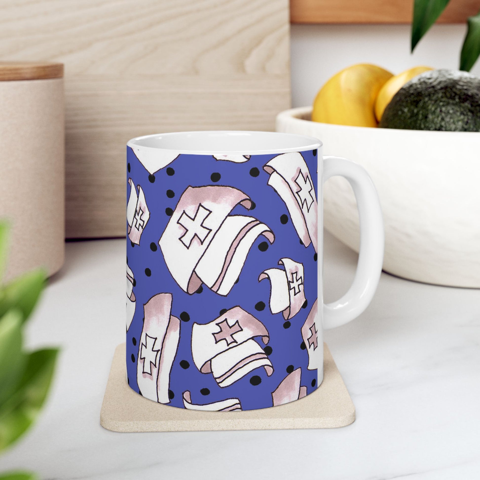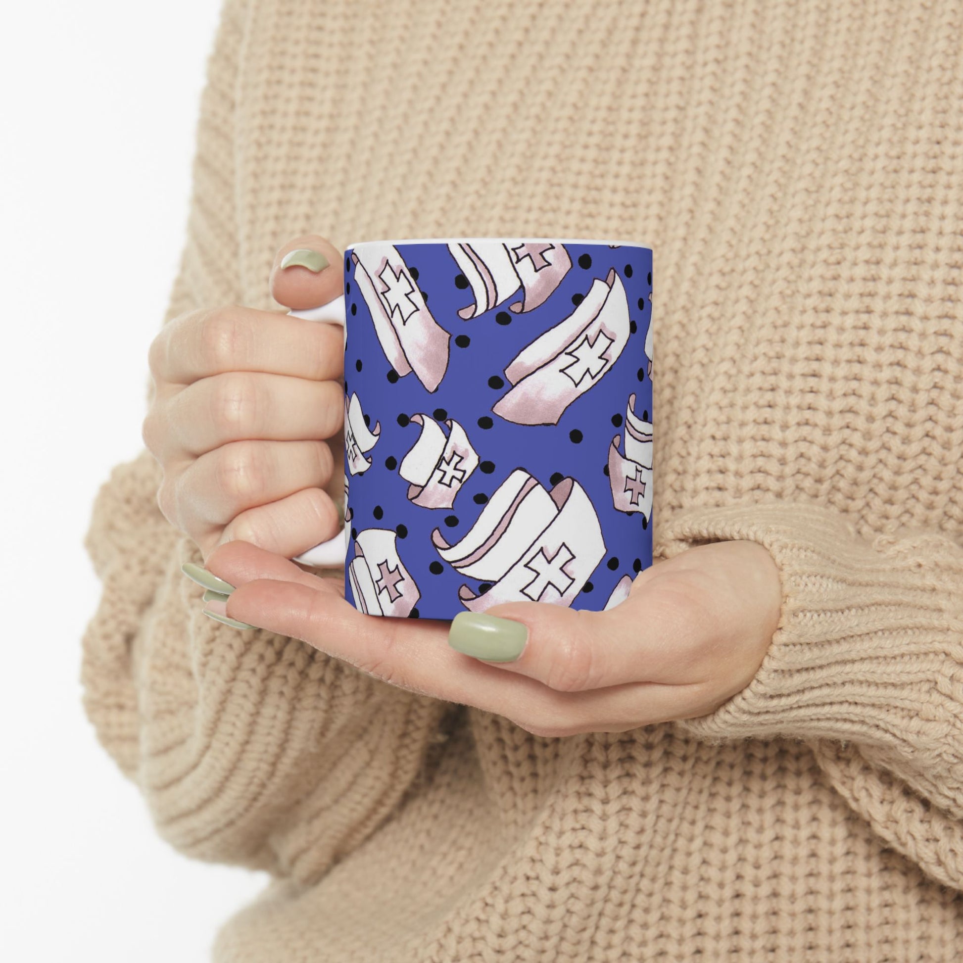 White ceramic 11oz mug with fun, colorful, Loralie sewing ladies enjoying each other's quirky company. Every project is more fun with the perfect Sewing Sisters mug! Makes a great gift!