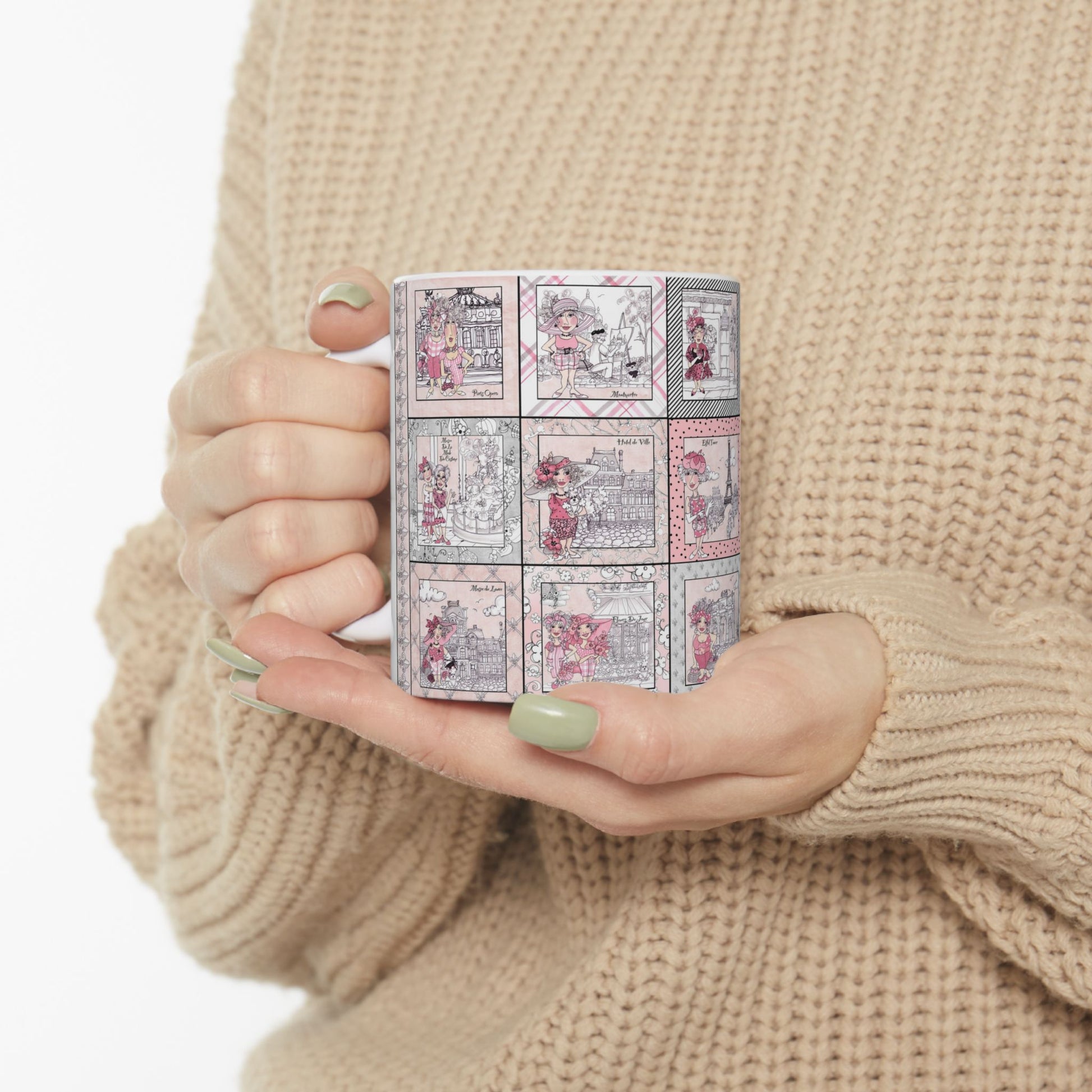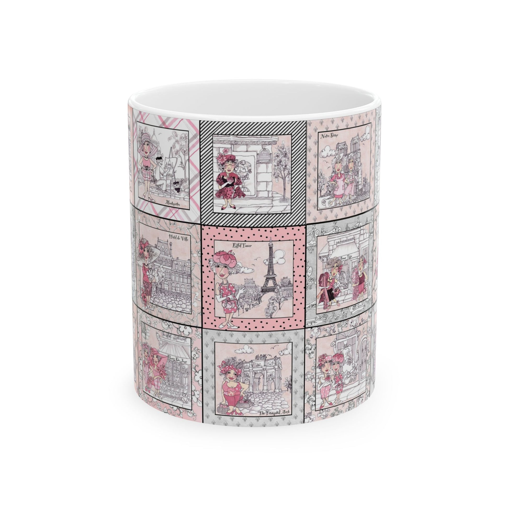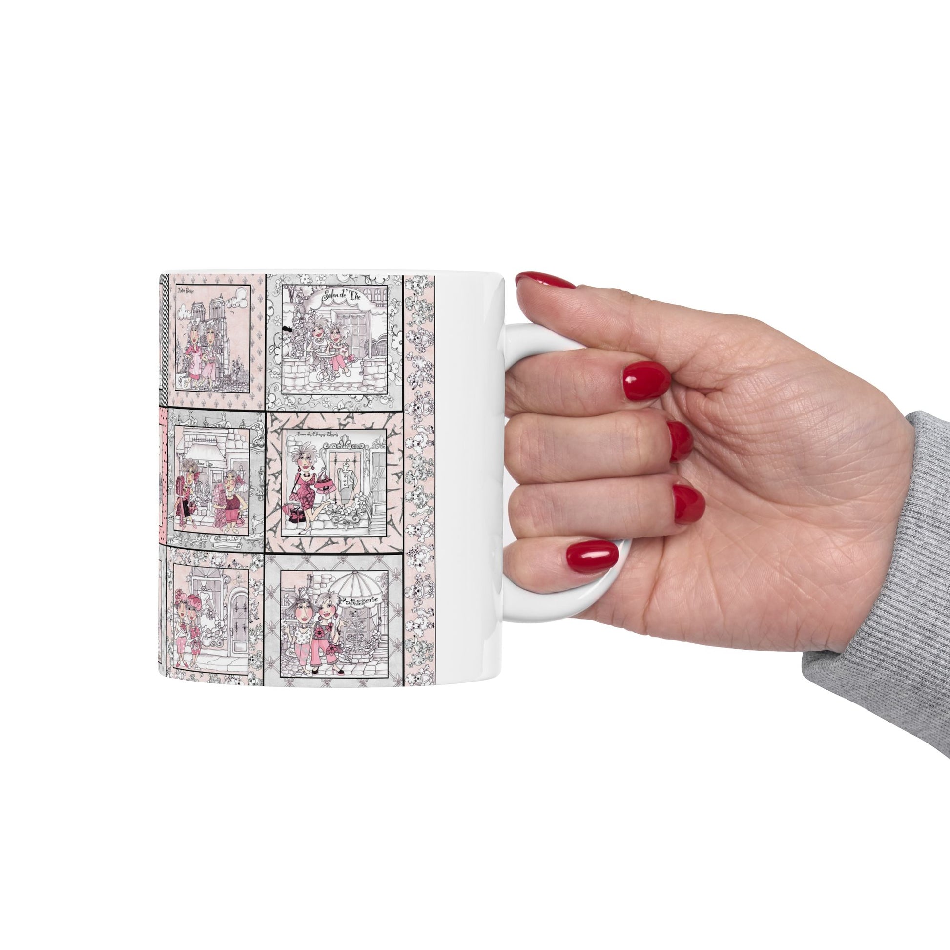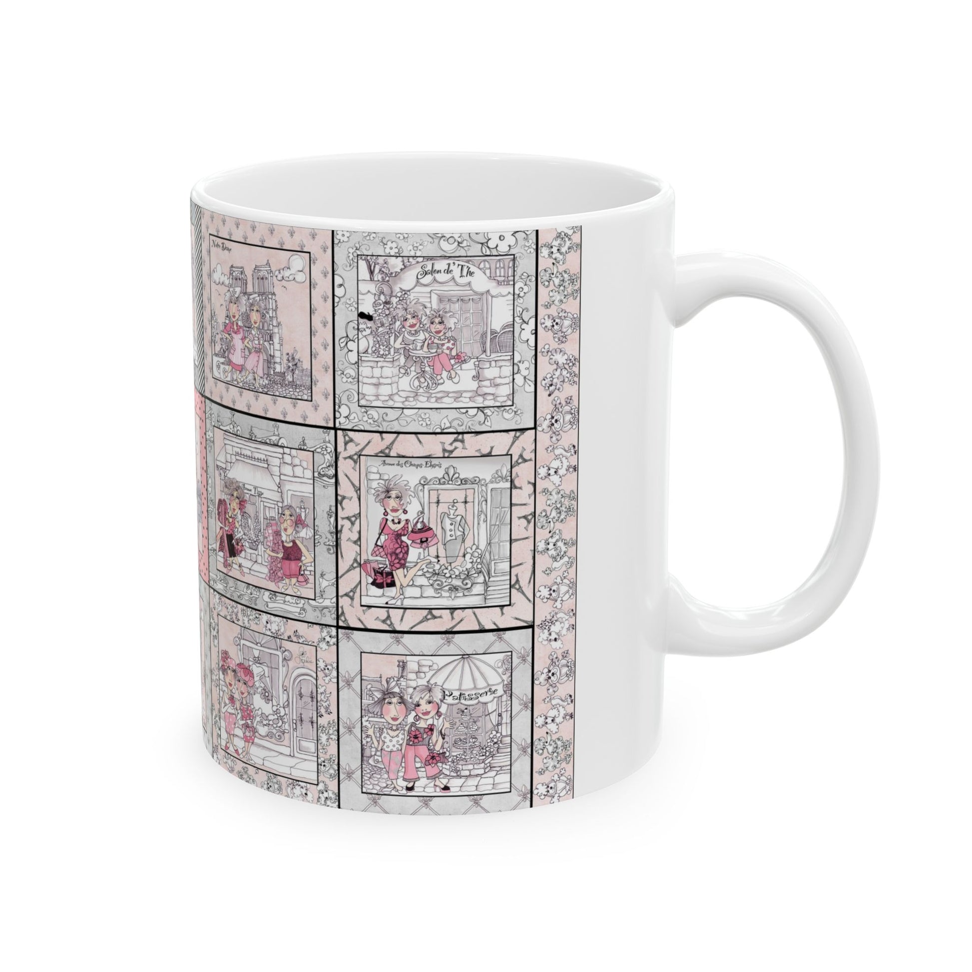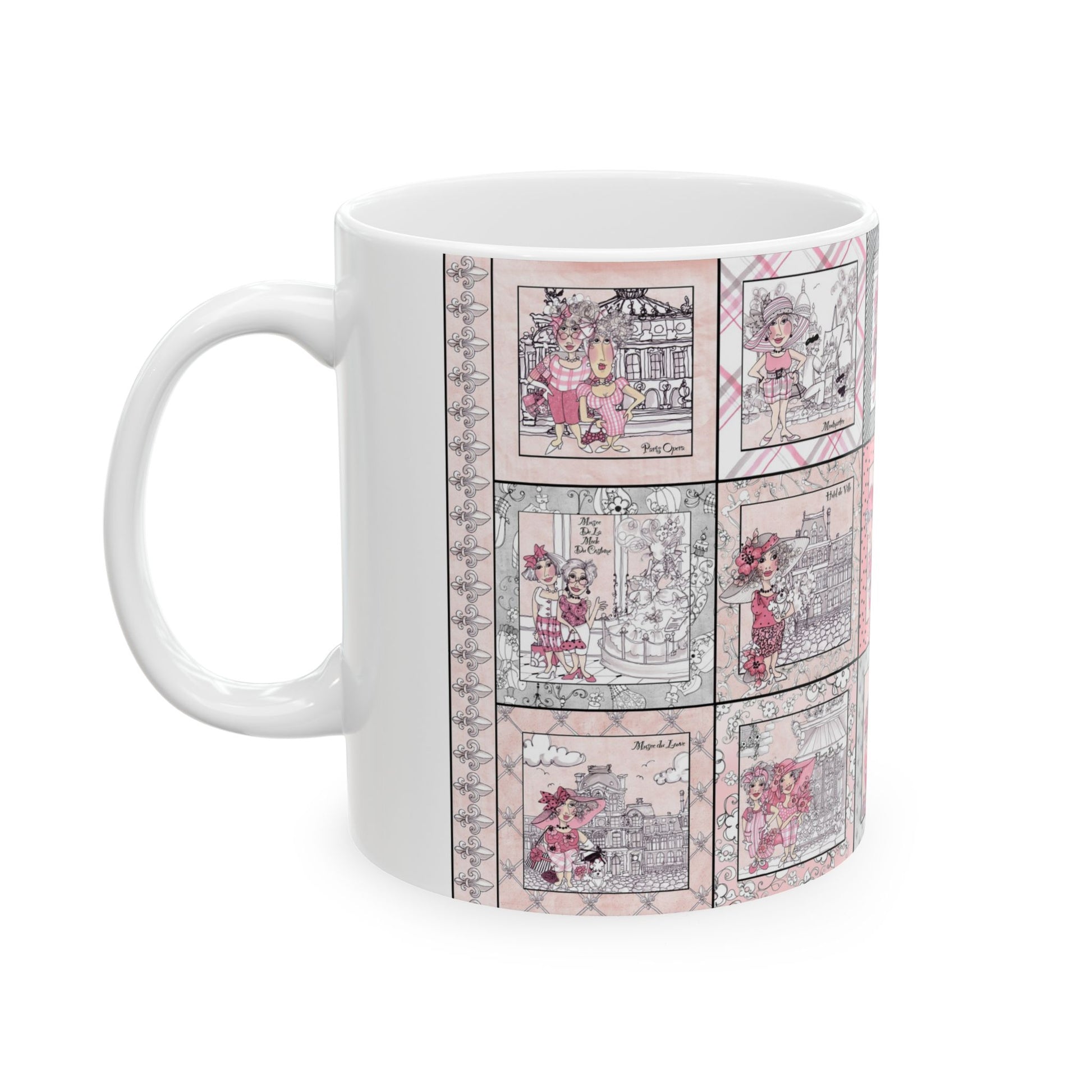 White ceramic 11oz mug with fun, colorful, Loralie sewing ladies enjoying each other's quirky company. Every project is more fun with the perfect Sewing Sisters mug! Makes a great gift!
