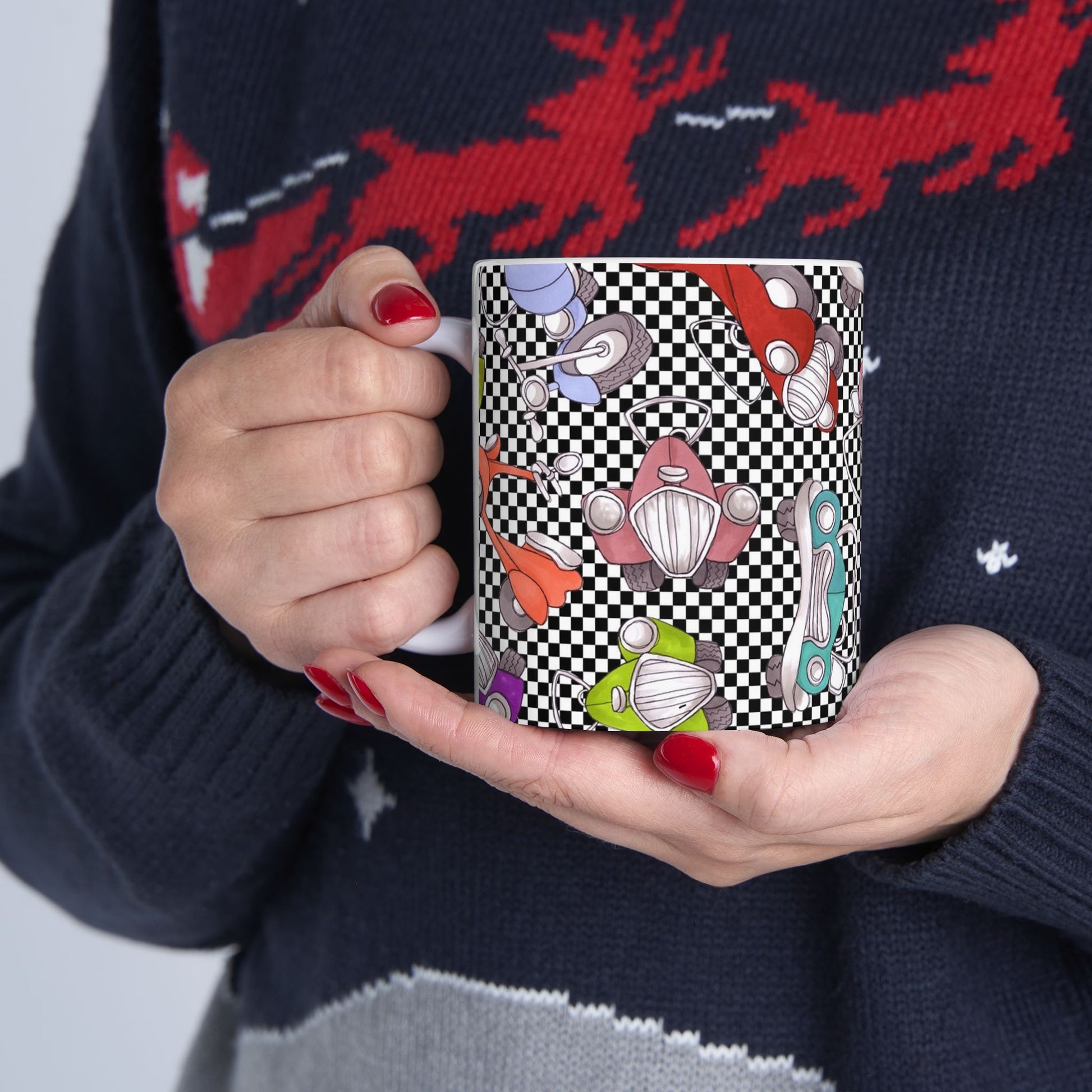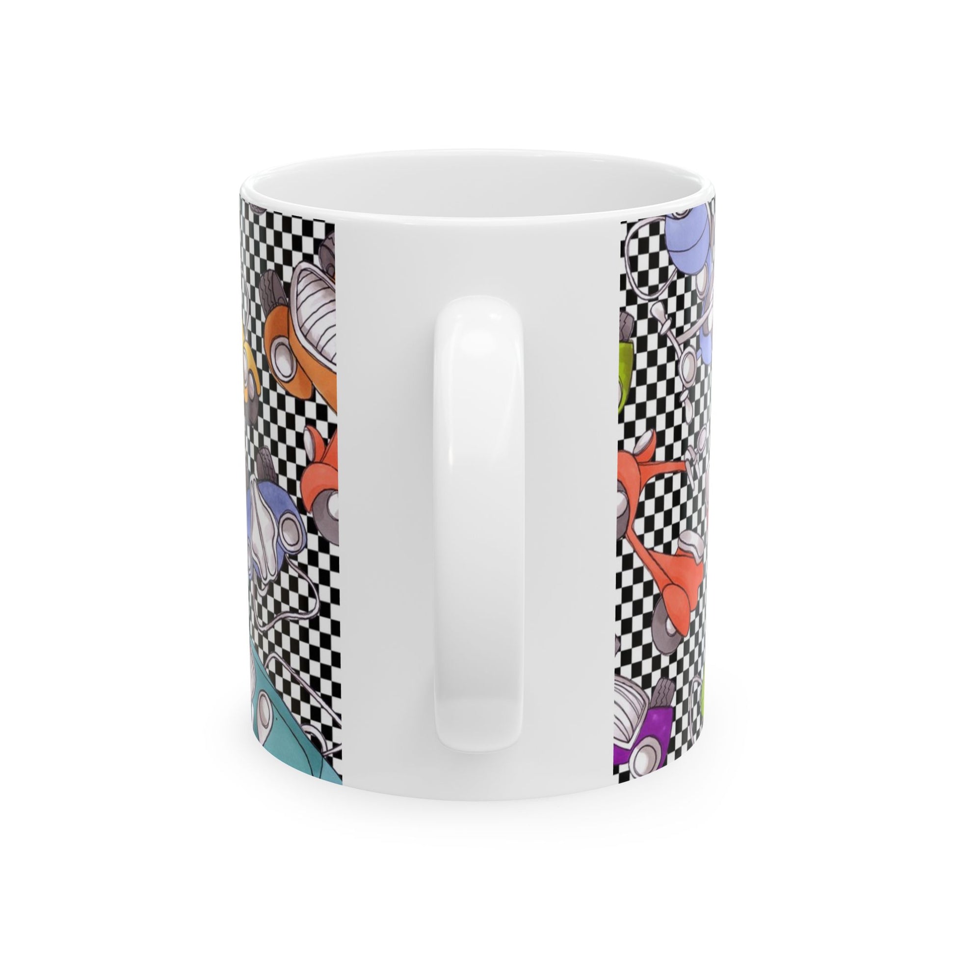 White ceramic 11oz mug with fun, colorful, Loralie sewing ladies enjoying each other's quirky company. Every project is more fun with the perfect Sewing Sisters mug! Makes a great gift!