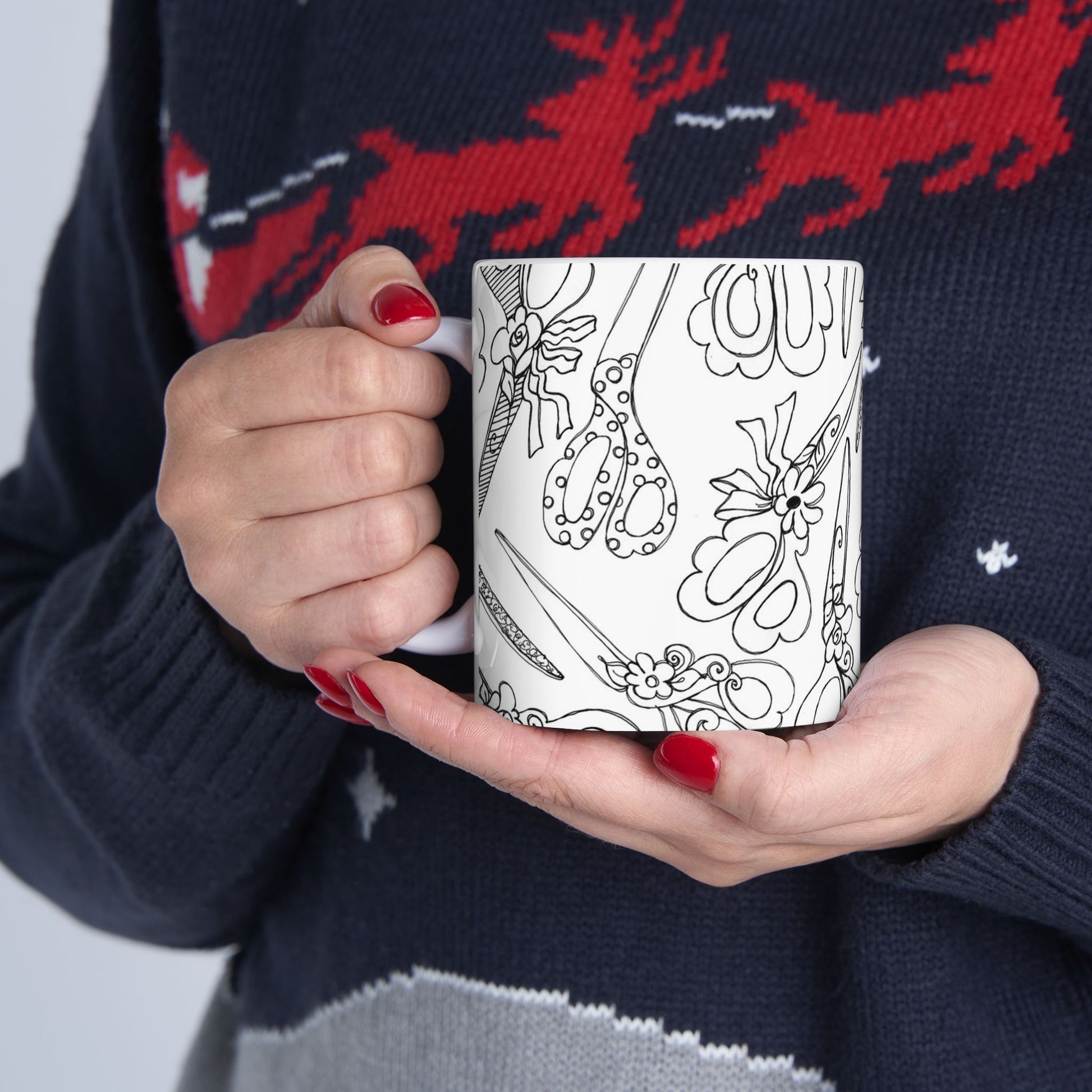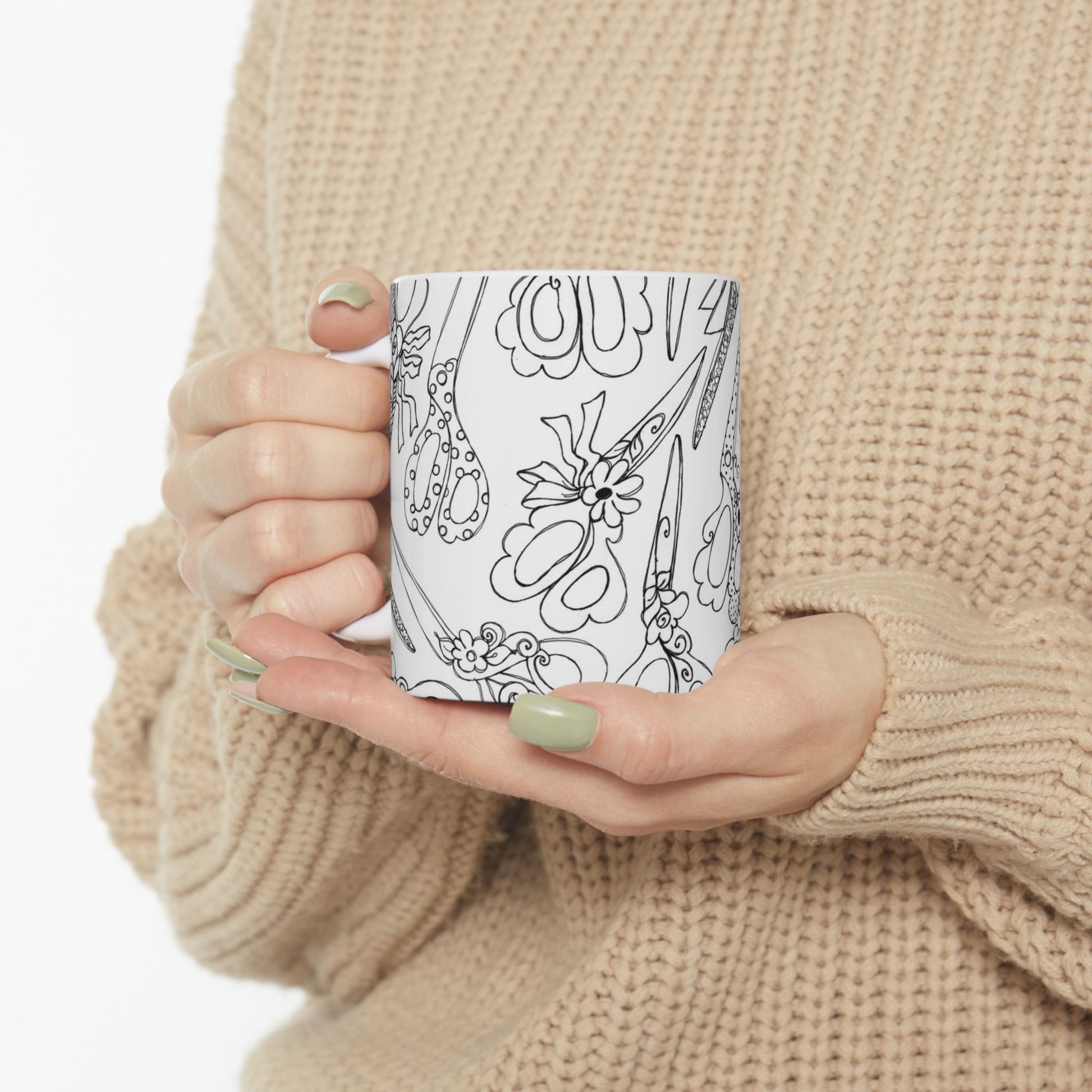 White ceramic 11oz mug with fun, colorful, Loralie sewing ladies enjoying each other's quirky company. Every project is more fun with the perfect Sewing Sisters mug! Makes a great gift!
