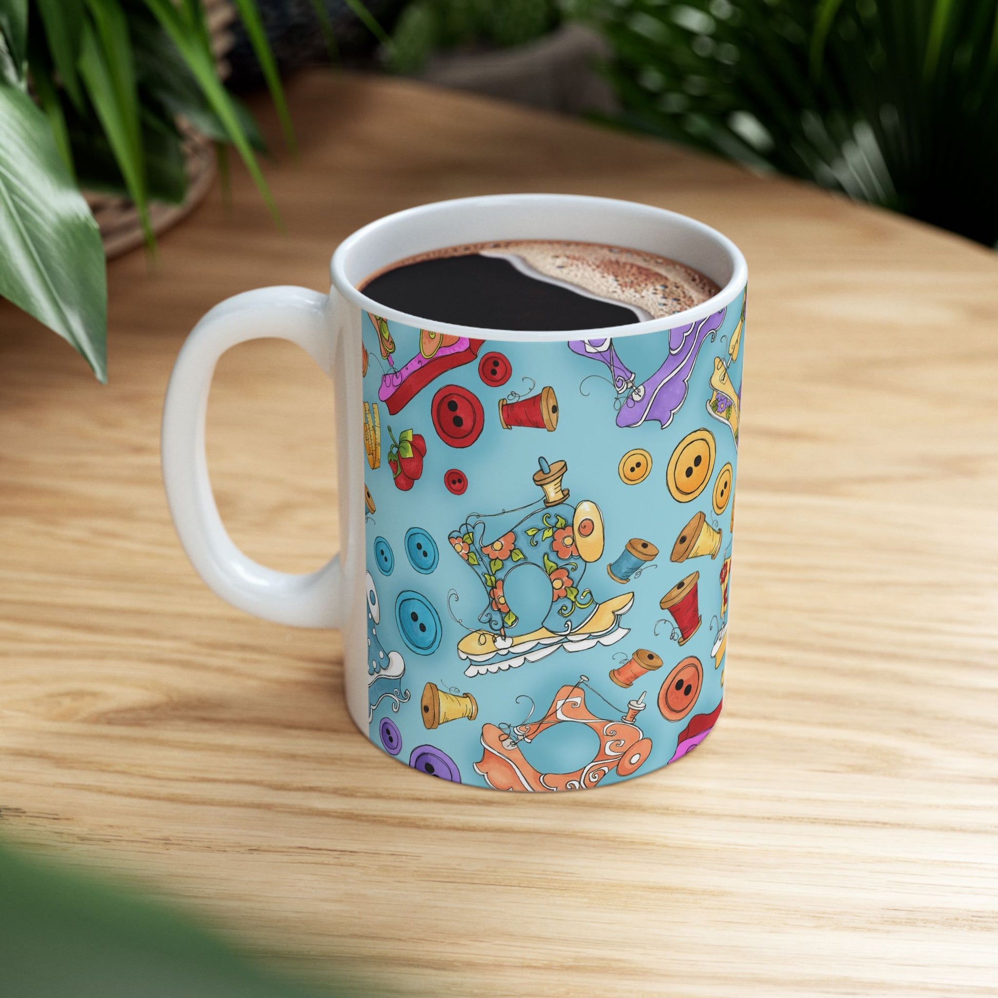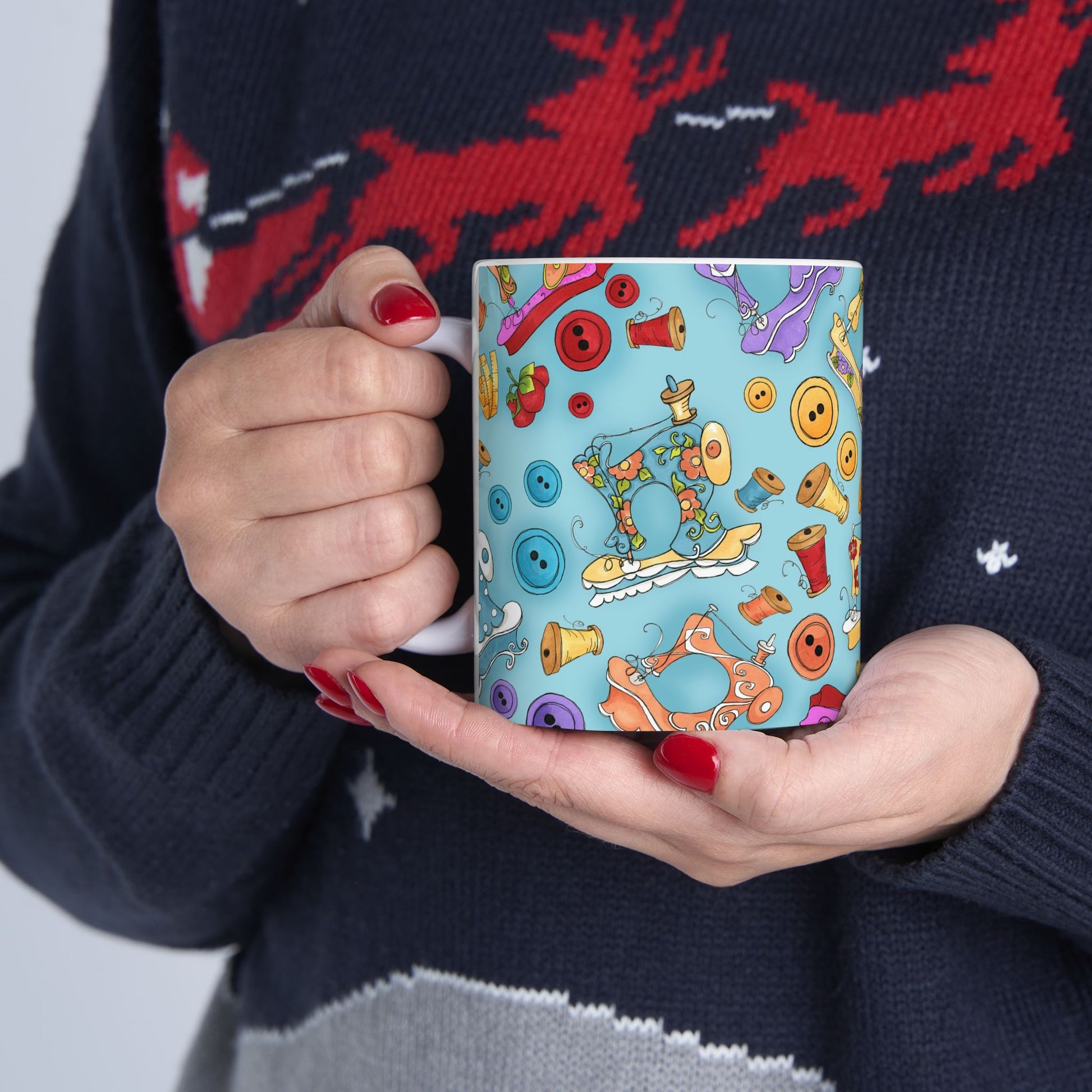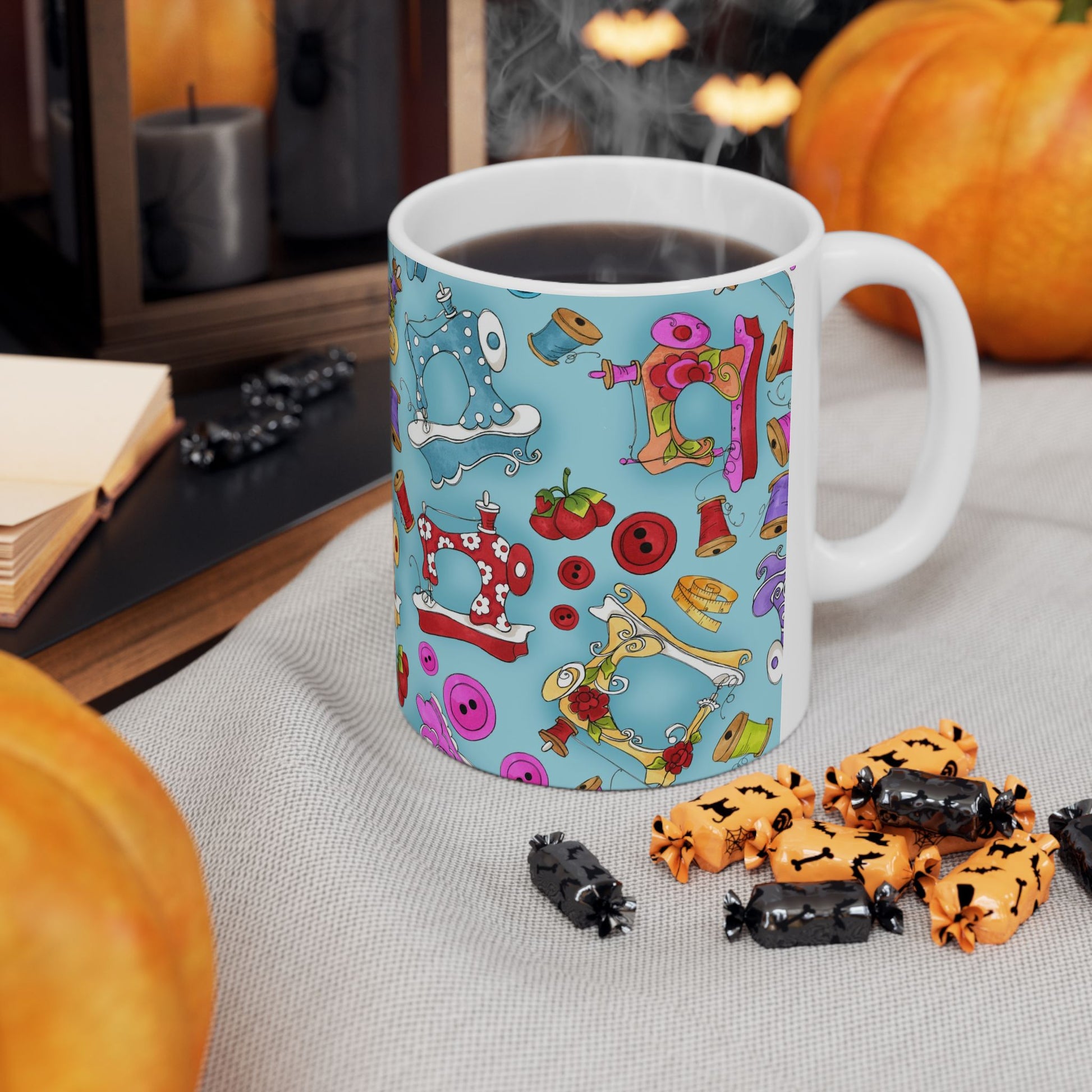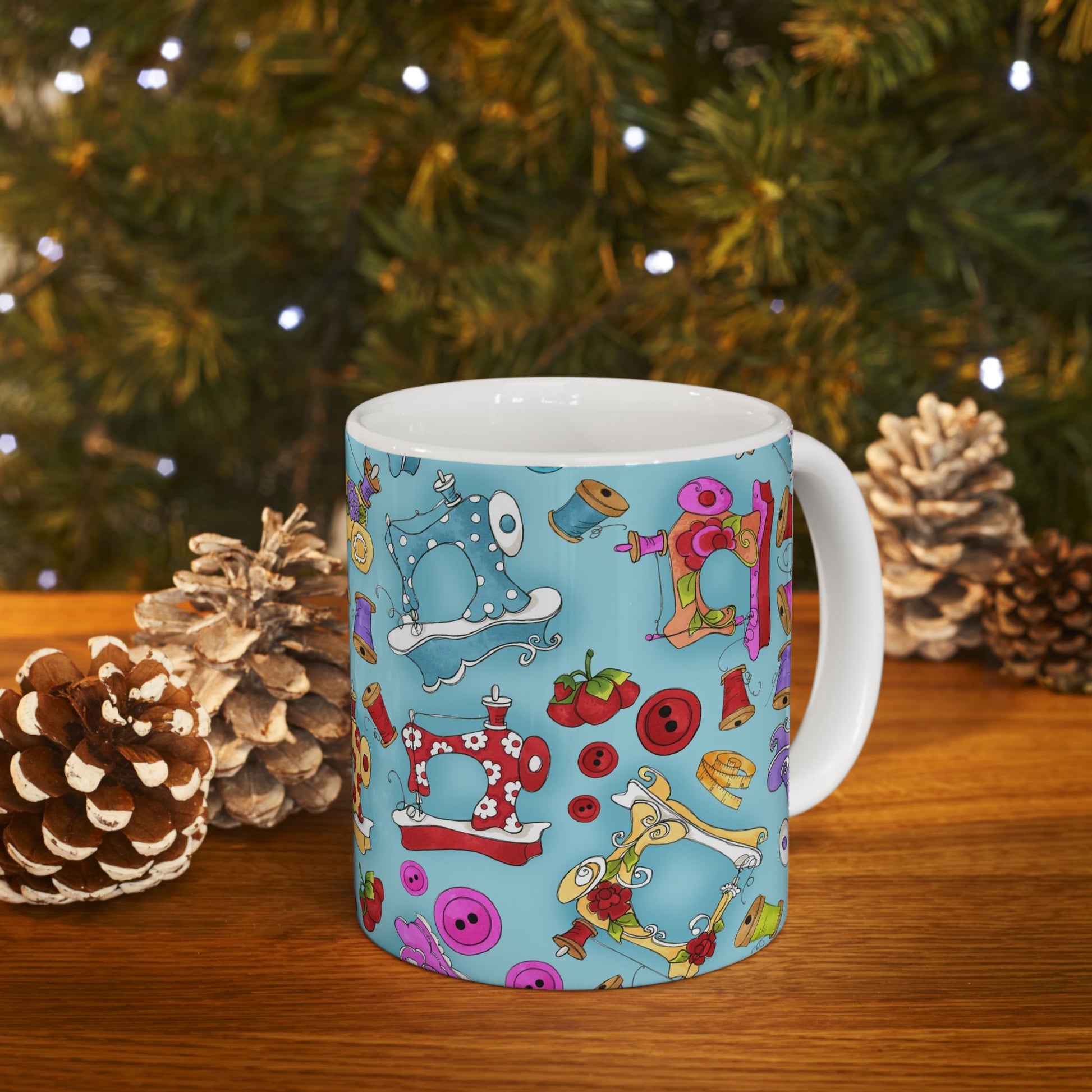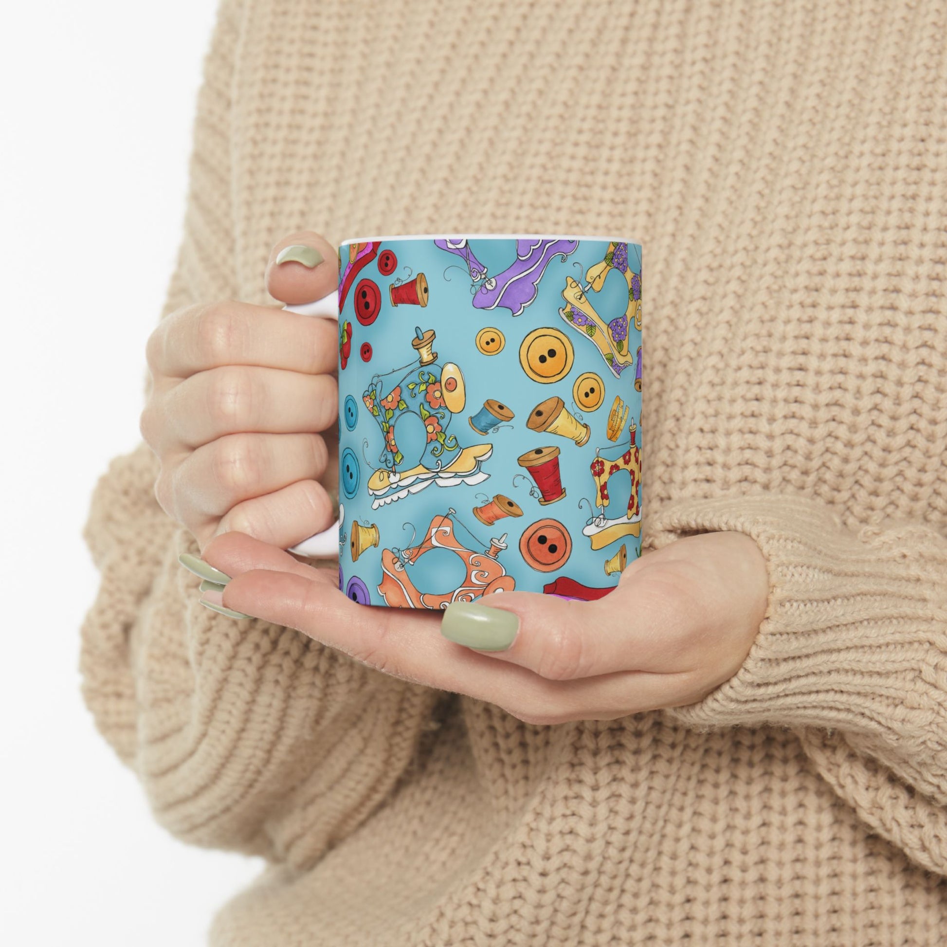 White ceramic 11oz mug with fun, colorful, Loralie sewing ladies enjoying each other's quirky company. Every project is more fun with the perfect Sewing Sisters mug! Makes a great gift!