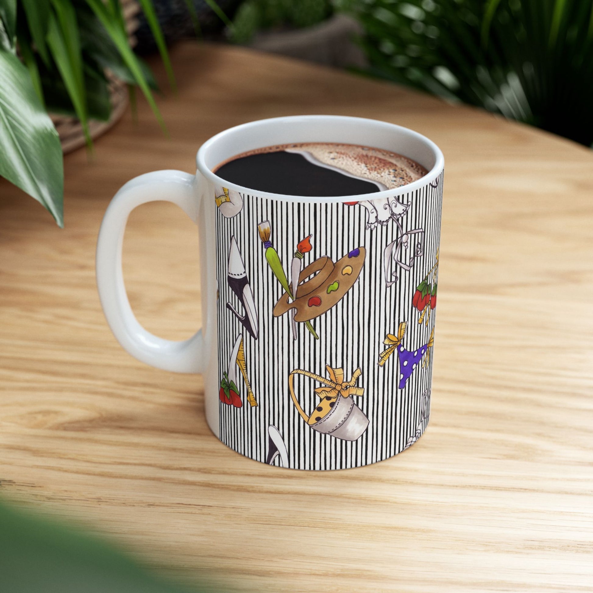 White ceramic 11oz mug with fun, colorful, Loralie sewing ladies enjoying each other's quirky company. Every project is more fun with the perfect Sewing Sisters mug! Makes a great gift!