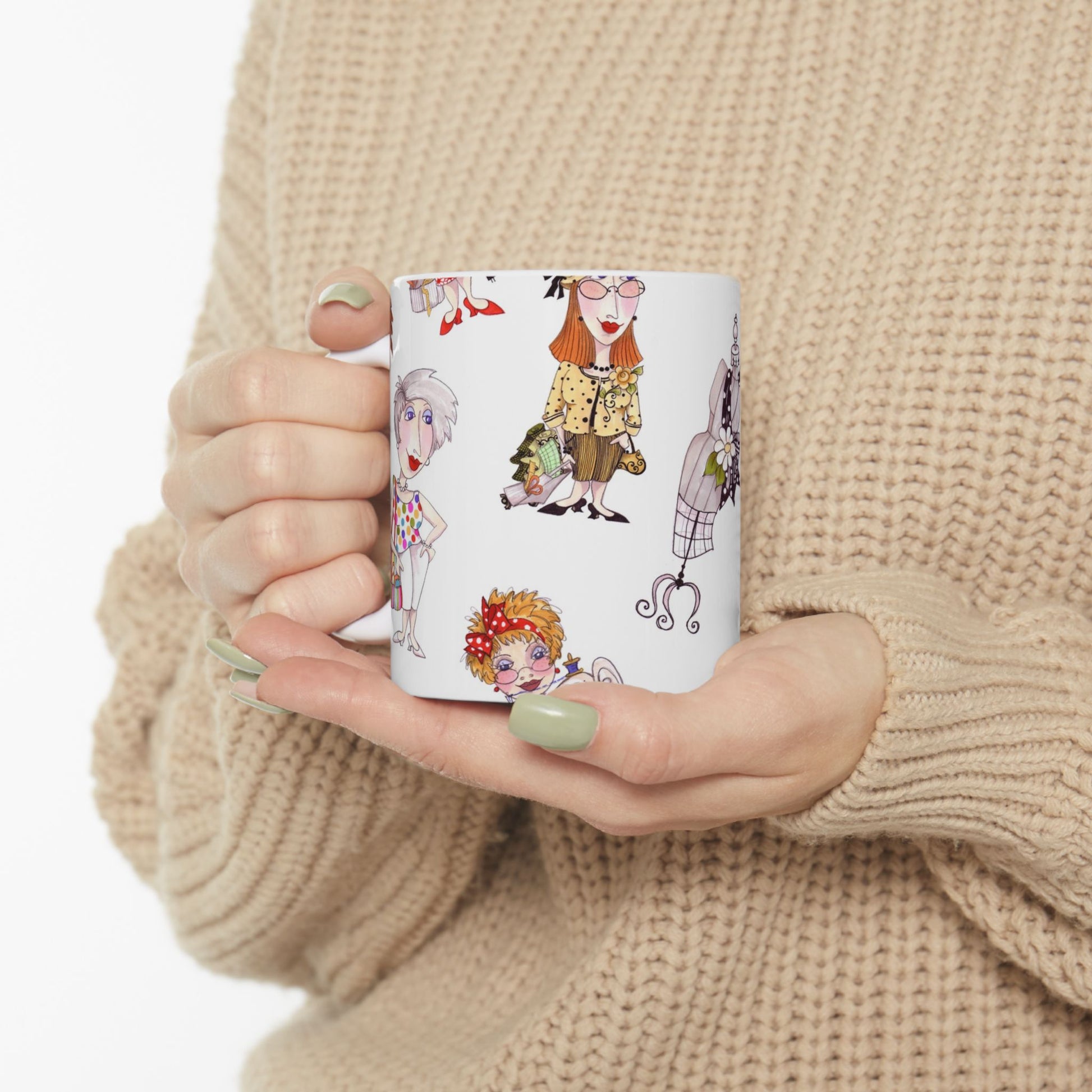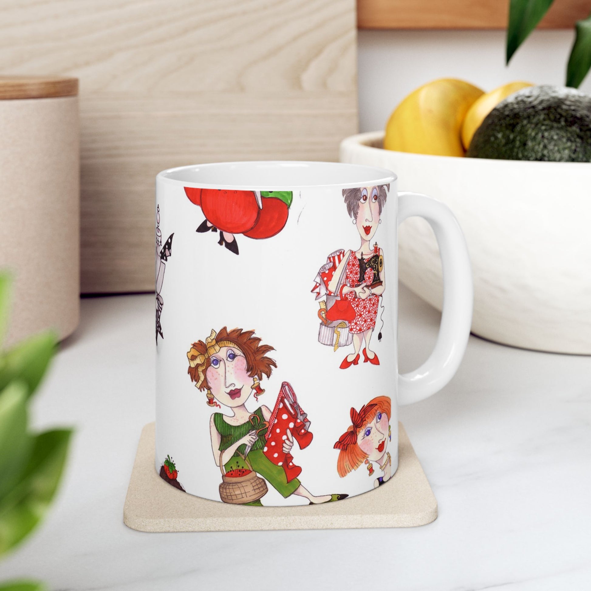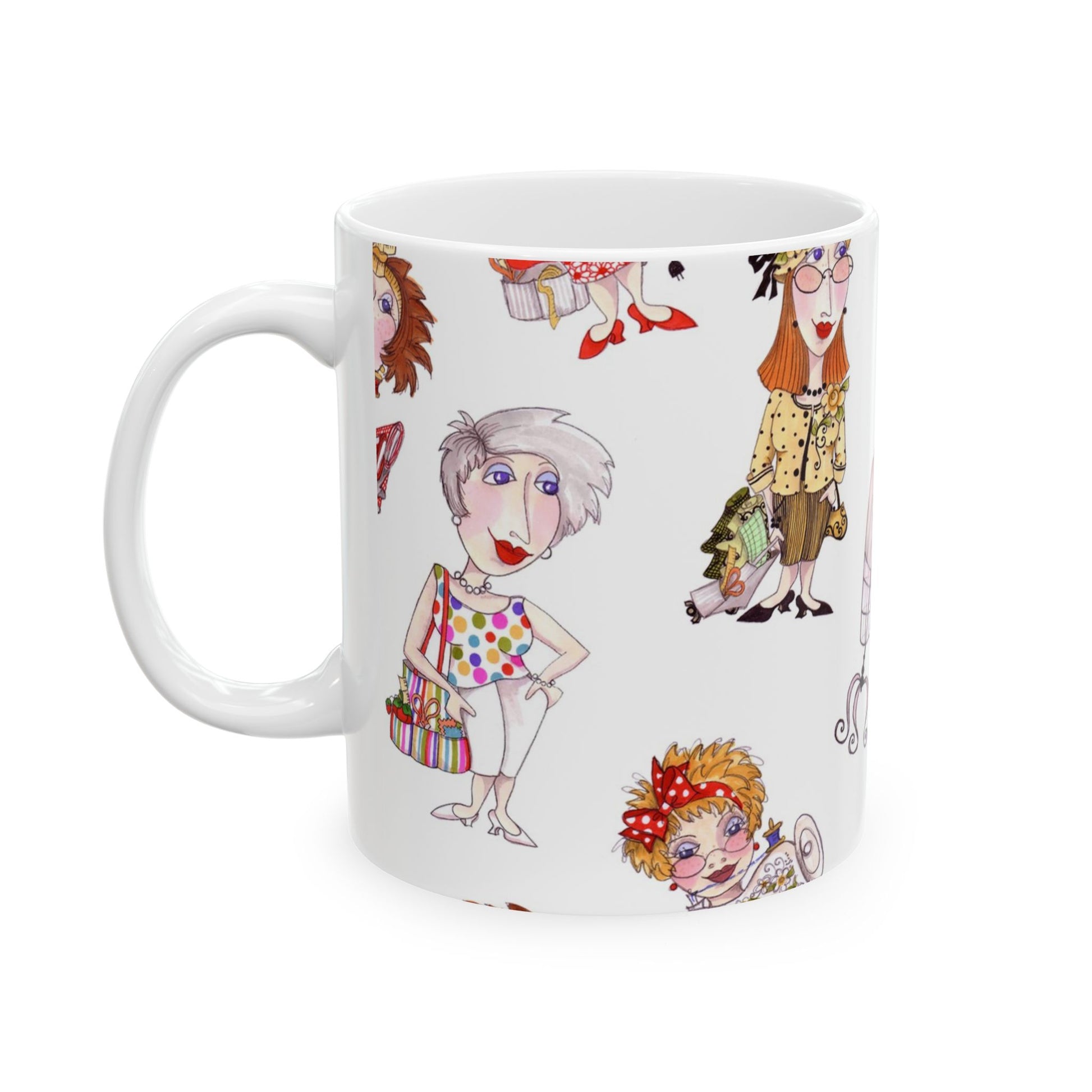 White ceramic 11oz mug with fun, colorful, Loralie sewing ladies enjoying each other's quirky company. Every project is more fun with the perfect Sewing Sisters mug! Makes a great gift!