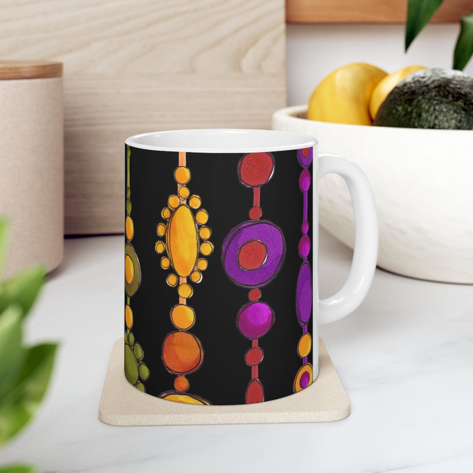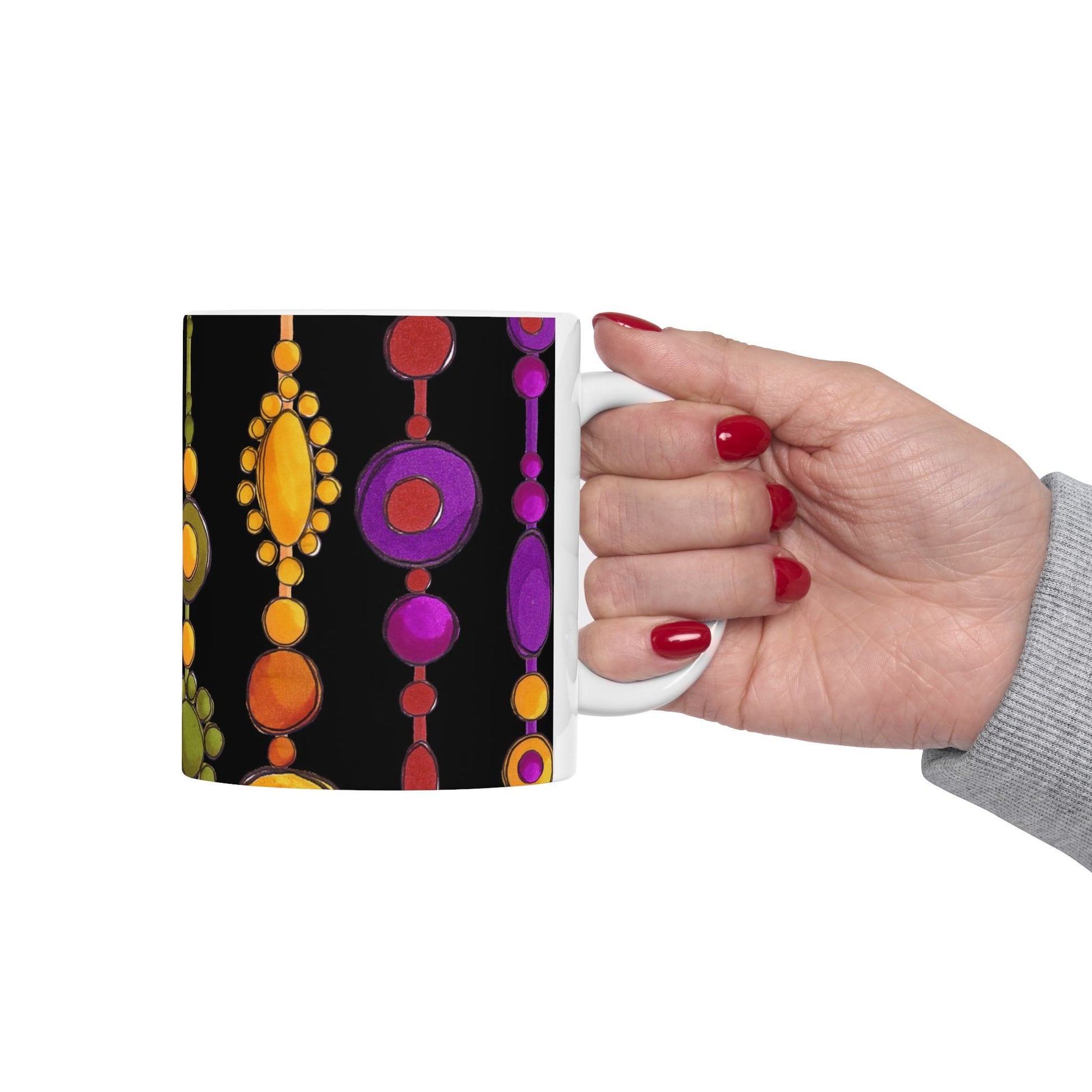 White ceramic 11oz mug with fun, colorful, Loralie sewing ladies enjoying each other's quirky company. Every project is more fun with the perfect Sewing Sisters mug! Makes a great gift!