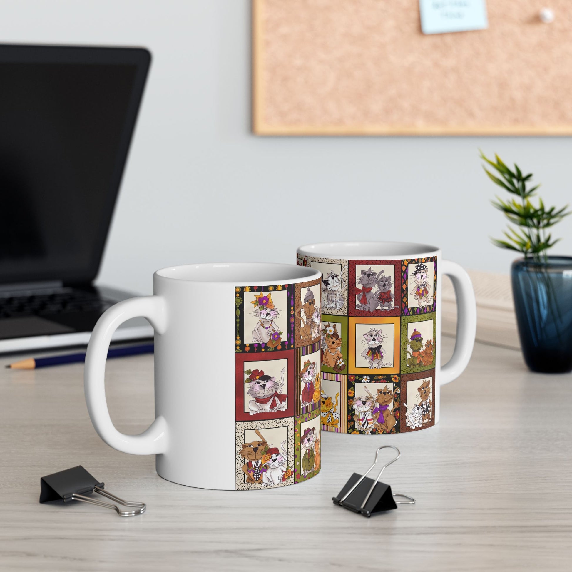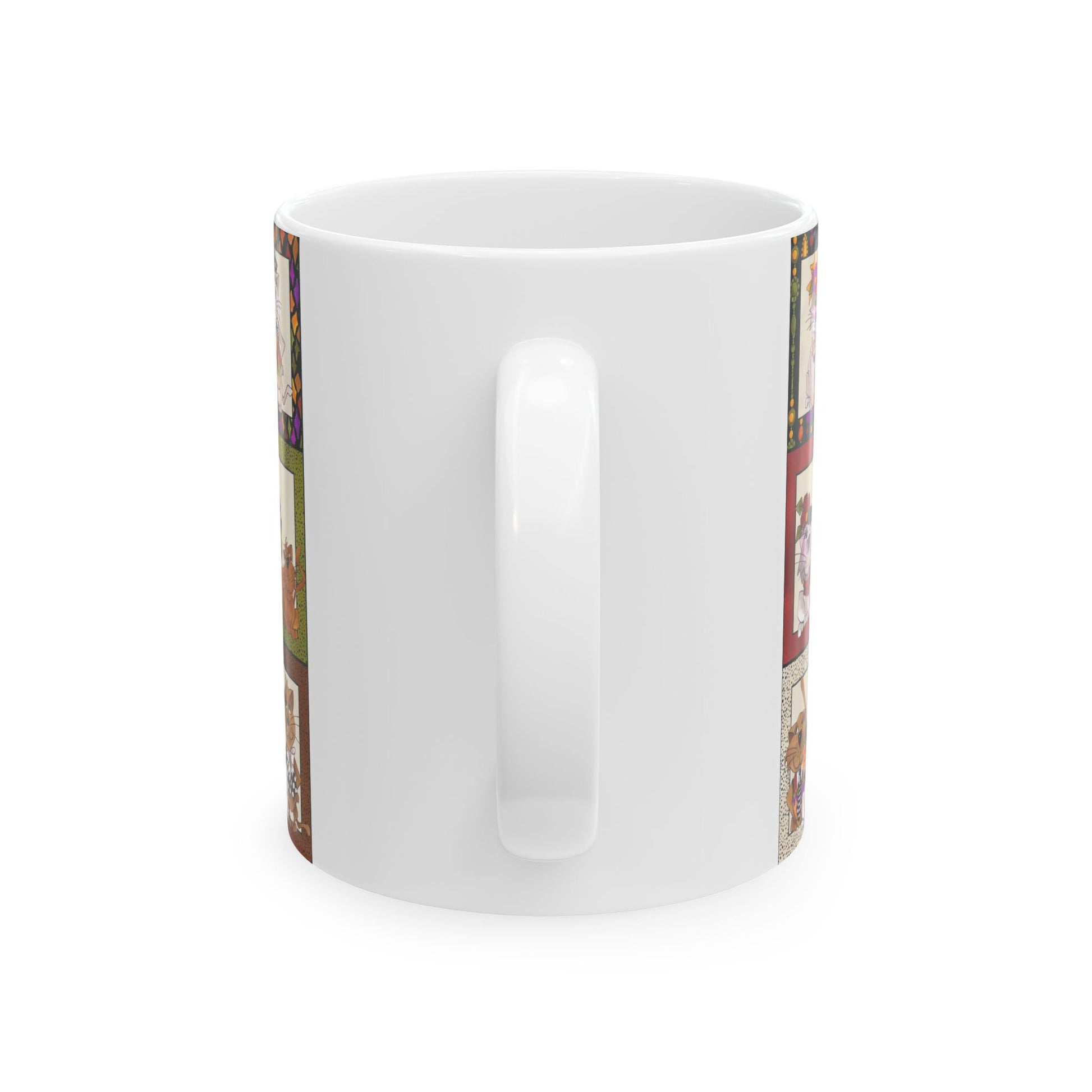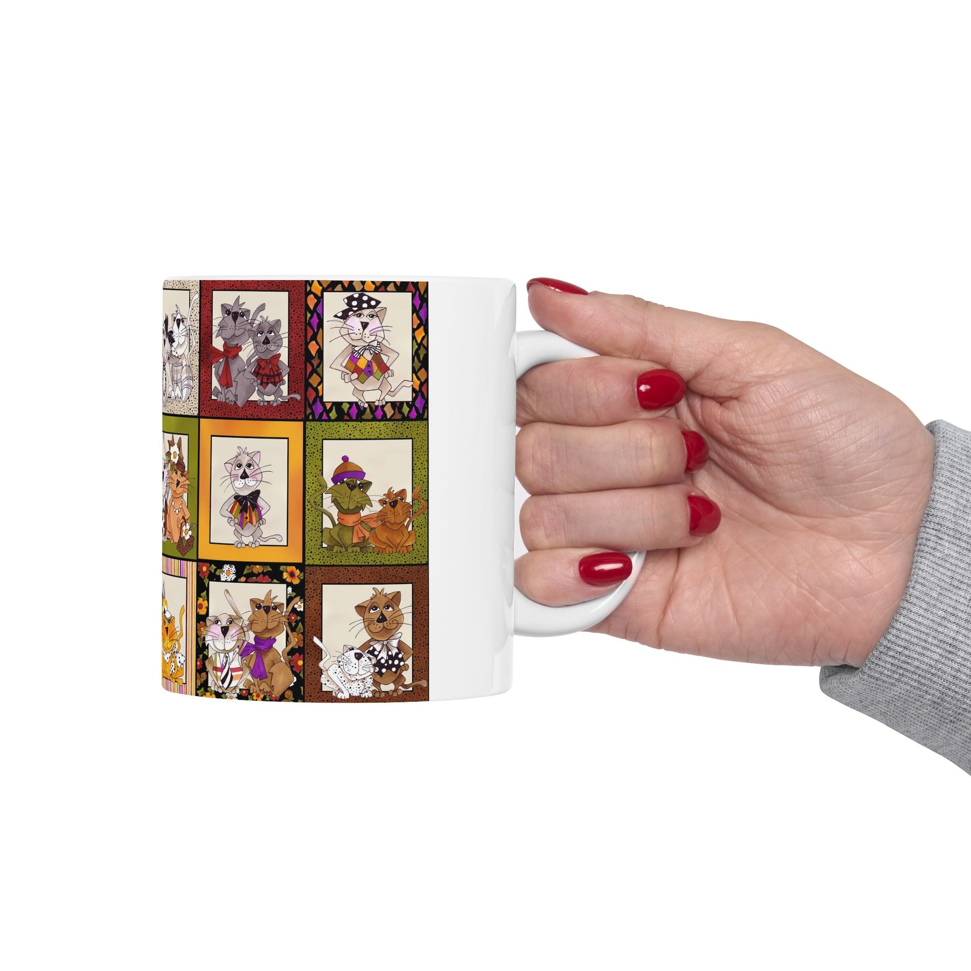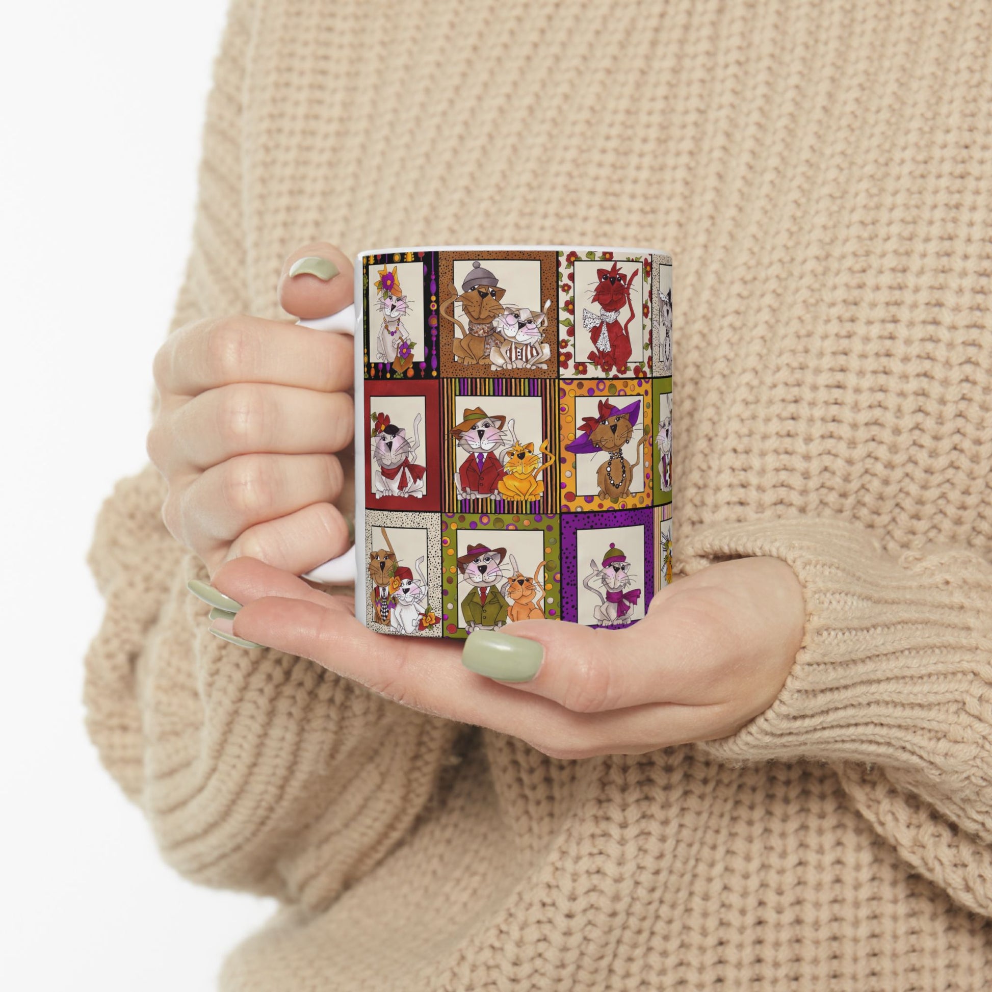 White ceramic 11oz mug with fun, colorful, Loralie sewing ladies enjoying each other's quirky company. Every project is more fun with the perfect Sewing Sisters mug! Makes a great gift!