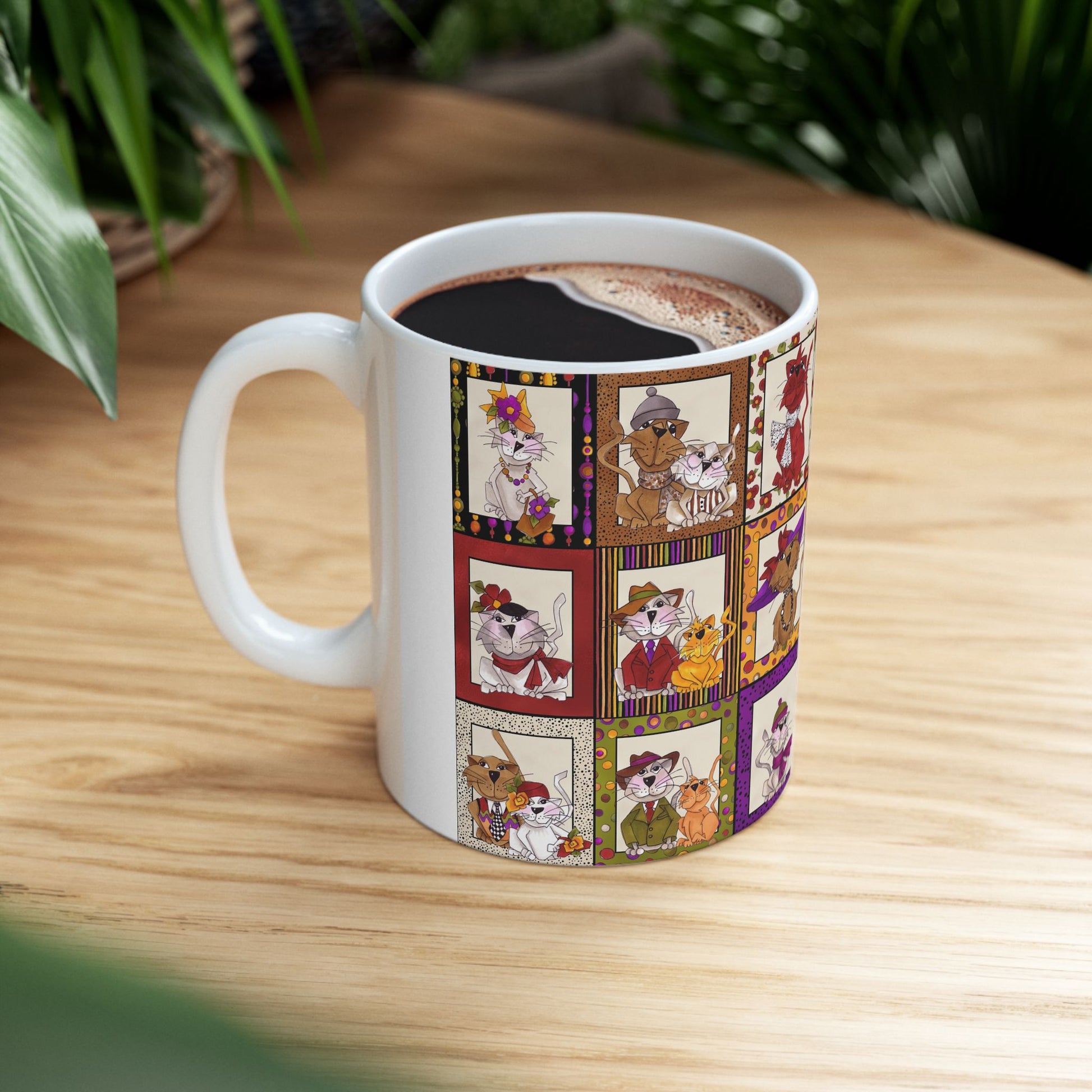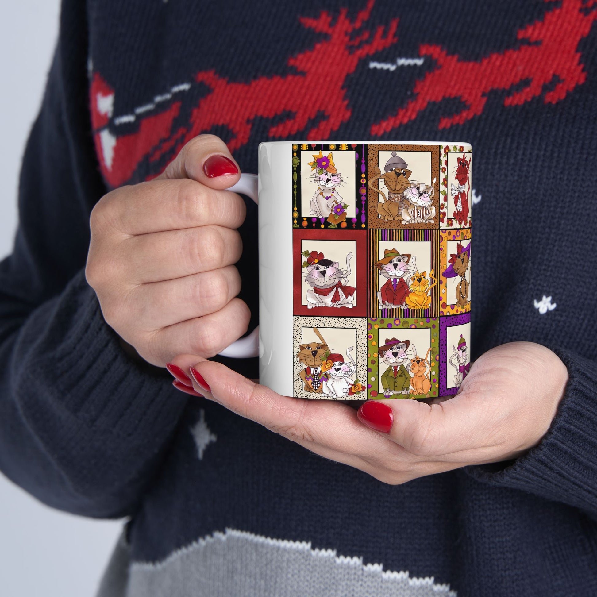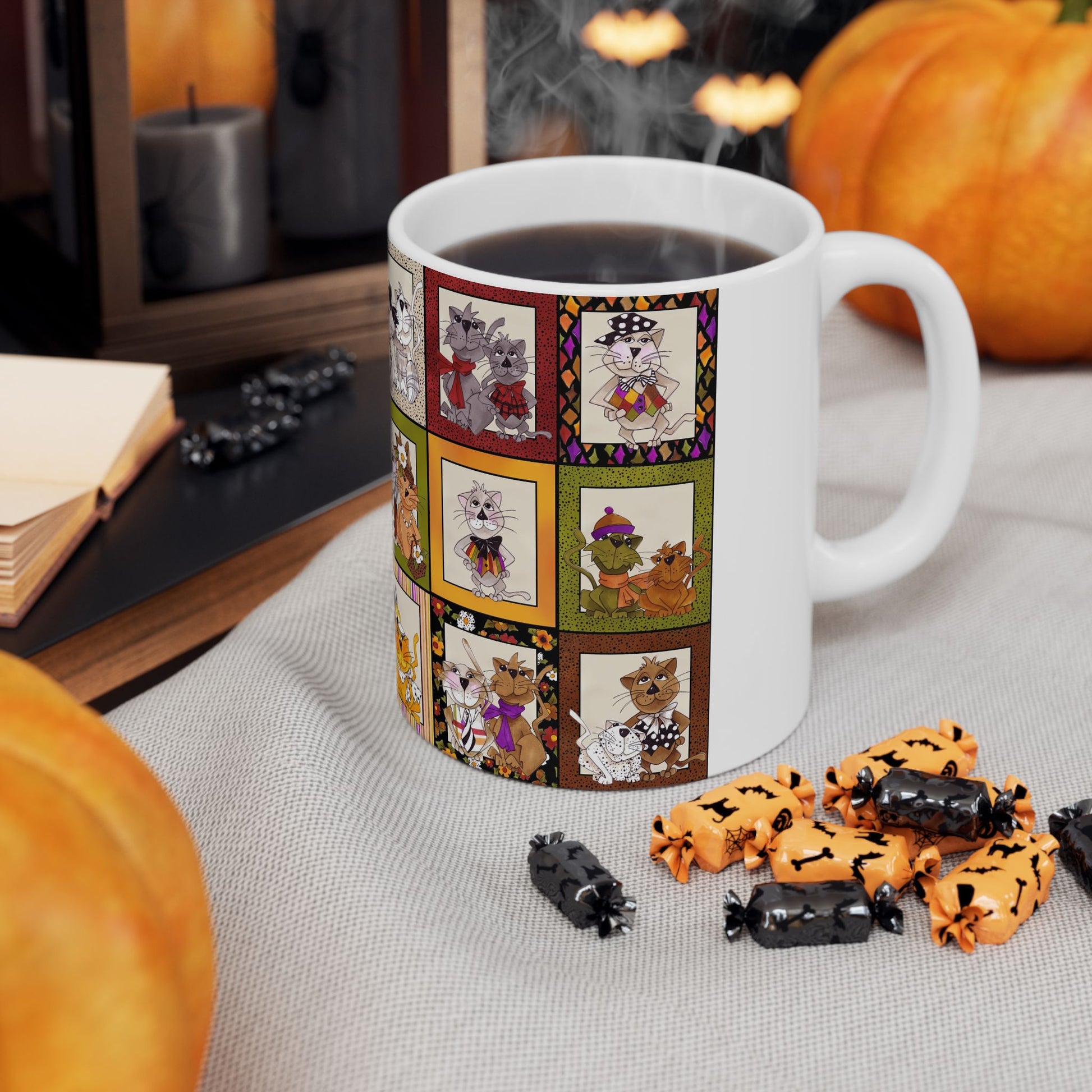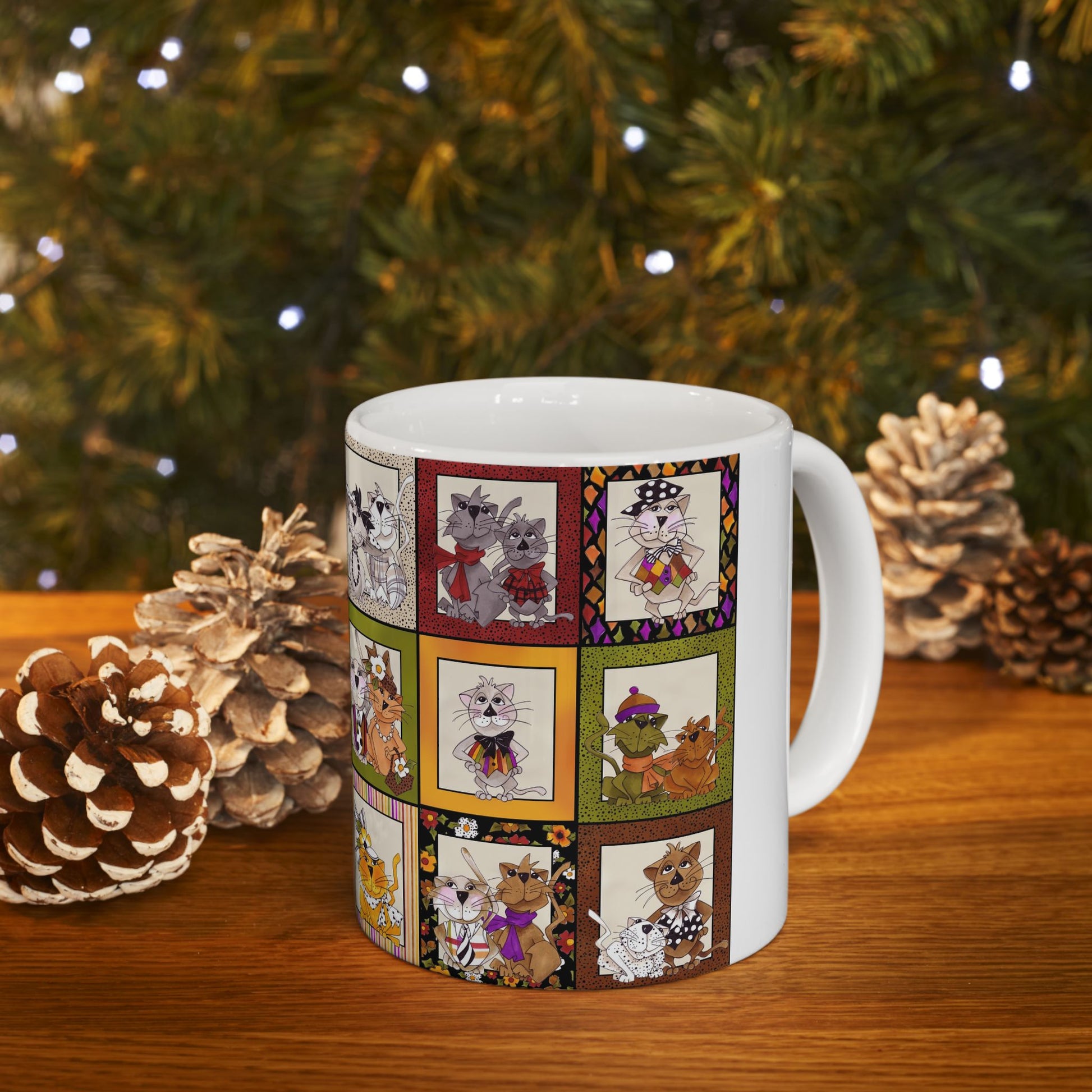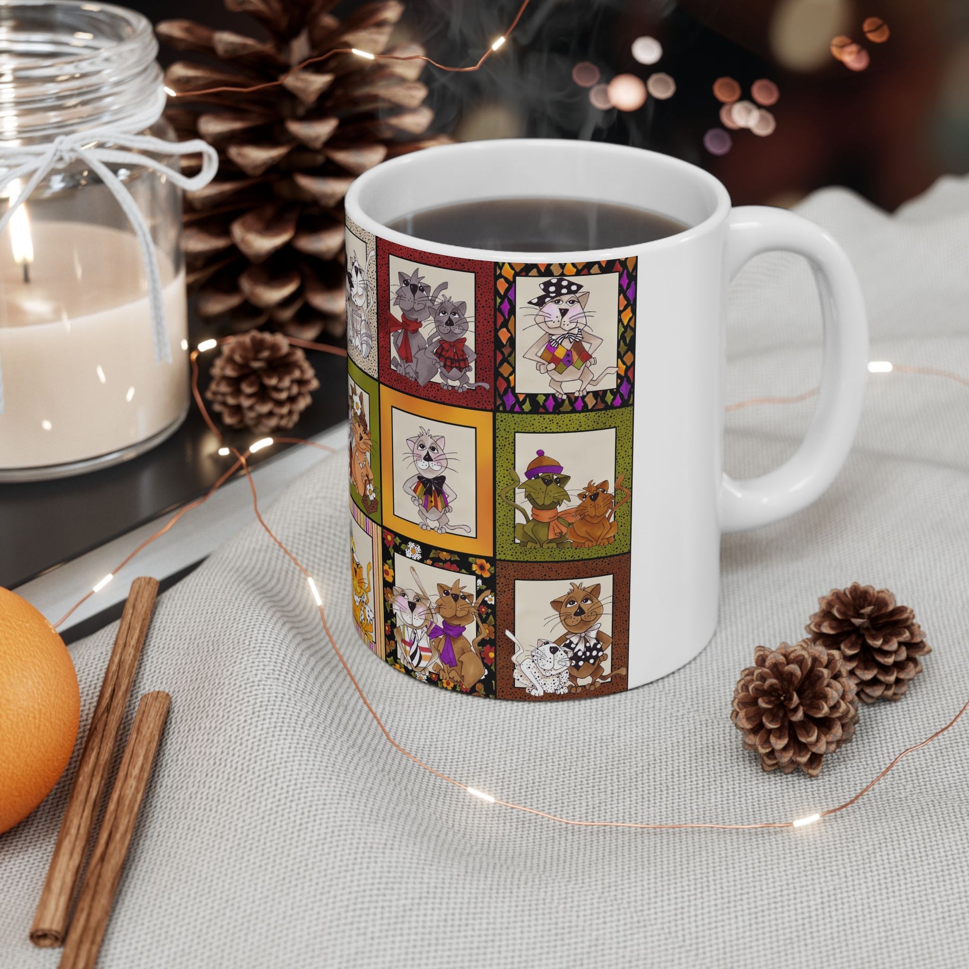 White ceramic 11oz mug with fun, colorful, Loralie sewing ladies enjoying each other's quirky company. Every project is more fun with the perfect Sewing Sisters mug! Makes a great gift!