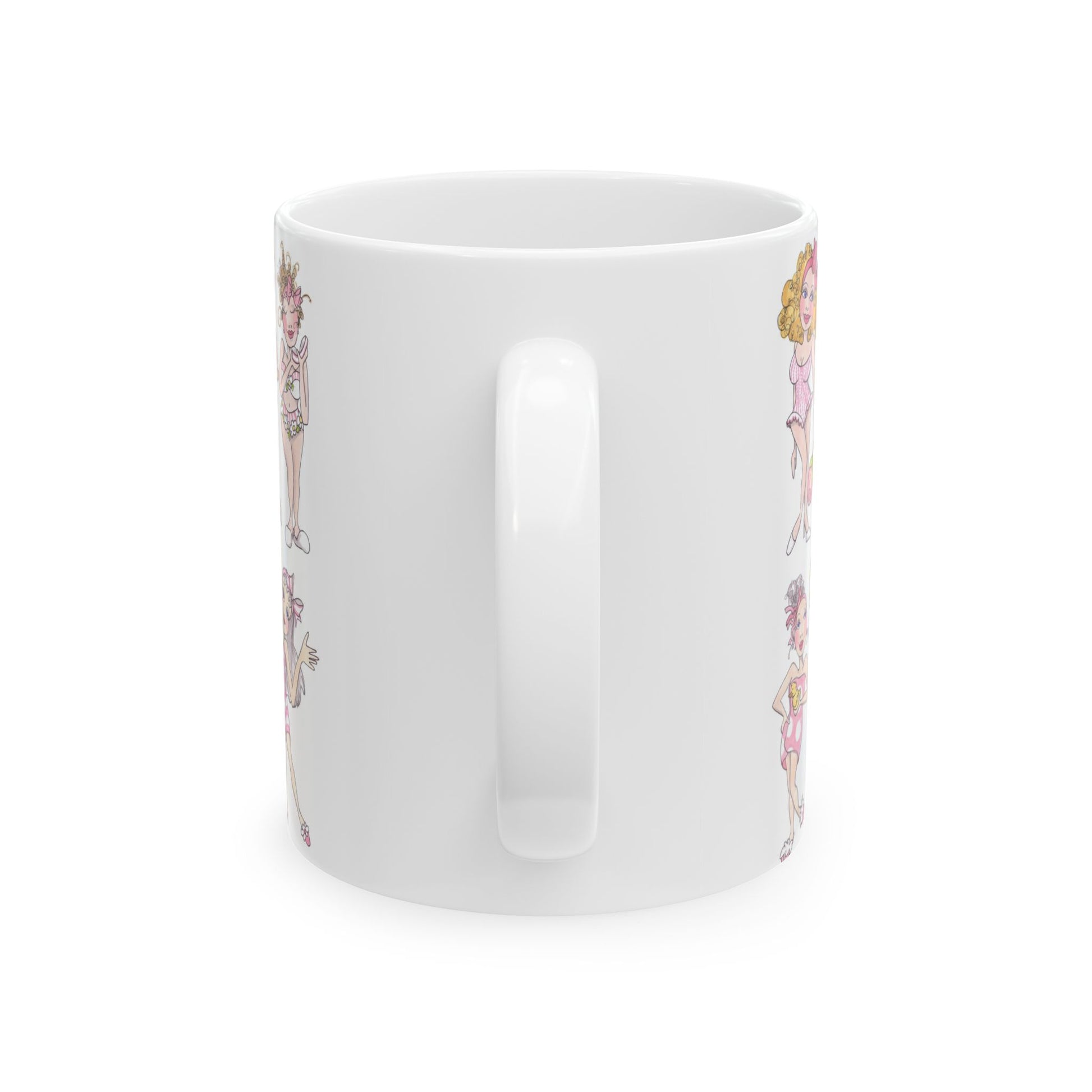 White ceramic 11oz mug with fun, colorful, Loralie sewing ladies enjoying each other's quirky company. Every project is more fun with the perfect Sewing Sisters mug! Makes a great gift!