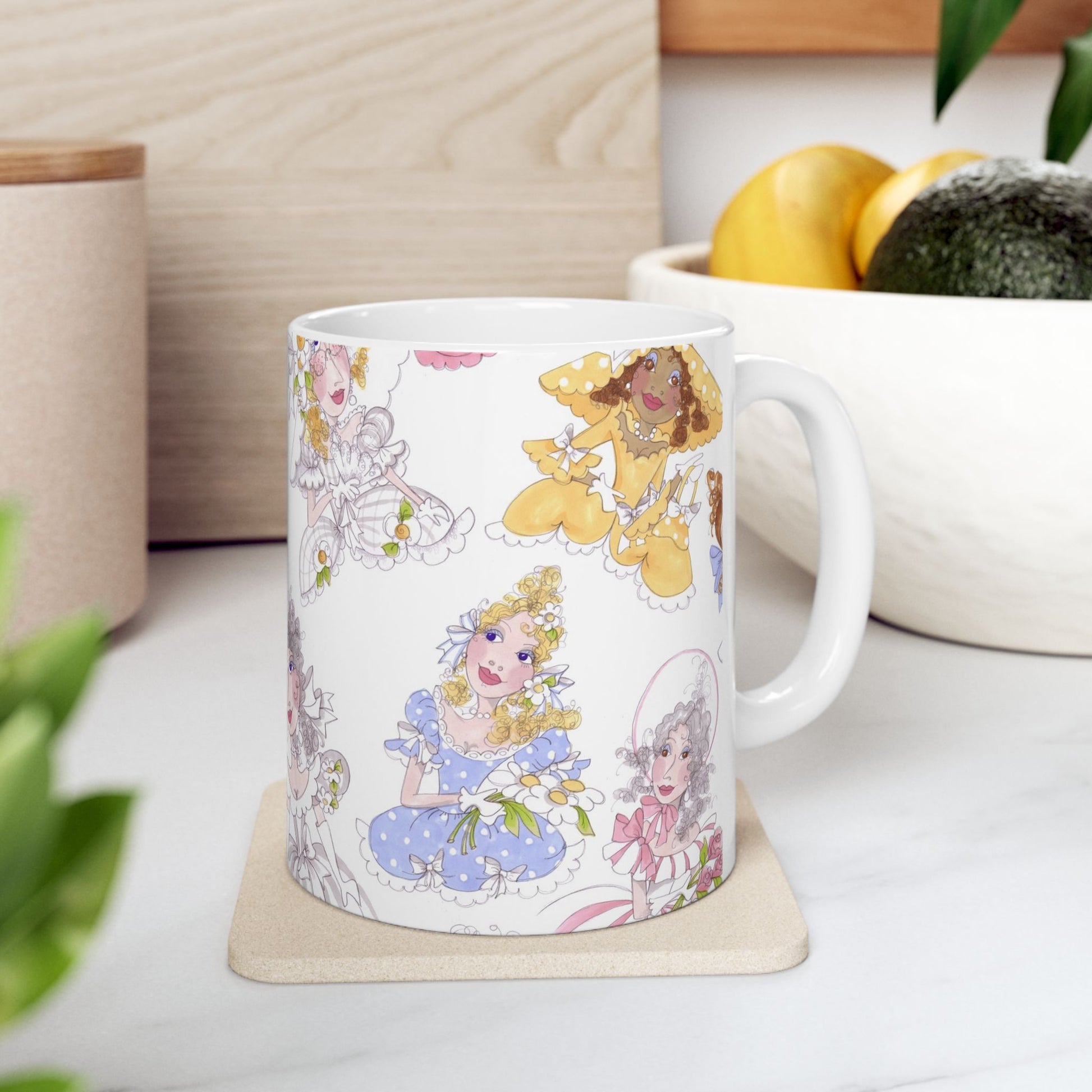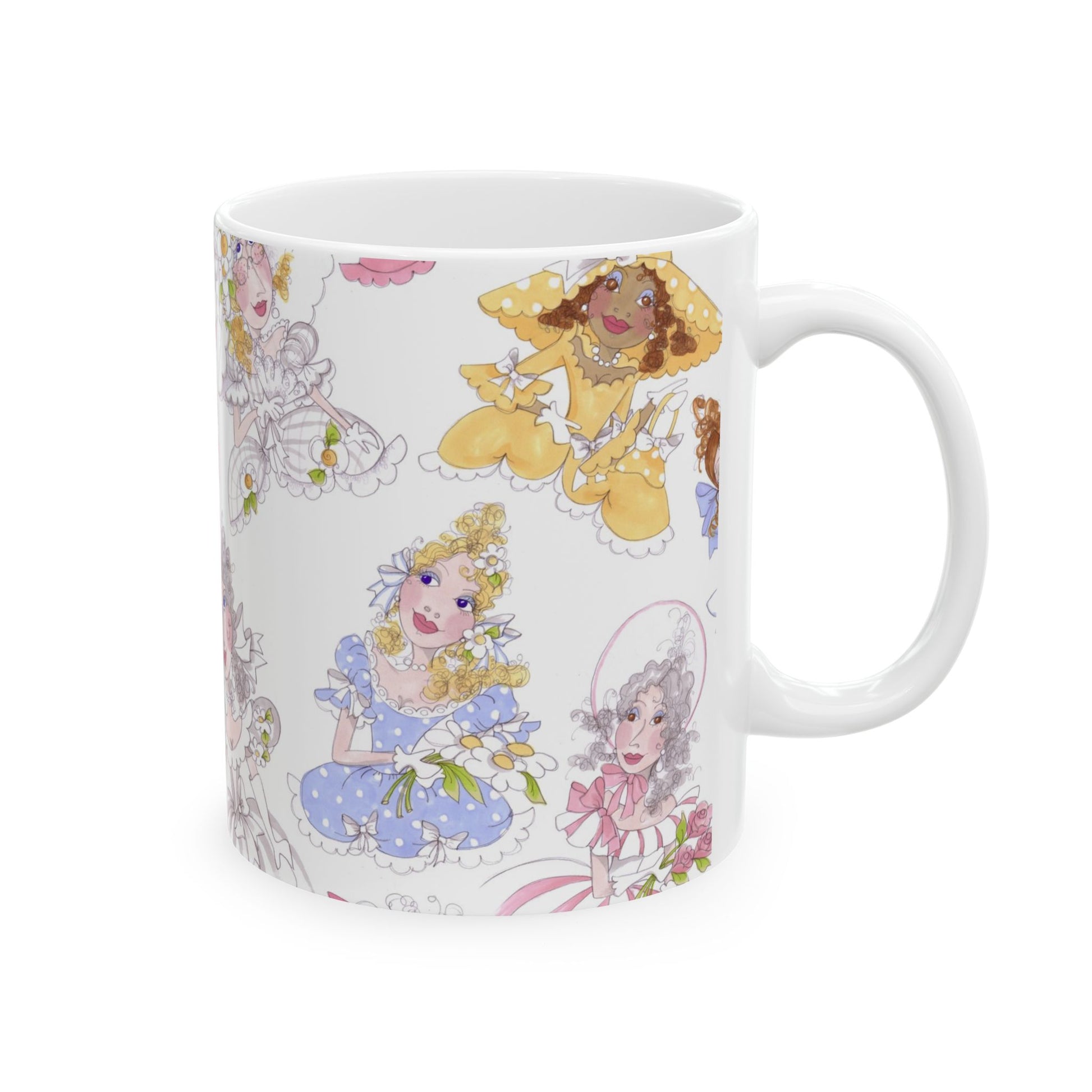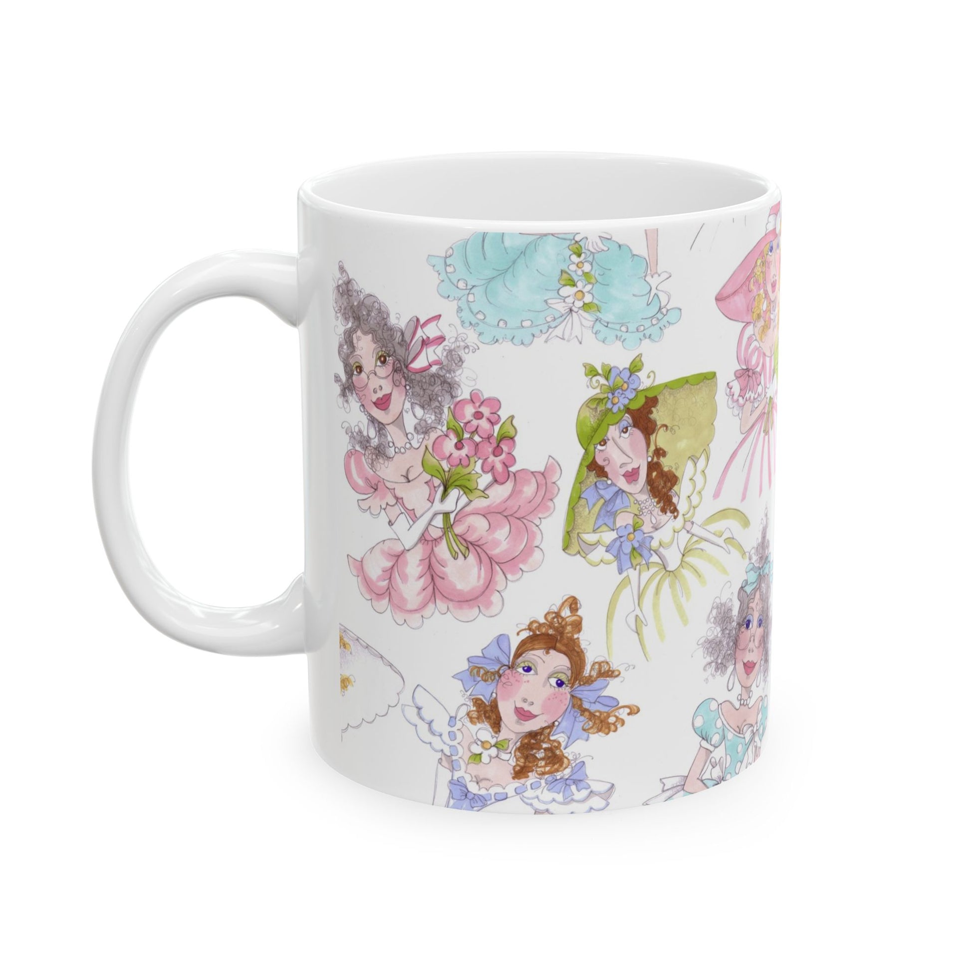 White ceramic 11oz mug with fun, colorful, Loralie sewing ladies enjoying each other's quirky company. Every project is more fun with the perfect Sewing Sisters mug! Makes a great gift!