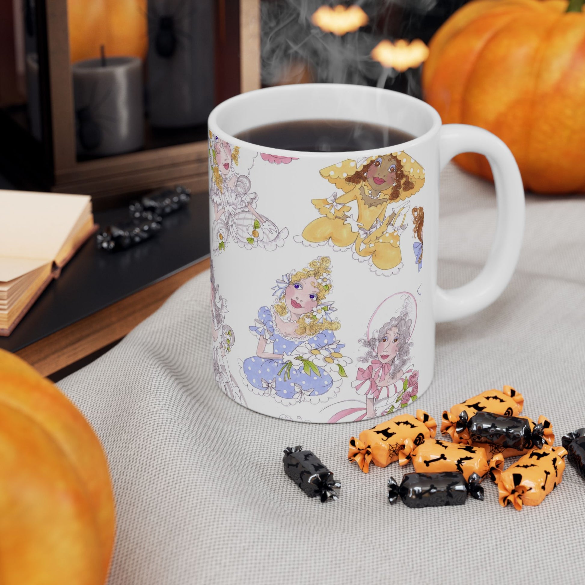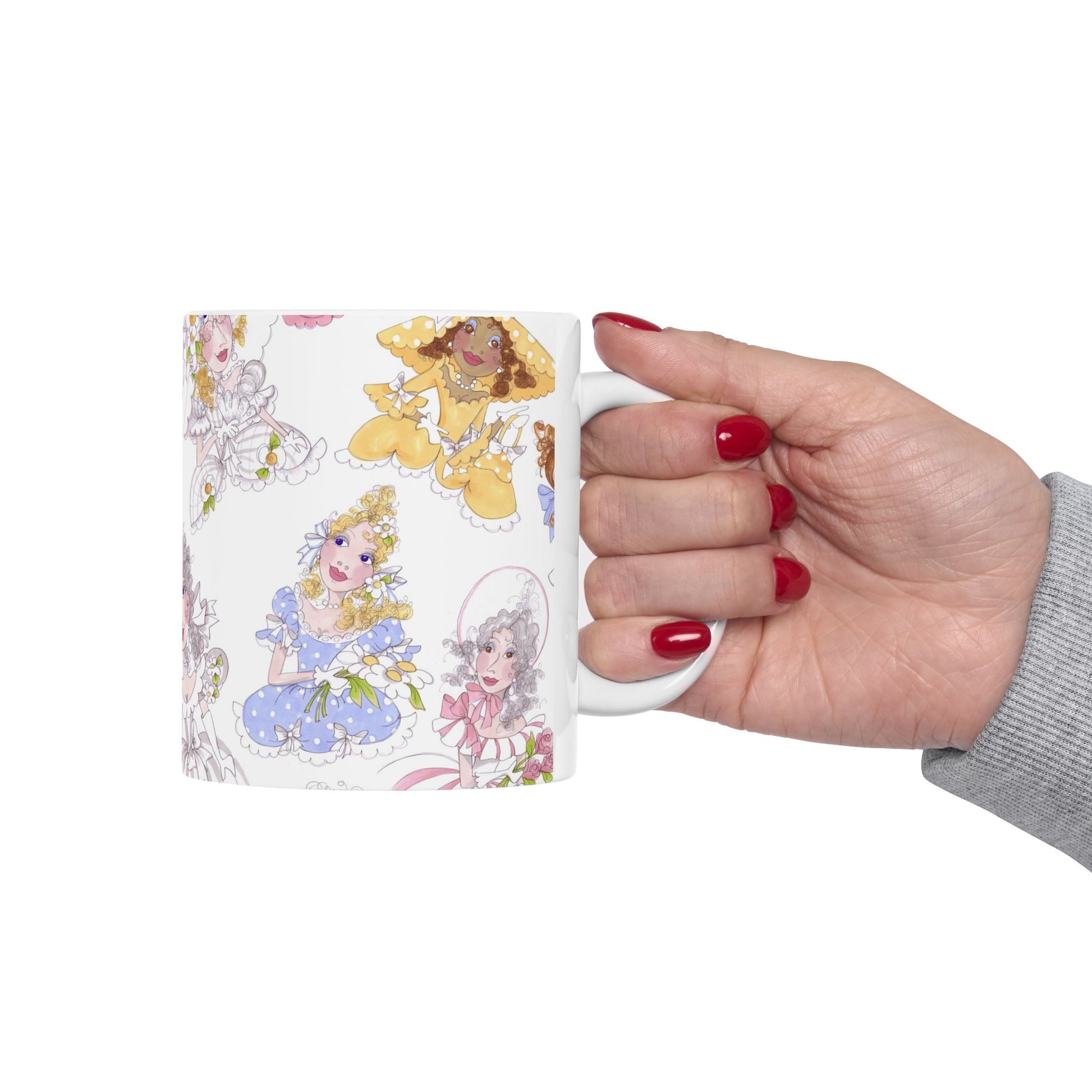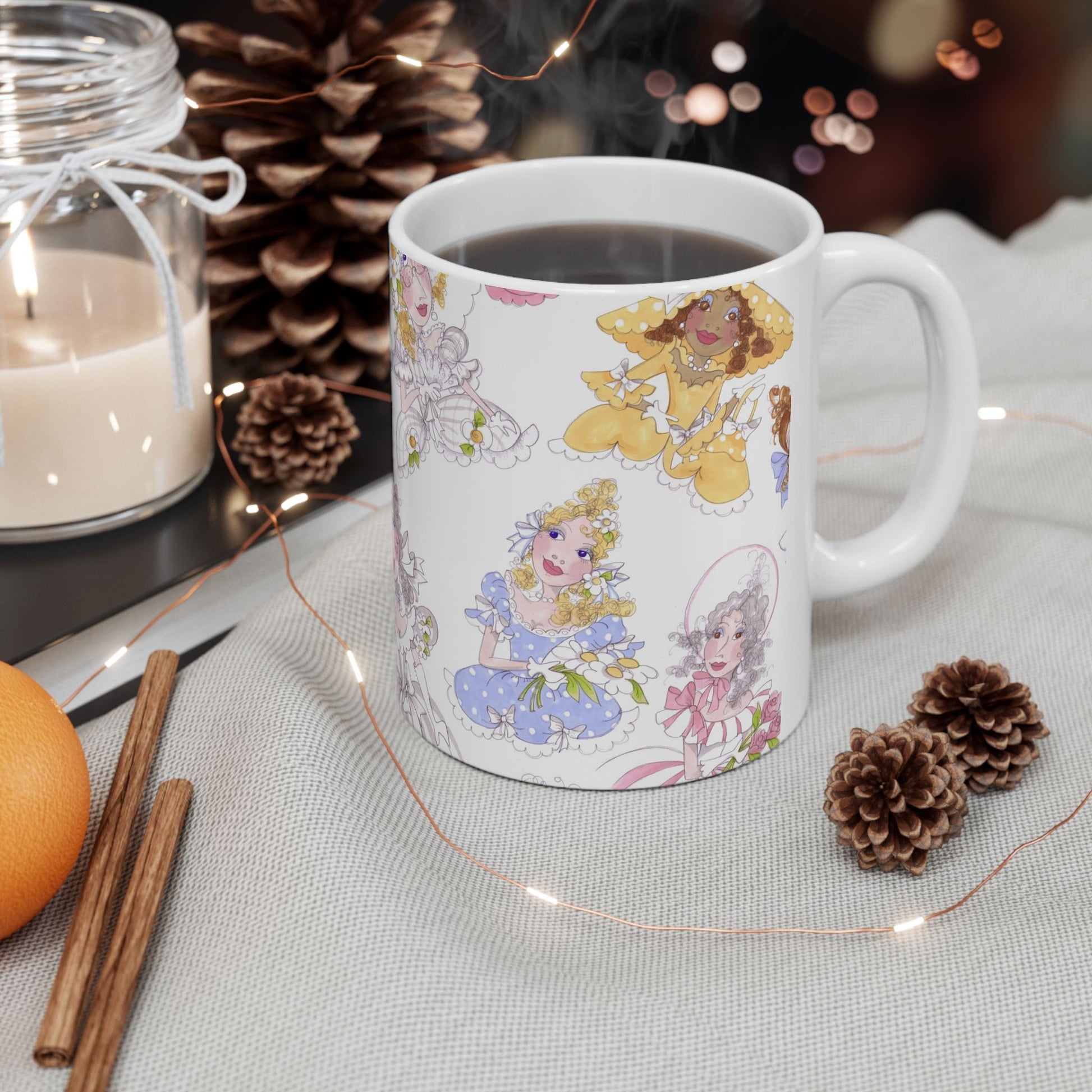 White ceramic 11oz mug with fun, colorful, Loralie sewing ladies enjoying each other's quirky company. Every project is more fun with the perfect Sewing Sisters mug! Makes a great gift!