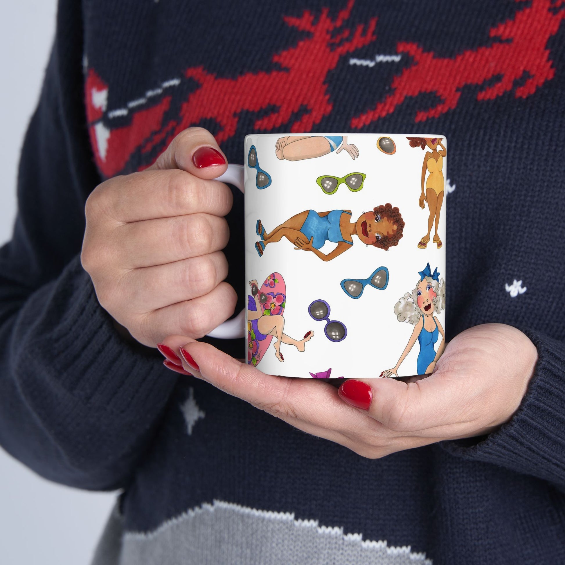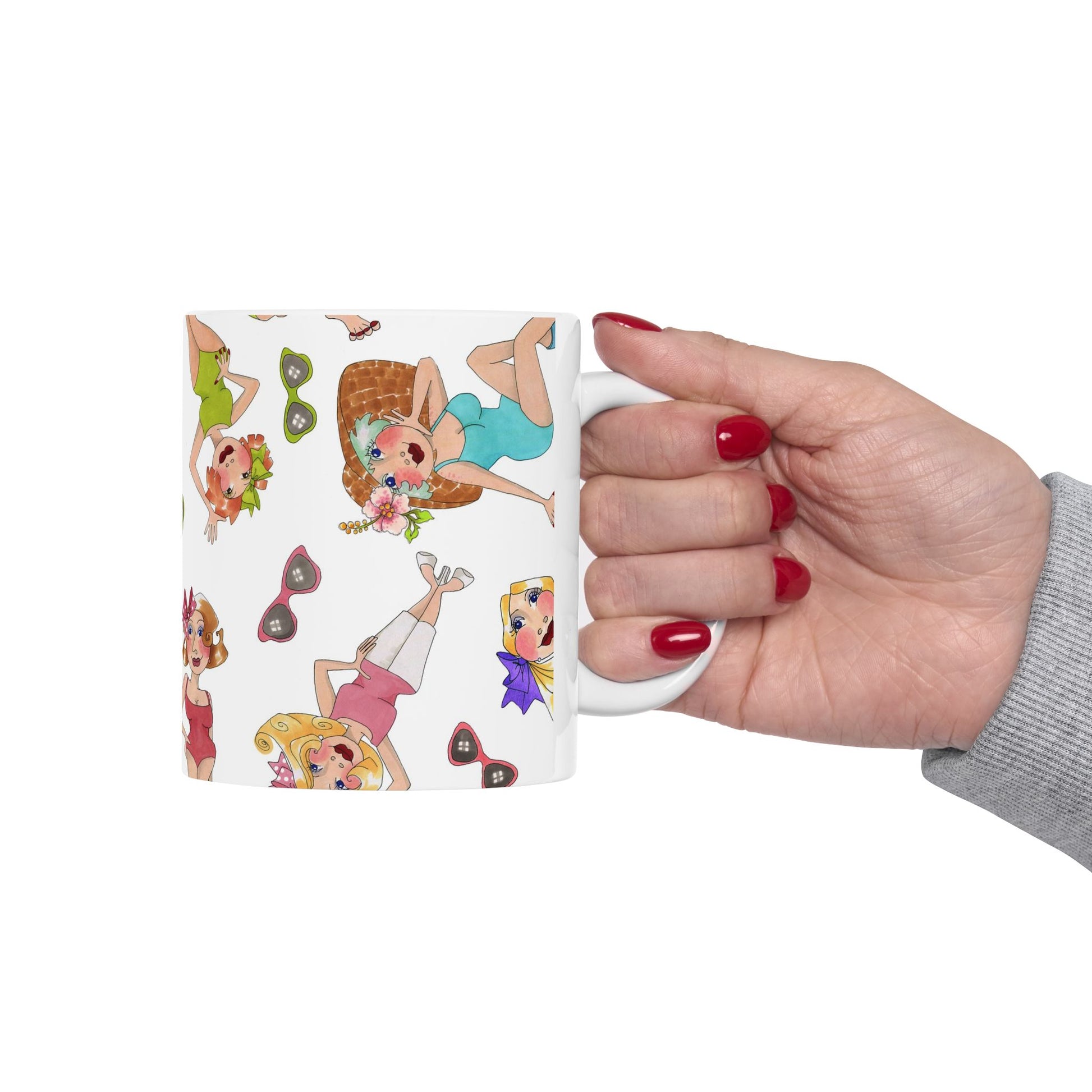 White ceramic 11oz mug with fun, colorful, Loralie sewing ladies enjoying each other's quirky company. Every project is more fun with the perfect Sewing Sisters mug! Makes a great gift!