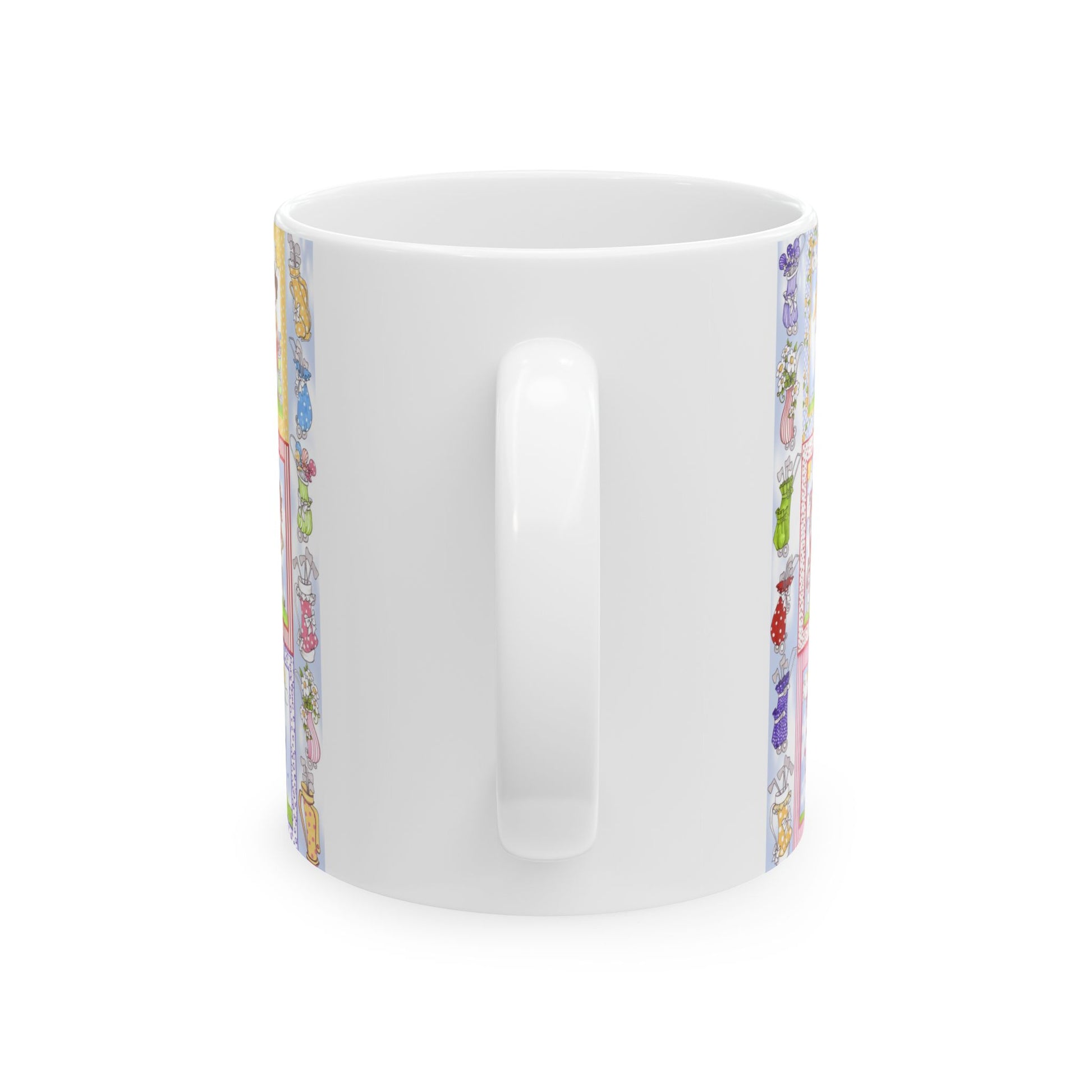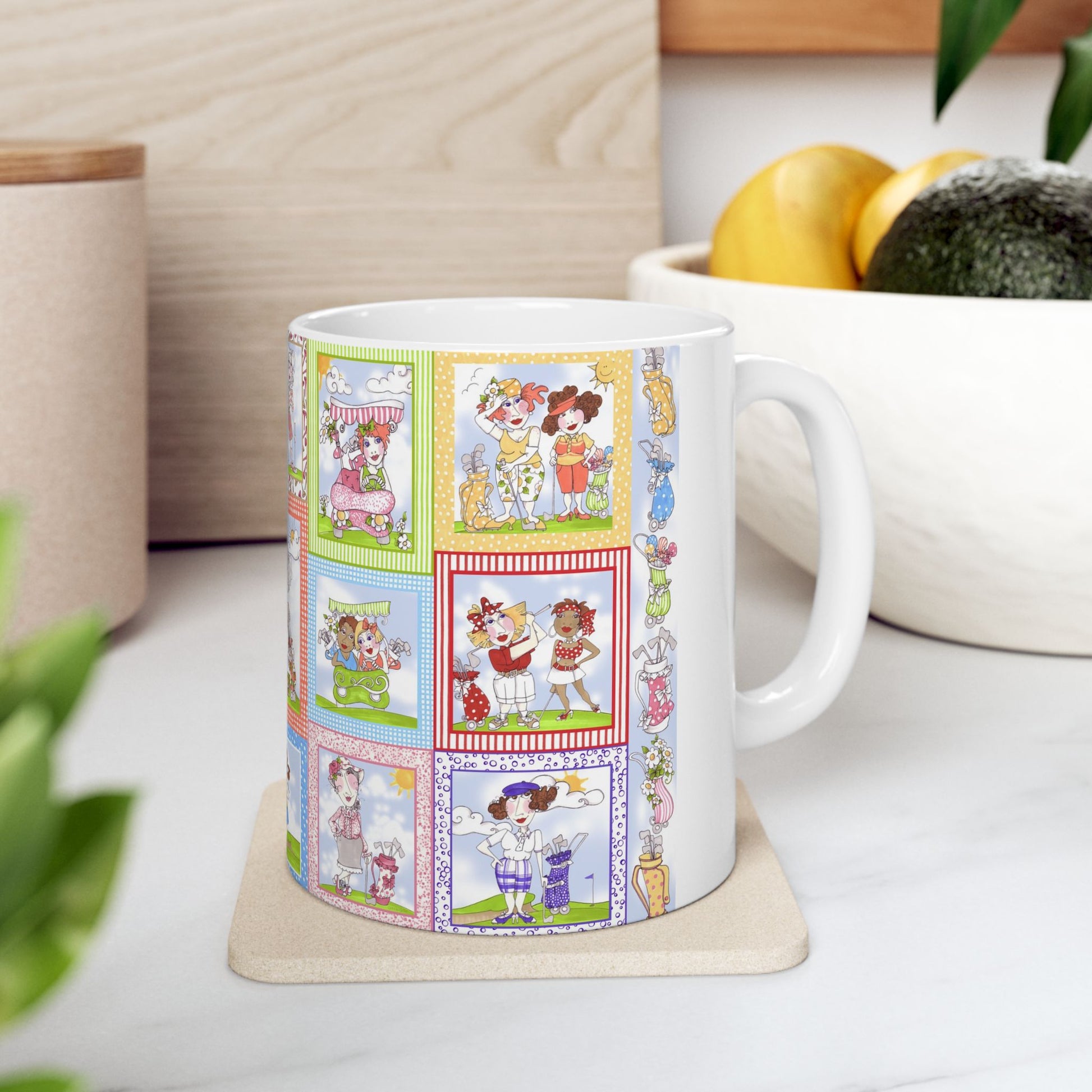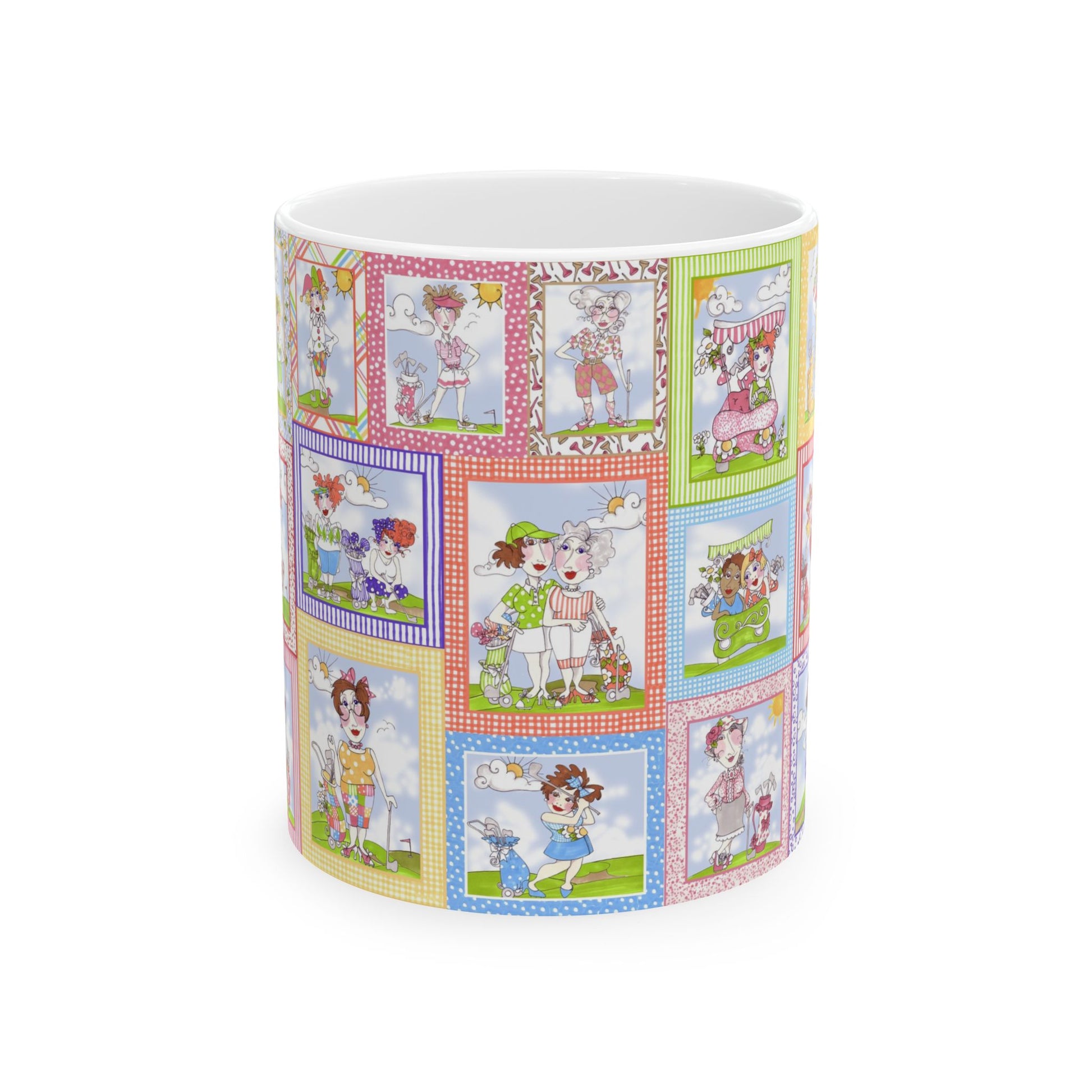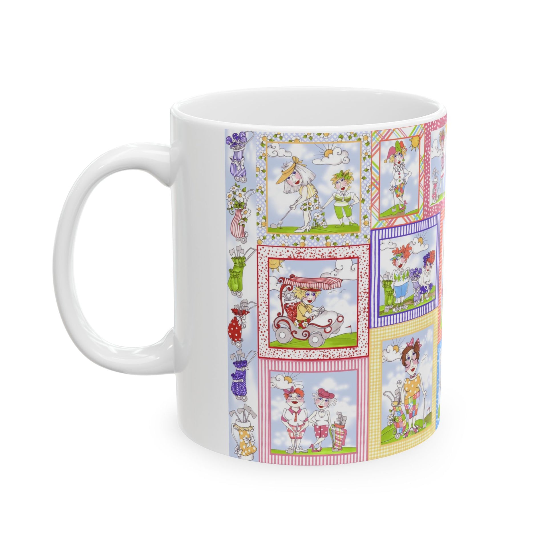 White ceramic 11oz mug with fun, colorful, Loralie sewing ladies enjoying each other's quirky company. Every project is more fun with the perfect Sewing Sisters mug! Makes a great gift!